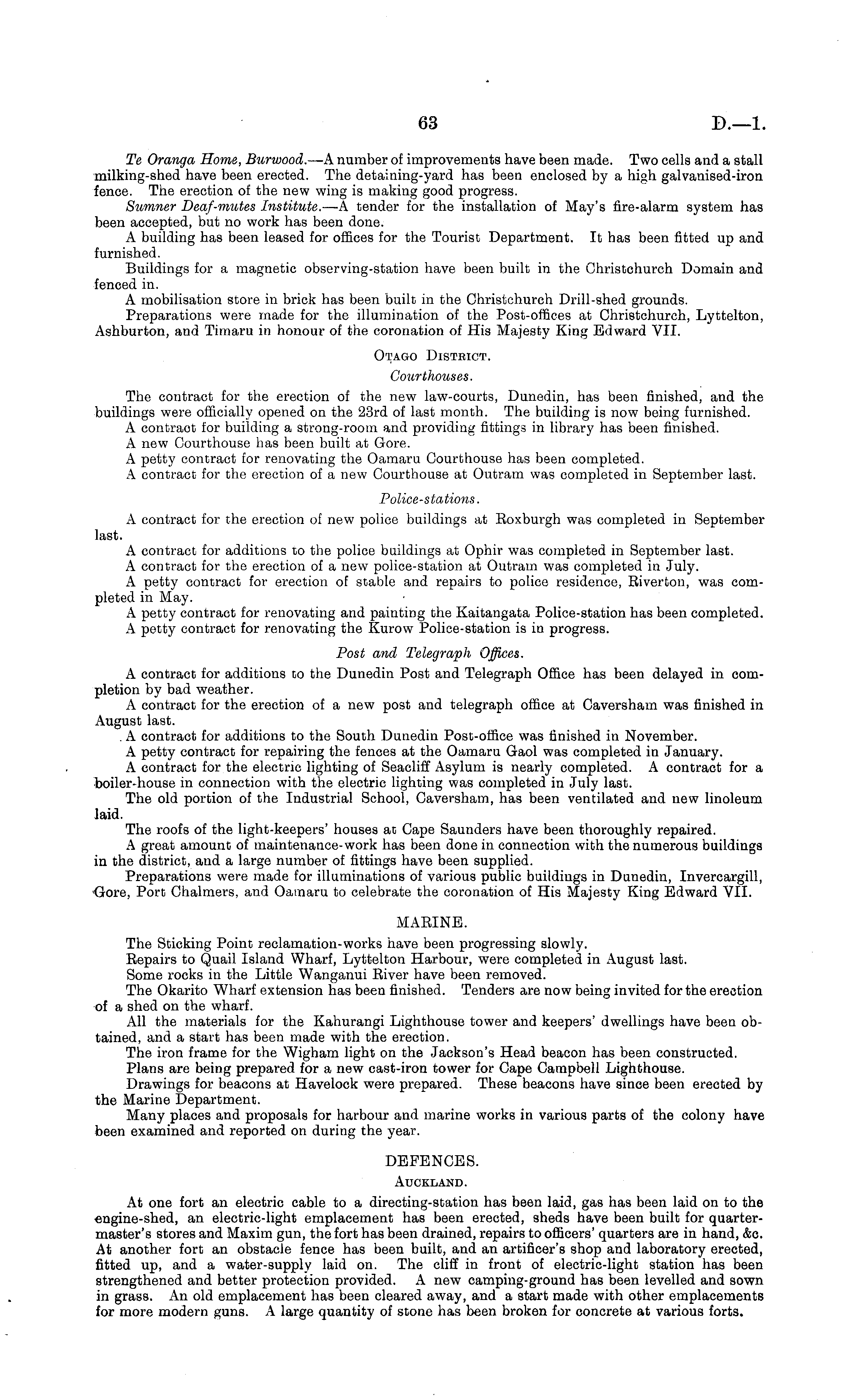 Te Oranga Home, Burwood. —A number of improvements have been made. Two cells and a stall milking-shed have been erected. The detaining-yard has been enclosed by a high galvanised-iron fence. The erection of the new wing is making good progress. Sumner Deaf-mutes Institute. —A tender for the installation of May's fire-alarm system has been accepted, but no work has been done. A building has been leased for offices for the Tourist Department. It has been fitted up and furnished. Buildings for a magnetic observing-station have been built in the Christchurch Domain and fenced in. A mobilisation store in brick has been built in the Christchurch Drill-shed grounds. Preparations were made for the illumination of the Post-offices at Christchurch, Lyttelton, Ashburton, and Timaru in honour of the coronation of His Majesty King Edward VII. Otago District. Courthouses. The contract for the erection of the new law-courts, Dunedin, has been finished, and the buildings were officially opened on the 23rd of last month. The building is now being furnished. A contract for building a strong-room and providing fittings in library has been finished. A new Courthouse has been built at Gore. A petty contract for renovating the Oamaru Courthouse has been completed. A contract for the erection of a new Courthouse at Outram was completed in September last. Police-stations. A contract for the erection of new police buildings at Boxburgh was completed in September last. A contract for additions to the police buildings at Ophir was completed in September last. A contract for the erection of a new police-station at Outram was completed in July. A petty contract for erection of stable and repairs to police residence, Biverton, was completed in May. A petty contract for renovating and painting the Kaitangata Police-station has been completed. A petty contract for renovating the Kurow Police-station is in progress. Post and Telegraph Offices. A contract for additions to the Dunedin Post and Telegraph Office has been delayed in completion by bad weather. A contract for the erection of a new post and telegraph office at Caversham was finished in August last. A contract for additions to the South Dunedin Post-office was finished in November. A petty contract for repairing the fences at the Oamaru Gaol was completed in January. A contract for the electric lighting of Seacliff Asylum is nearly completed. A contract for a boiler-house in connection with the electric lighting was completed in July last. The old portion of the Industrial School, Caversham, has been ventilated and new linoleum laid. The roofs of the light-keepers' houses at Cape Saunders have been thoroughly repaired. A great amount of maintenance-work has been done in connection with the numerous buildings in the district, and a large number of fittings have been supplied. Preparations were made for illuminations of various public buildings in Dunedin, Invercargill, Gore, Port Chalmers, and Oamaru to celebrate the coronation of His Majesty King Edward VII. MABINE. The Sticking Point reclamation-works have been progressing slowly. Bepairs to Quail Island Wharf, Lyttelton Harbour, were completed in August last. Some rocks in the Little Wanganui Biver have been removed. The Okarito Wharf extension has been finished. Tenders are now being invited for the erection of a shed on the wharf. All the materials for the Kahurangi Lighthouse tower and keepers' dwellings have been obtained, and a start has been made with the erection. The iron frame for the Wigham light on the Jackson's Head beacon has been constructed. Plans are being prepared for a new cast-iron tower for Cape Campbell Lighthouse. Drawings for beacons at Havelock were prepared. These beacons have since been erected by the Marine Department. Many places and proposals for harbour and marine works in various parts of the colony have been examined and reported on during the year. DEFENCES. Auckland. At one fort an electric cable to a directing-station has been laid, gas has been laid on to the engine-shed, an electric-light emplacement has been erected, sheds have been built for quartermaster's stores and Maxim gun, the fort has been drained, repairs to officers' quarters are in hand, &c. At another fort an obstacle fence has been built, and an artificer's shop and laboratory erected, fitted up, and a water-supply laid on. The cliff in front of electric-light station has been strengthened and better protection provided. A new camping-ground has been levelled and sown in grass. An old emplacement has been cleared away, and a start made with other emplacements for more modern guns. A large quantity of stone has been broken for concrete at various forts.