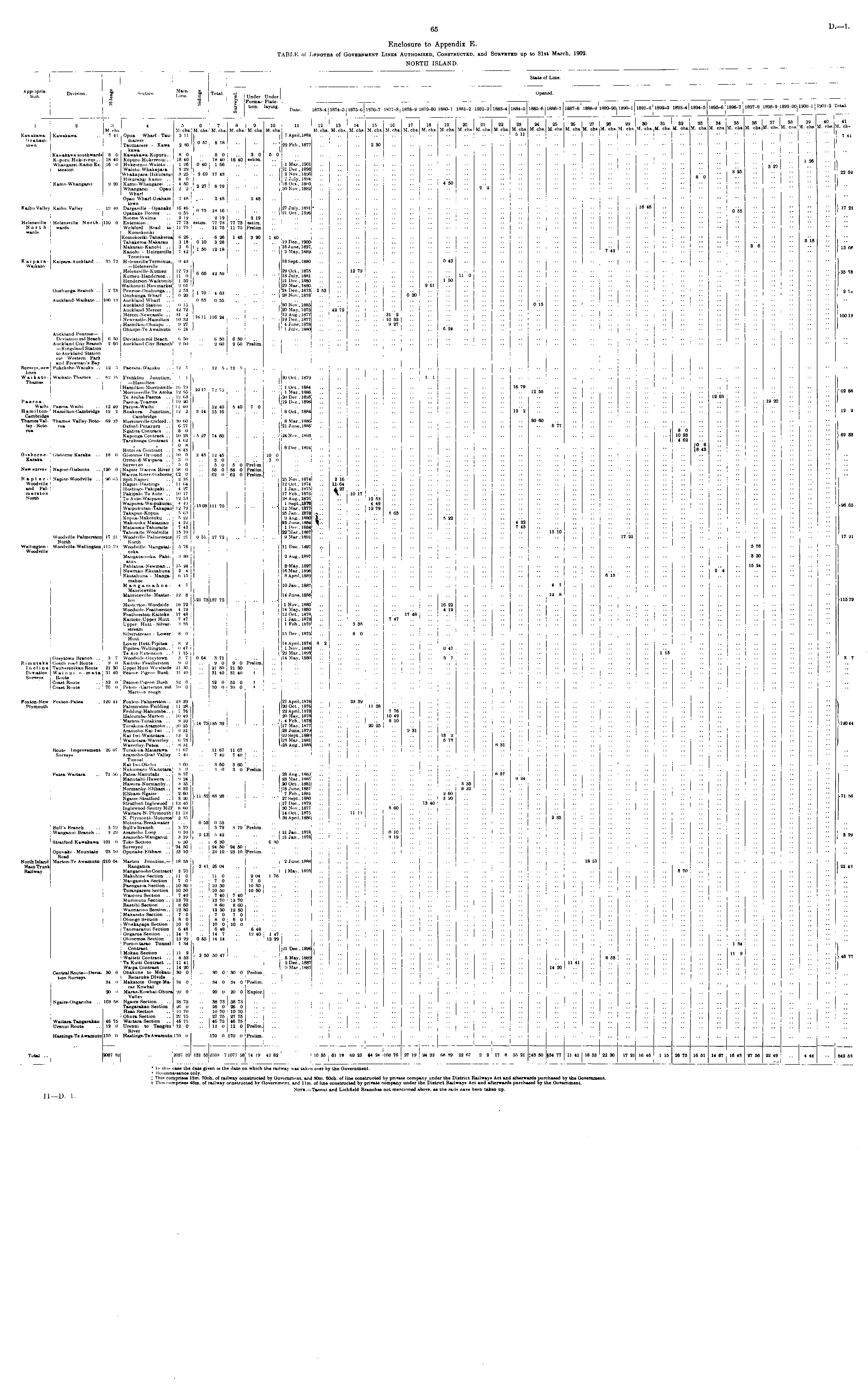 State of Line. Appiopria- Division. | Section ■ Main i a Tota] Opened, tun. ® : .L.me. , _s o Under Under 3 I ffl > Forma- Plate- 1 ___ .——— —— —— —— —■ —— | ti0n ' laymg ' Date. 1873-4 j 1874-5 | L875--G 1876-7 ,1877-8 1878-9 |l879-80 1880-1 1881-2 j 1882-3 1883-4 11884-5 1885-6 11886-7 I ] • I I ■ I i 1 I ' ! i 1 2 3 4 5 6 7 8 9 10 11 12 13 14 15 16 17 18 19 20 21 22 23 24 25 M.chs. M.chs. M.chs. M.chs. M. chs, M.chs. M.chs. M.chs. M. chs. M.chs. M.cha. M.chs. M.chs. M. chs. M.chs. M.chs. M.chs. M.chs. M.chs. M.chs. H. chs. Kawakawa- Kawakawa .. 7 41 Opua Wharf - Tau- 5 11) (7 April,1884 .. : .. .. .. .. .. .. . - ■ ■ ■ ■ - - 5 11 itraiiam- marere I « e~ o io town Taumarere - Kawa- 2 30 " u °' i B La ]22Feb.,1877 .. ! .. .. 2 30 ' kawa ) { Kawakawa southwards 8 0 Kawakawa-Kopuru.. 8 0 .. 8 0 .. 3 0 5 0 .. .. I .. K"pnruHukf«nDi.. 18 40 Kopuru-Hokerenui .. 18 40 .. 18 40 18 40 estim. Whangarei-KamoEx- 16 0 Hukeienni-Waiotu .. 1 26 0 40 1 66 .. .. .. 1 Mar., 1901 tension Waiotu-Whakapara 3 29 ) (21 Dec, 1898 Whakapara-Hikurangi 3 25 - 2 69 17 43 .. .. ,. 2 Nov., 1896 Hikurangi-Kamo .. 8 0 ) ( 2 July, 1894 Kamo-Whangarei 9 20 Kamo-Whangarei 4 50 ) „ 07 „ ,.„ , i 28 Oct., 1880 .. .. .. .. .. -■ .- 4 50 Whangarei - Opan 2 2 ' A *' B ,y i " " \ 30 Nov., 1882 2 2 Wharf Opau Wharf-Graham- 2 48 I , .. 2 48 ! 2 48 town Kaihu Valley! Kaihu Valley .. 19 40 Dargaville - Opanake 16 46 ' n „. 10 ,« I 27 July. 189 > * ■ - Opanake-Booms .. 0 55 )" V ,0 Lb Lb " "' •' 1 21 Oct., 1896 .. .. Booms-Waima .. 2 19 2 19 .. 2 19 Helensville Helensville North- 110 0 Extension.- .. 77 73 estim. 77 73 77 73 estim. North- wards Welsford Road to 11 75 .. 11 75 11 75 Prelim, wards Komokoriki Komokoriki-Tahakeroa 6 26 .. 6 26 1 46 3 20 1 40 Tahakeroa-Makarau 3 18 0 10 3 28 .. .. .. 19 Dec, 1900 Makarau-Kanohi 3 6 ) . .„ _ „ I 16 J une, 1897 Kanohi - Helensville 7 42 J" w 1J JS " " ■•} 3 May, 1889 Terminus Kaipara- Kaipara-Auckland .. 35 73 HslensvilleTerminus, 0 43 '. / 18Sept.,1880 .. .. .. .. .. .. .. 0 43 Waikato —Helensville Helensville-Kumeu 12 79 „ „-.;,„ , Q I 29 Oct., 1875 .. .. 12 79 Kumeu-Henderson.. 11 0 b b0 | iz 5y 1 18 July, 1881 11 0 Hendcrson-Waikomiti 1 50 [21 Dee., 1880 .. .. .. .. .. .. .. 1 50 Waikomiti-Newmarket 9 61 ' 29 Mar., 1880 9 61 Onehunga Branch .. 2 73 Penrose-Onehunga 2 53 I , „ n I 24 Dec, 1873 2 53 Onehunga Wharf .. 0 20 f wu ; " M "j 28 Nov., 1878 .. .. 0 20 Auckland-Waikato .. 100 13 Auckland Wharf .. 0 55 ' 0 55 Auckland Station .. 0 15 \ , 30 Nov., 1885 .. .. .. .. .. .. ■ .. .- .- .. .- -■ 0 15 Auckland-Mercer .. 42 72 20 May, 1875 42 72 Mercer-Newcastle .. 31 2 I,.... L_ .. ; 13 Aug., 1877 .. .. .. .. 31 2 .. .. .. I .. .. .. .- ' Newcastle-Hamilton 10 33 ( | iIb 24 " " ! " 1 19 Dec., 1877 10 33 I ■■ Hamilton-Ohaupo 9 27 14 June, 1878 .. .. .. .. 9 27 .. .. .. . - -. .. .. I .. Ohaupo-Tc Awamutu 6 24 ) \ 1 July, 1880 .... .. .. .. .. .. 6 24 | .. Auckland- Penrose— Deviation vu> Beach 6 50 Deviation rio Reach (J 50 .. 6 50 6 50 .. .. .. .. .. .. I Auckland City Branch 2 60 Auckland City Branch 2 60 .. 2 60 2 00 Prelim. .. .. .. .. .. ! —Kingsland Station to Auckland Station via Western Park and Freeman's Bay Surveys, new Pukekohe-Waiuku .. 19 5 Paerata-Waiuku .. 12 5 .. 12 5 12 5 lines Waikato- Waikato Thames .. 62 58 Fr&nttCfl) Junction, I 1 \ / 20 Oct., 1879 .. .. .. .. .. ..11 Thames —Hamilton Hamilton-Morrinsviik 16 79 .„„ „ „_ ■ 1 Oct., 1884: 16 79 Moninsville-Te Aroha 12 55 '" IJ " " " ' 1 Mar., 1886: .. .. .. .. .. .. .. .. .. .. -. -. .12 55 Te Aroha-Paeroa .. 12 63 I 20 Dec, 1895 .. .. .. .. .. .. .. .. .. -■ .. .. .. .. Paeroa- Paema-Tliames .. 19 20 } 19 D*-c, 1898 Waihi Paeroa Waihi .. 12 40 Paeroa-Waihi ..1240 .. 12 40 5 40 70 .. .. .. .. ■ - .. .. ■ - ■. .. ■ ■ - • • ■ - - Hamilton- Kami Ron-Cam bridge 12 2 Ruakura Junction, 12 2 3 14 15 16 .. .. .. 8 Oct., 1884 .. .. .. .. .. .. .. .. .. .. .. 12 2 .. Cambridge —Cambridge rhamesVal- Thames Valley-Roto- 69 83 Mon-iusvi lie-Oxford.. 30 60 . , 8 Mar.,1886 .. .. .. .. .. .. .. .. -■ -- -■ ■- 30 60 ley-Roto- ma Oxford-Putaruru ..677 ■ | 21 June, 1886 677 rua Ngatira Contract .. 8 0 [ Kaponga Contract .. 10 23 ,- 5 27 74 60 .. .. .. -1 2*Nov., 1893 .. .. .. .. .. .. .. .. .. .. .. - - .. , .. Tarukenga Contract 4 62 I L, . " r. ' . 2 aI \ 8 Dec, 1894 .. .. .. .. .. .. .. .. .. .. .. .- .... I Rotorua Contract S 43 1 \ ' Gisborne- Gisborne-Karaka 18 0 I Gisborne-Or'nond .. 10 0 2 45 12 45 .. .. 10 0 .. .- -■ .. ■- .. .. -- •• -- •■ ■- | Karaka ' Ormond-Waipaoa ..30 .. 30 .. .. 30 Surveyed .. ..5 0 .. 50 50 Prelim. Kewsurvev Napier-Gisborne .. 120 0 Napier Wairoa River 58 0 .. 58 0 58 0 Prelim. WairoaRiver-Gisborne C2 0 .. 62 0 62 0 Prelim. Napier- Napier-Woodville .. 96 65 Spit-Napier 2 16 1 25 Nov., 1874 .. 2 16 Woodville Napn > 1'asiings .. 1164 12 Oct., 1874 .. 1164 and Pal- Hastings-Pakipaki 4 27 1 Jan., 1875 .. 4 27 merston Pakipaki-Te Aute .. 10 17 17 Feb., 1876 .. ■.. 10 17 .. North '!',- Aute-Waipawa .. 12 53 28 Aug., 1876 .. .. .. 12 53 Waipawa-Waipukurau 4 49 .. m ... „. J 1 Sept.,1876 .. .. .. 4 49 Waipukurau-Takapau 12 79 ( iDva LLl ,u •■ " " "1 12 Mar., 1877 12 79 .. Takapau-Kopua .. 5 63 25 Jan.. 1878 ... .. .. .. 5 63 Kopua-Makotuku .. 5 22 9 Aug., 1880 .. .. .. .. .. .. .. 5 22 Makotuku-Matamau 4 22 23 June,1884 •.. .. .. .. .. .. .- .. .. .. .. 4 22 Matainau-Tahoraite 7 43 11 »ee., 1S84 .. .. .. .. .. .. .. .. .. .. .. 7 43 .. .. Tahoiaite-Woodville 15 10 j 22'Mar.,1887 - '15 10 : Woodville-Palmerston 17 21 Woodvilli'-Palmerston 17 21 0 51 17 72 j .. .. .. 9 Mar., 1891 North North Wellington- v7oodville-Wellington 115 7'.t Woodville- Mangatai- 5 76 j f 11 Dec. 1897 Woodville noka Mangatainoka - Pahi- 3 30 2 Aug., 1897 PahiatiiaNewman.. 15 24 3 Mav, 1897 Newman-Eketahuna 2 4 16 Mar., 1896 Eketahuna - Manga- 6 15 8 April,1889 .. mahoc Manga mahoe- 1 4 7 10