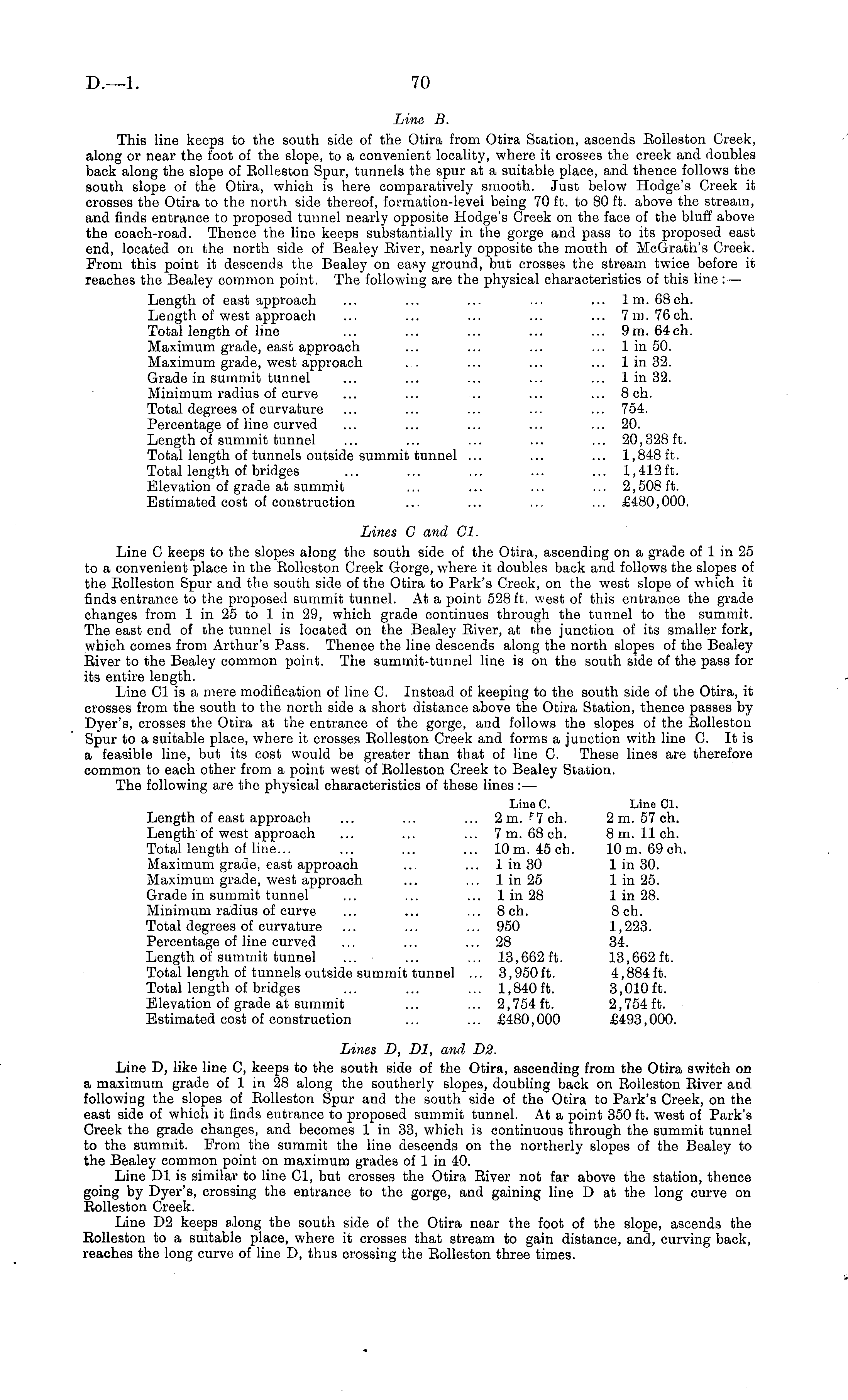 Line B. This line keeps to the south side of the Otira from Otira Station, ascends Bolleston Creek, along or near the foot of the slope, to a convenient locality, where it crosses the creek and doubles back along the slope of Bolleston Spur, tunnels the spur at a suitable place, and thence follows the south slope of the Otira, which is here comparatively smooth. Just below Hodge's Creek it crosses the Otira to the north side thereof, formation-level being 70 ft. to 80 ft. above the stream, and finds entrance to proposed tunnel nearly opposite Hodge's Creek on the face of the bluff above, the coach-road. Thence the line keeps substantially in the gorge and pass to its proposed east end, located on the north side of Bealey Biver, nearly opposite the mouth of McGrath's Creek. From this point it descends the Bealey on easy ground, but crosses the stream twice before it reaches the Bealey common point. The following are the physical characteristics of this line : — Length of east approach ... ... ... ... ... Im. 68 eh. Length of west approach ... ... ... ... ... 7m. 76ch. Total length of line ... ... ... ... ... 9m. 64ch. Maximum grade, east approach ... ... ... ... lin 50. Maximum grade, west approach ... ... ... ... lin 32. Grade in summit tunnel ... ... ... ... ... lin 32. Minimum radius of curve ... ... .. ... ... 8 eh. Total degrees of curvature ... ... ... ... ... 754. Percentage of line curved ... ... ... ... ... 20. Length of summit tunnel ... ... ... ... ... 20,328 ft. Total length of tunnels outside summit tunnel ... ... ... 1,848 ft. Total length of bridges ... ... ... ... ... 1,412 ft. Elevation of grade at summit ... ... ... ... 2,508 ft. Estimated cost of construction ... ... ... ... £480,000. Lines C and CI. Line C keeps to the slopes along the south side of the Otira, ascending on a grade of 1 in 25 to a convenient place in the Bolleston Creek Gorge, where it doubles back and follows the slopes of the Bolleston Spur and the south side of the Otira to Park's Creek, on the west slope of which it finds entrance to the proposed summit tunnel. At a point 528 ft. west of this entrance the grade changes from 1 in 25 to 1 in 29, which grade continues through the tunnel to the summit. The east end of the tunnel is located on the Bealey Biver, at the junction of its smaller fork, which comes from Arthur's Pass. Thence the line descends along the north slopes of the Bealey Biver to the Bealey common point. The summit-tunnel line is on the south side of the pass for its entire length. Line CI is a mere modification of line C. Instead of keeping to the south side of the Otira, it crosses from the south to the north side a short distance above the Otira Station, thence passes by Dyer's, crosses the Otira at the entrance of the gorge, and follows the slopes of the Bolleston Spur to a suitable place, where it crosses Bolleston Creek and forms a junction with line C. It is a feasible line, but its cost would be greater than that of line C. These lines are therefore common to each other from a point west of Bolleston Creek to Bealey Station. The following are the physical characteristics of these lines : — Line C. Line CI. Length of east approach ... ... ... 2m. ?7ch. 2m. 57 eh. Length of west approach ... ... ... 7m. 68 eh. Bm. 11 eh. Total length of line... ... ... ... 10 m. 45 eh. 10 m. 69 eh. Maximum grade, east approach ... ... lin 30 lin 30. Maximum grade, west approach ... ... lin 25 lin 25. Grade in summit tunnel ... ... ... lin 28 lin 28. Minimum radius of curve ... ... ... Bch. Bch. Total degrees of curvature ... ... ... 950 1,223. Percentage of line curved ... ... ... 28 34. Length of summit tunnel ... ... ... 13,662 ft. 13,662 ft. Total length of tunnels outside summit tunnel ... 3,950 ft. 4,884 ft. Total length of bridges ... ... ... 1,840 ft. 3,010 ft. Elevation of grade at summit ... ... 2,754 ft. 2,754 ft. Estimated cost of construction ... ... £480,000 £493,000. Lines D, Dl, and D 2. Line D, like line C, keeps to the south side of the Otira, ascending from the Otira switch on a maximum grade of 1 in 28 along the southerly slopes, doubling back on Bolleston Biver and following the slopes of Bolleston Spur and the south side of the Otira to Park's Creek, on the east side of which it finds entrance to proposed summit tunnel. At a point 350 ft. west of Park's Creek the grade changes, and becomes 1 in 33, which is continuous through the summit tunnel to the summit. From the summit the line descends on the northerly slopes of the Bealey to the Bealey common point on maximum grades of 1 in 40. Line Dl is similar to line CI, but crosses the Otira Biver not far above the station, thence going by Dyer's, crossing the entrance to the gorge, and gaining line D at the long curve on Bolleston Creek. Line D 2 keeps along the south side of the Otira near the foot of the slope, ascends the Bolleston to a suitable place, where it crosses that stream to gain distance, and, curving back, reaches the long curve of line D, thus crossing the Bolleston three times.