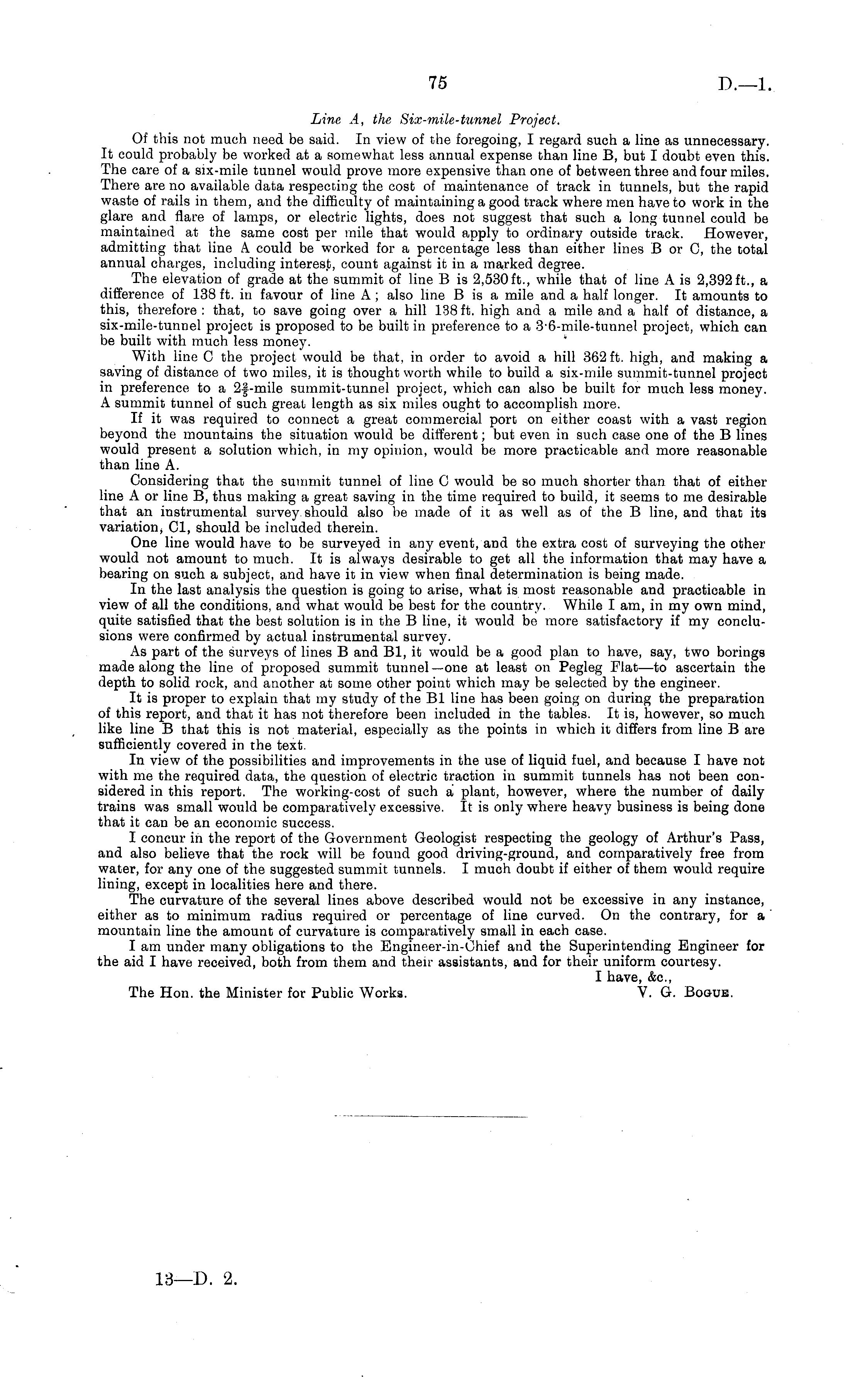 Line A, the Six-mile-tunnel Project. Of this not much need be said. In view of the foregoing, I regard such a line as unnecessary. It could probably be worked at a somewhat less annual expense than line B, but I doubt even this. The care of a six-mile tunnel would prove more expensive than one of between three and four miles. There are no available data respecting the cost of maintenance of track in tunnels, but the rapid waste of rails in them, and the difficulty of maintaining a good track where men have to work in the glare and flare of lamps, or electric lights, does not suggest that such a long tunnel could be maintained at the same cost per mile that would apply to ordinary outside track. However, admitting that line A. could be worked for a percentage less than either lines B or C, the total annual charges, including interest, count against it in a marked degree. The elevation of grade at the summit of line B is 2,530 ft., while that of line A is 2,392 ft., a difference of 138 ft. in favour of line A ; also line B is a mile and a half longer. It amounts to this, therefore : that, to save going over a hill 138 ft. high and a mile and a half of distance, a six-mile-tunnel project is proposed to be built in preference to a 3-6-mile-tunnel project, which can be built with much less money. With line C the project would be that, in order to avoid a hill 362 ft. high, and making a saving of distance of two miles, it is thought worth while to build a six-mile summit-tunnel project in preference to a 2|-mile summit-tunnel project, which can also be built for much less money. A summit tunnel of such great length as six miles ought to accomplish more. If it was required to connect a great commercial port on either coast with a vast region beyond the mountains the situation would be different; but even in such case one of the B lines would present a solution which, in my opinion, would be more practicable and more reasonable than line A. Considering that the summit tunnel of line C would be so much shorter than that of either line A or line B, thus making a great saving in the time required to build, it seems to me desirable that an instrumental survey should also be made of it as well as of the B line, and that its variation, CI, should be included therein. One line would have to be surveyed in any event, and the extra cost of surveying the other would not amount to much. It is always desirable to get all the information that may have a bearing on such a subject, and have it in view when final determination is being made. In the last analysis the question is going to arise, what is most reasonable and practicable in view of all the conditions, and what would be best for the country. While I am, in my own mind, quite satisfied that the best solution is in the B line, it would be more satisfactory if my conclusions were confirmed by actual instrumental survey. As part of the surveys of lines B and 81, it would be a good plan to have, say, two borings made along the line of proposed summit tunnel—one at least on Pegleg Flat—to ascertain the depth to solid rock, and another at some other point which may be selected by the engineer. It is proper to explain that my study of the Bl line has been going on during the preparation of this report, and that it has not therefore been included in the tables. It is, however, so much like line B that this is not material, especially as the points in which it differs from line B are sufficiently covered in the text. In view of the possibilities and improvements in the use of liquid fuel, and because I have not with me the required data, the question of electric traction in summit tunnels has not been considered in this report. The working-cost of such a plant, however, where the number of daily trains was small would be comparatively excessive. It is only where heavy business is being done that it can be an economic success. I concur in the report of the Government Geologist respecting the geology of Arthur's Pass, and also believe that the rock will be found good driving-ground, and comparatively free from water, for any one of the suggested summit tunnels. I much doubt if either of them would require lining, except in localities here and there. The curvature of the several lines above described would not be excessive in any instance, either as to minimum radius required or percentage of line curved. On the contrary, for a mountain line the amount of curvature is comparatively small in each case. I am under many obligations to the Engineer-in-Chief and the Superintending Engineer for the aid I have received, both from them and their assistants, and for their uniform courtesy. I have, &c, The Hon. the Minister for Public Works. V. G. Bogue.