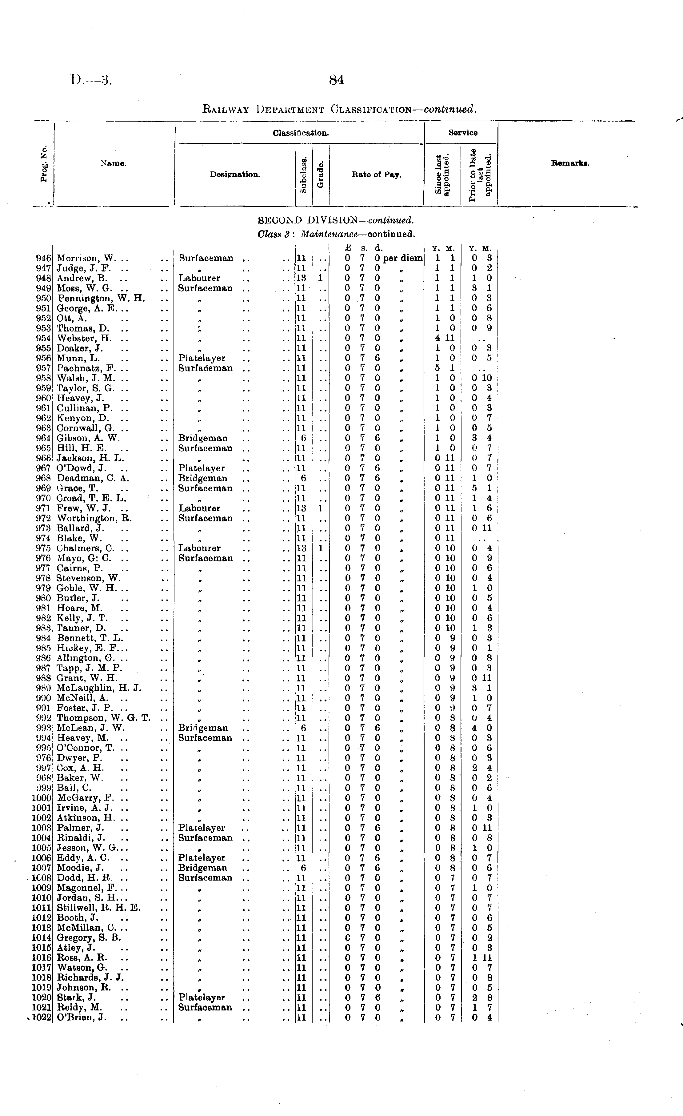 Classi itical iion. Service c iz ob o ft £ Name. Designation. CO Efl d x 0 X CD 03 cd 0 Rate of Pay. a! Ti t£ Ti ©.9 °^.S O O * J «8 o 3 9 i 9 a Remarks. SECON >1V. .SION— continued. Class 3 : ivnti '.nance —continued. 946 947 948 949 950 951 952 953 954 955 956 957 958 959 960 961 962 963 964 965 966 967 968 969 970 971 972 973 974 975 976 977 978 979 980 981 982 983 984 985 986 987 988! 980 990 991 992 993 994 995 976 997 968 999 1000, 1001 1002 1003 1004 1005 1006 1007 IC08 1009 1010 1011 1012 1013 1014 1015 1016 1017 1018 1019 1020 1021 1022 Morrison, W. .. Judge, J. F. .. Andrew, B. .. Moss, W. G. .. Pennington, W. H. George, A. E. .. Ott, A. Thomas, D. .. Webster, H. .. Deaker, J. Munn, L. Pachnatz, F. .. Walsh, J. M. .. Taylor, S. G. .. Heavey, J. Cullman, P. .. Kenyon,D. .. Cornwall, G. .. Gibson, A. W. Hill, H. E. .. Jackson, H. L. O'Dowd, J. .. Deadman, C. A. Grace, T. Croad, T. E. L. Frew, W. J. .. Worthington, R. Ballard, J. Blake, W. (Jhalmers, C. .. Mayo, G: C. .. Cairns, P. Stevenson, W. Goble, W. H. .. Butler, J. Hoare, M. Kelly, J. T. .. Tanner, D. .. Bennett, T. L. Hickey, E. F... Allington, G. .. Tapp, J. M. P. Grant, W. H. McLaughlin, H. J. McNeill, A. .. Foster, J. P. .. Thompson, W. G. T. McLean, J. W. Heavey, M. .. O'Connor, T. .. Dwyer, P. Cox, A. H. Baker, W. Ball, C. McGarry, F. .. Irvine, A. J. .. Atkinson, H. .. Palmer, J. Rinaldi, J. Jesson, W. G... Eddy, A. C. .. Moodie, J. Dodd, H. R. .. Magonnel, F. .. Jordan, S. H... Stillwell, R. H. E. Booth, J. McMillan, C. .. Gregory, S. B. Atley, J. Ross, A. R. Watson, G. .. Richards, J.J. Johnson, R. .. Stark, J. Reidy, M. O'Brien, J. .. Surfaceman .. Labourer Surfaceman Platelayer Surfaceman .. Bridgeman Surfaceman .. Platelayer Bridgeman Surfaceman .. Labourer Surfaceman .. Labourer Surfaceman .. 11 11 13 11 11 11 11 11 11 11 11 11 11 11 11 11 11 li 6 11 ll 11 6 11 11 13 II 11 11 18 11 11 11 11 11 11 11 11 11 11 11 11 11 11 11 11 11 6 11 11 11 11 11 11 ll 11 11 11 11 11 11 6 11 ll 11 ll 11 11 11 11 11 11 11 11 11 11 ll i 1 £ s. d. 0 7 0 per diem 0 7 0 0 7 0 0 7 0 0 7 0 0 7 0 0 7 0 0 7 0 0 7 0 0 7 0 0 7 6 0 7 0 0 7 0 0 7 0 0 7 0 0 7 0 0 7 0 0 7 0 0 7 6 0 7 0 0 7 0 0 7 6 0 7 6 0 7 0 0 7 0 0 7 0 0 7 0 0 7 0 0 7 0 0 7 0 0 7 0 0 7 0 0 7 0 0 7 0 0 7 0 0 7 0 0 7 0 0 7 0 0 7 0 0 7 0 0 7 0 0 7 0 0 7 0 0 7 0 0 7 0 0 7 0 0 7 0 0 7 6 0 7 0 0 7 0 „ 0 7 0 0 7 0 0 7 0 0 7 0 0 7 0 0 7 0 0 7 0 0 7 6 0 7 0 0 7 0 0 7 6 0 7 6 0 7 0 0 7 0 0 7 0 „ 0 7 0 0 7 0 0 7 0 0 7 0 0 7 0 0 7 0 0 7 0 0 7 0 0 7 0 0 7 6 0 7 0 > 0 7 0 Y. M. 1 1 1 1 1 1 1 1 1 1 1 1 1 0 1 0 4 11 1 0 1 0 5 1 1 0 1 0 1 0 1 0 1 0 1 0 1 0 1 0 0 11 0 11 0 11 0 11 0 11 0 11 0 11 0 11 0 11 0 10 0 10 0 10 0 10 0 10 0 10 0 10 0 10 0 10 0 9 0 9 0 9 0 9 0 9 0 9 0 9 0 9 0 8 0 8 0 8 0 8 0 8 0 8 0 8 0 8 0 8 0 8 0 8 0 8 0 8 0 8 0 8 0 8 0 7 0 7 0 7 0 7 0 7 0 7 0 7 0 7 0 7 0 7 0 7 0 7 0 7 0 7 0 7 Y. M. 0 3 0 2 1 0 3 1 0 3 0 6 0 8 0 9 0 8 0 5 0 10 0 3 0 4 0 3 0 7 0 5 3 4 0 7 0 7 0 7 1 0 5 1 1 4 1 6 0 6 0 11 0 4 0 9 0 6 0 4 1 0 0 5 0 4 0 6 1 3 0 3 0 1 0 8 0 3 0 11 3 1 1 0 0 7 0 4 4 0 0 3 0 6 0 3 2 4 0 2 0 6 0 4 1 0 0 3 0 11 0 8 1 0 0 7 0 6 0 7 1 0 0 7 0 7 0 6 0 5 0 2 0 3 1 11 0 7 0 8 0 5 2 8 1 7 0 4 Bridgeman Surfaceman .. Platelayer Surfaceman .. Platelayer Bridgeman Surfaceman .. Platelayer Surfaceman ..