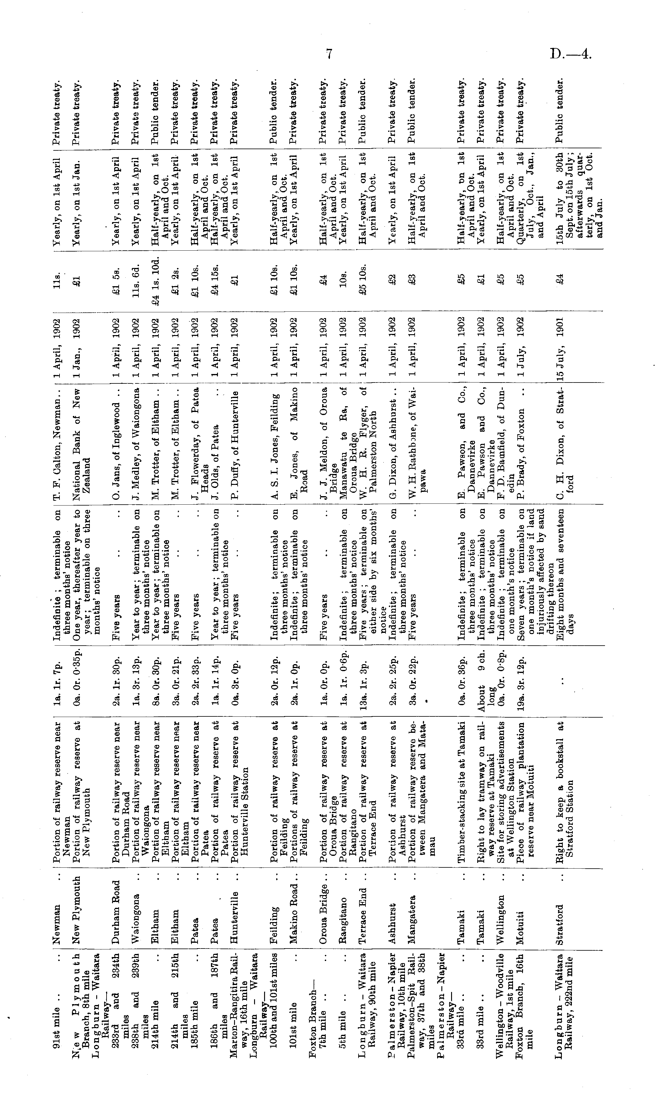 91st mile .. Newman Portion of railway reserve near Newman Portion of railway reserve at New Plymouth la. lr. 7p. Indefinite ; terminable on three months' notice One year, thereafter year to year; terminable on three months' notice T. F. Oalton, Newman.. 1 April, 1902 lis. Yearly, on 1st April Private treaty. N,e w Plymouth Branch, 8th mile Longburn - Waitara Railway — 233rd and 234th miles 238th and 239th miles 214th mile New Plymouth Durham Road Portion of railway reserve near Durham Road Portion of railway reserve near Waiongona Portion of railway reserve near Eltham Portion of railway reserve near Eltham Portion of railway reserve near Patea Portion of railway reserve at Patea Portion of railway reserve at Hunterville Station Oa. Or. 0-35p. 2a. lr. 30p. Five years National Bank of New Zealand 0. Jans, of Inglewood .. 1 Jan., 1902 1 April, 1902 £1 £1 5s. Yearly, on 1st Jan. Yearly, on 1st April Private treaty. Private treaty. Waiongona la. 3r. 13p. Year to year ; terminable on three months' notice Year to year ; terminable on three months' notice Five years J. Medley, of Waiongona 1 April, 1902 lis. 6d. Yearly, on 1st April Private treaty. Eltham 8a. Or. 30p. M. Trotter, of Eltham .. 1 April, 1902 £4 Is. lOd. Half-yearly, on 1st April and Oct. Yearly, on 1st April Public tender. 214th and 215th miles 185th mile Eltham 3a. Or. 21p. M. Trotter, of Eltham .. 1 April, 1902 £1 2s. Private treaty. Patea 2a. 2r. 33p. Five years J. Flowerday, of Patea Heads J. Olds, of Patea 1 April, 1902 £1 10s. Half-yearly, on 1st April and Oct. Half-yearly, on 1st April and Oct. Yearly, on 1st April Private treaty. 186th and 187th miles Marton-Rangitira Railway, 16th mile Longburn - Waitara Railway — 100th and 101st miles Patea la. lr. 14p. Year to year ; terminable on three months' notice Five years 1 April, 1902 £4 15s. Private treaty. Hunterville .. Oa. 3r. Op. P. Duffy, of Hunterville 1 April, 1902 £1 Private treaty. Feilding Portion of railway reserve at Feilding Portions of railway reserve at Feilding 2a. Or. 12p. Indefinite; terminable on three months' notice Indefinite; terminable on three months' notice A. S. I. Jones, Feilding 1 April, 1902 £1 10s. Half-yearly, on 1st April and Oct. Yearly, on 1st April Public tender. 101st mile Makino Road .. 2a. lr. Op. E. Jones, of Makino Road 1 April, 1902 £1 10s. Private treaty. Foxton Branch — 7th mile Oroua Bridge .. Portion of railway reserve at Oroua Bridge Portion of railway reserve at Rangitano Portion of railway reserve at Terrace End la. Or. Op. Five years J. J. Meldon, of Oroua Bridge Manawatu te Ra, of Oroua Bridge W. H. R. Flyger, of Palmerston North 1 April, 1902 £4 Half-yearly, on 1st April and Oct. Yearly, on 1st April Private treaty. 5th mile Rangitano la. lr. 0-6p. Indefinite ; terminable on three months' notice Five years; terminable on either side by six months' notice Indefinite; terminable on three months' notice Five years 1 April, 1902 10s. Private treaty. Longburn - Waitara Railway, 90th mile Terrace End .. 13a. lr. 3p. 1 April, 1902 £5 10s. Half-yearly, on 1st April and Oct. Public tender. Palmerston- Napier Railway, 10th mile Palmerston-Spit Railway, 37th and 38th miles Palmerston- Napier Railway — 33rd mile Ashhurst Portion of railway reserve at Ashhurst Portion of railway reserve between Mangatera and Matamau 2a. 2r. 25p. G. Dixon, of Ashhurst .. 1 April, 1902 £2 Yearly, on 1st April Private treaty. Mangatera 3a. Or. 22p. W.H. Rathbone, of Wai1 April, 1902 £3 Half-yearly, on 1st April and Oct. Public tender. pawa Tamaki Timber-stacking site at Tamaki Oa. Or. 36p. Indefinite; terminable on three months' notice Indefinite ; terminable on three months' notice Indefinite ; terminable on one month's notice Seven years ; terminable on one month's notice if land injuriously affected by sand drifting thereon Eight months and seventeen days E. Pawson, and Co., Dannevirke E. Pawson and Co., Dannevirke F. D. Bamfield, of Dunedin P. Brady, of Foxton 1 April, 1902 £5 Half-yearly, on 1st April and Oct. Yearly, on 1st April Private treaty. 33rd mile Tamaki Right to lay tramway on railway reserve at Tamaki Site for storing advertisements at Wellington Station Pieoe of railway plantation reserve near Motuiti About 9 ch. long Oa. Or. 0-8p. 1 April, 1902 £1 Private treaty. Wellington - Woodville Railway, 1st mile Foxton Branch, 16th mile Wellington Motuiti 19a. 3r. 12p. 1 April, 1902 1 July, 1902 £5 £5 Half-yearly, on 1st April and Oct. Quarterly, on 1st July, Oct., Jan., and April Private treaty. Private treaty. Longburn - Waitara Railway, 222nd mile Stratford Right to keep a bookstall at Stratford Station C. H. Dixon, of Stratford 15 July, 1901 £4 15th July to 30th Sept. on 15th July ; afterwards quarterly, on 1st Oct. and Jan. Public tender.