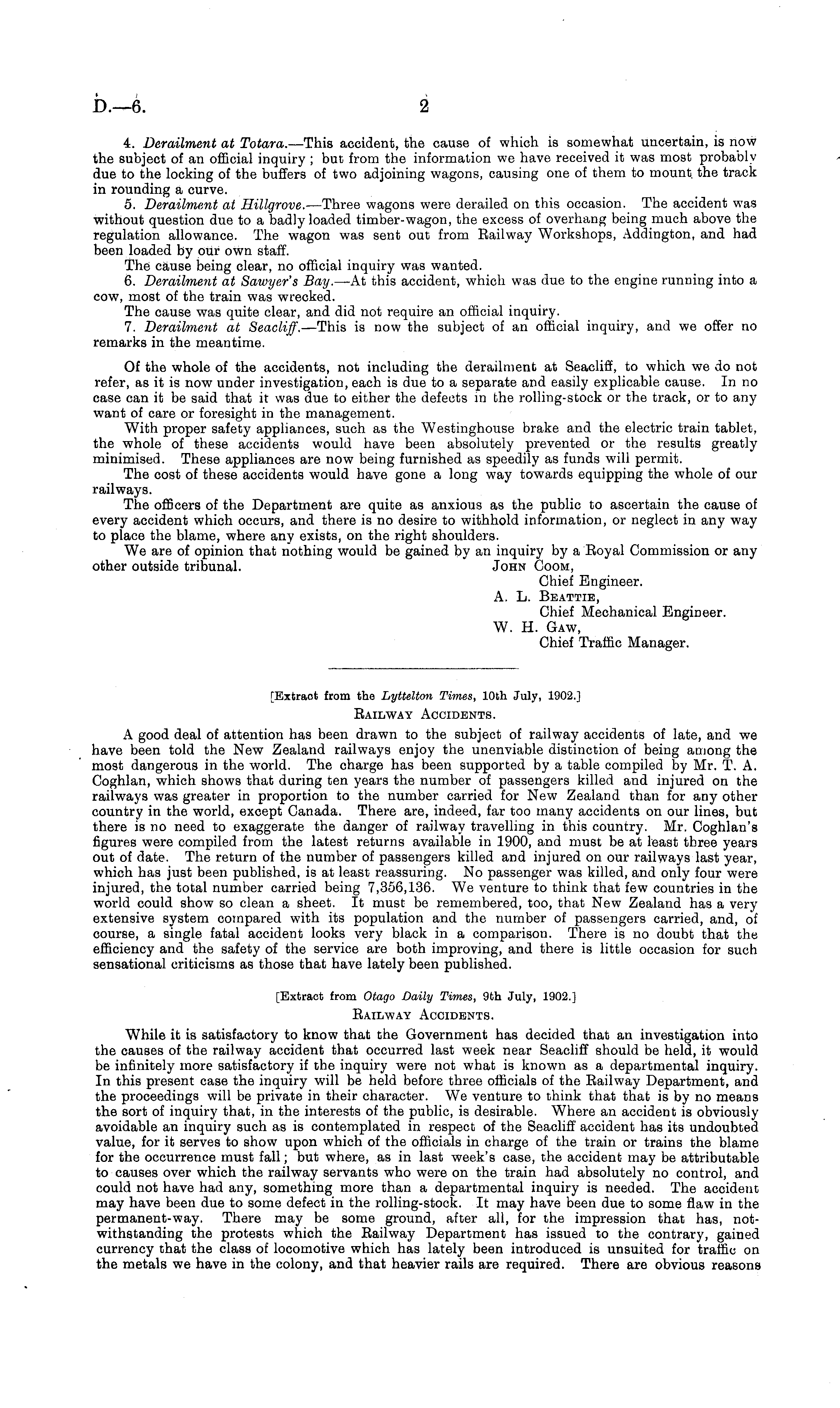 [Extract from the Lyttelton Times, 10th July, 1902.] Railway Accidents. A good deal of attention has been drawn to the subject of railway accidents of late, and we have been told the New Zealand railways enjoy the unenviable distinction of being among the most dangerous in the world. The charge has been supported by a table compiled by Mr. T. A. Coghlan, which shows that during ten years the number of passengers killed and injured on the railways was greater in proportion to the number carried for New Zealand than for any other country in the world, except Canada. There are, indeed, far too many accidents on our lines, but there is no need to exaggerate the danger of railway travelling in this country. Mr. Coghlan's figures were compiled from the latest returns available in 1900, and must be at least three years out of date. The return of the number of passengers killed and injured on our railways last year, which has just been published, is at least reassuring. No passenger was killed, and only four were injured, the total number carried being 7,356,136. We venture to think that few countries in the world could show so clean a sheet. It must be remembered, too, that New Zealand has a very extensive system compared with its population and the number of passengers carried, and, of course, a single fatal accident looks very black in a comparison. There is no doubt that the efficiency and the safety of the service are both improving, and there is little occasion for such sensational criticisms as those that have lately been published. [Extract from Otago Daily Times, 9th July, 1902.] Railway Accidents. While it is satisfactory to know that the Government has decided that an investigation into the causes of the railway accident that occurred last week near Seacliff should be held, it would be infinitely more satisfactory if the inquiry were not what is known as a departmental inquiry. In this present case the inquiry will be held before three officials of the Railway Department, and the proceedings will be private in their character. We venture to think that that is by no means the sort of inquiry that, in the interests of the public, is desirable. Where an accident is obviously avoidable an inquiry such as is contemplated in respect of the Seacliff accident has its undoubted value, for it serves to show upon which of the officials in charge of the train or trains the blame for the occurrence must fall; but where, as in last week's case, the accident may be attributable to causes over which the railway servants who were on the train had absolutely no control, and could not have had any, something more than a departmental inquiry is needed. The accident may have been due to some defect in the rolling-stock. It may have been due to some flaw in the permanent-way. There may be some ground, after all, for the impression that has, notwithstanding the protests which the Railway Department has issued to the contrary, gained currency that the class of locomotive which has lately been introduced is unsuited for traffic on the metals we have in the colony, and that heavier rails are required. There are obvious reasons