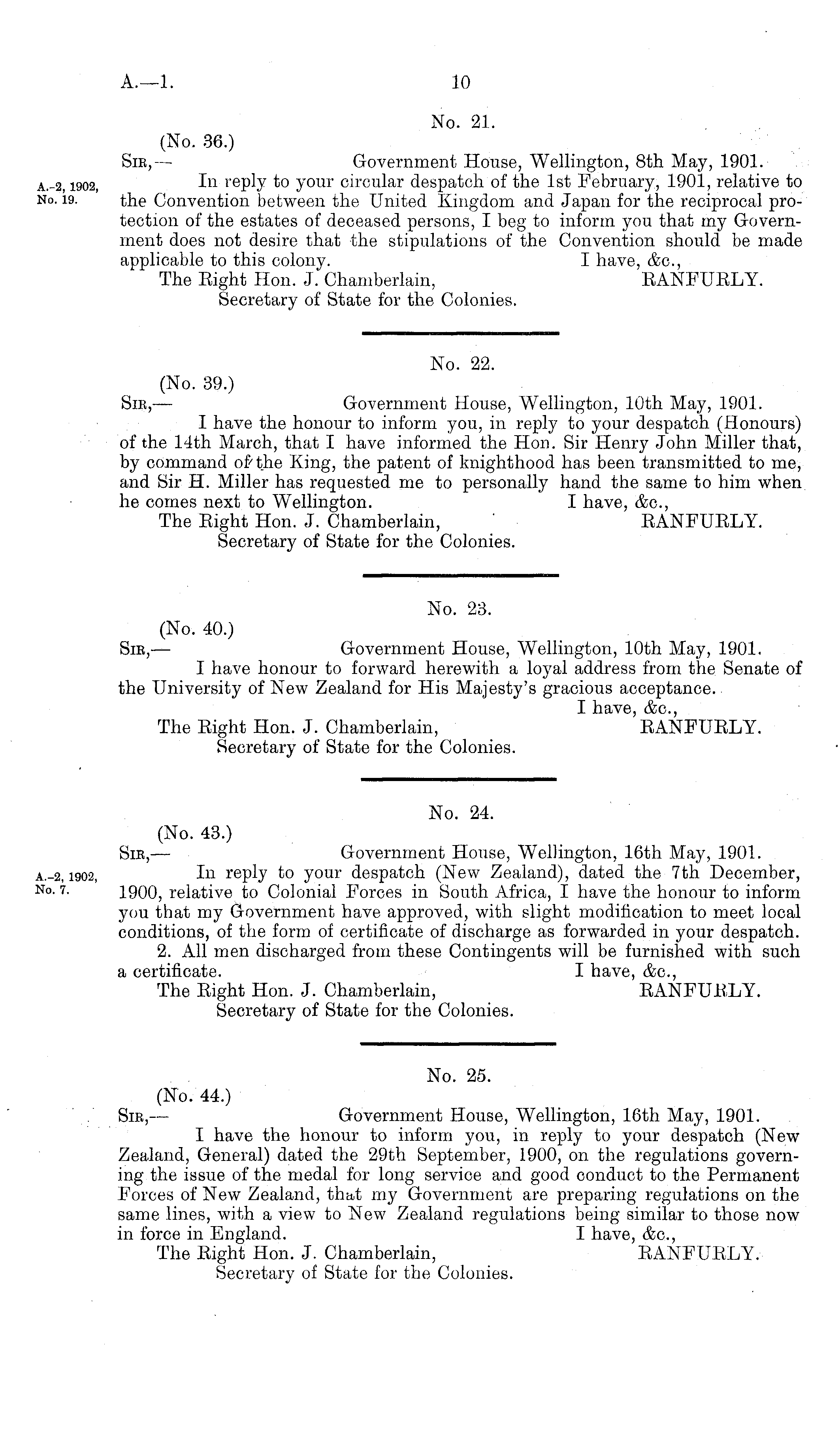 No. 22. (No. 39.) Sir, — Government House, Wellington, 10th May, 1901. I have the honour to inform you, in reply to your despatch (Honours) of the 14th March, that I have informed the Hon. Sir Henry John Miller that, by command of'the King, the patent of knighthood has been transmitted to me, and Sir H. Miller has requested me to personally hand the same to him when he comes next to Wellington. I have, &c, The Eight Hon. J. Chamberlain, EANFUELY. Secretary of State for the Colonies.