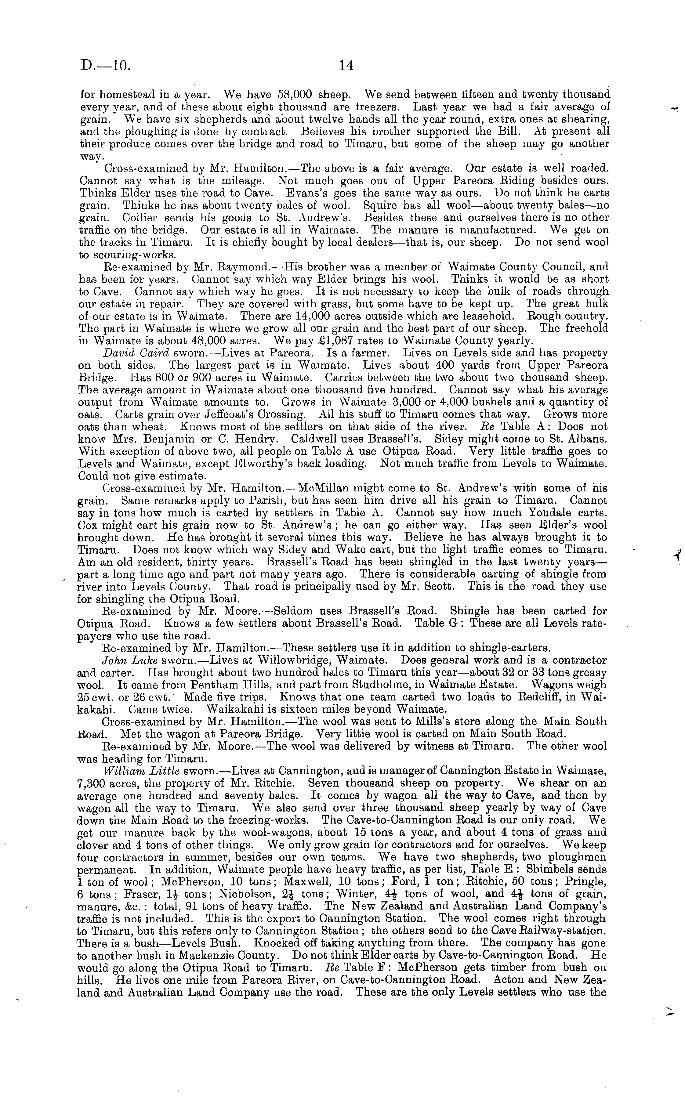 for homestead in a year. We have 58,000 sheep. We send between fifteen and twenty thousand every year, and of these about eight thousand are freezers. Last year we had a fair average of grain. We have six shepherds and about twelve hands all the year round, extra ones at shearing, and the ploughing is done by contract. Believes his brother supported the Bill. At present all their produce comes over the bridge and road to Timaru, but some of the sheep may go another way. Cross-examined by Mr. Hamilton.—The above is a fair average. Our estate is well roaded. Cannot say what is the mileage. Not much goes out of Upper Pareora Eiding besides ours. Thinks Elder uses the road to Cave. Evans's goes the same way as ours. Do not think he carts grain. Thinks he has about twenty bales of wool. Squire has all wool—about twenty bales—no grain. Collier sends his goods to St. Andrew's. Besides these and ourselves there is no other traffic on the bridge. Our estate is all in Waimate. The manure is manufactured. We get on the tracks in Timaru. It is chiefly bought by local dealers—that is, our sheep. Do not send wool to scouring-works. Ec-examined by Mr. Eaymond.—His brother was a member of Waimate County Council, and has been for years. Cannot say which way Elder brings his wool. Thinks it would be as short to Cave. Cannot say which way he goes. It is not necessary to keep the bulk of roads through our estate in repair. They are covered with grass, but some have to be kept up. The great bulk of our estate is in Waimate. There are 14,000 acres outside which are leasehold. Eough country. The part in Waimate is where we grow all our grain and the best part of our sheep. The freehold in Waimate is about 48,000 acres. We pay £1,087 rates to Waimate County yearly. David Caird sworn.—Lives at Pareora. Is a farmer. Lives on Levels side and has property on both sides. The largest part is in Waimate. Lives about 400 yards from Upper Pareora Bridge. Has 800 or 900 acres in Waimate. Carries between the two about two thousand sheep. The average amount in Waimate about one thousand five hundred. Cannot say what his average output from Waimate amounts to. Grows in Waimate 3,000 or 4,000 bushels and a quantity of oats. Carts grain over Jeffcoat's Crossing. All his stuff to Timaru comes that way. Grows more oats than wheat. Knows most of the settlers on that side of the river. Re Table A: Does not know Mrs. Benjamin or C. Hendry. Caldwell uses Brassell's. Sidey might come to St. Albans. With exception of above two, all people on Table A use Otipua Eoad. Very little traffic goes to Levels and Waimate, except Elworthy's back loading. Not much traffic from Levels to Waimate. Could not give estimate. Cross-examined by Mr. Hamilton.—McMillan might come to St. Andrew's with some of his grain. Same remarks apply to Parish, but has seen him drive all his grain to Timaru. Cannot say in tons how much is carted by settlers in Table A. Cannot say how much Youdale carts. Cox might cart his grain now to St. Andrew's ; he can go either way. Has seen Elder's wool brought down. He has brought it several times this way. Believe he has always brought it to Timaru. Does not know which way Sidey and Wake cart, but the light traffic comes to Timaru. Am an old resident, thirty years. Brassell's Eoad has been shingled in the last twenty years— part a long time ago and part not many years ago. There is considerable carting of shingle from river into Levels County. That road is principally used by Mr. Scott. This is the road they use for shingling the Otipua Eoad. Ec-examined by Mr. Moore. —Seldom uses Brassell's Eoad. Shingle has been carted for Otipua Eoad. Knows a few settlers about Brassell's Eoad. Table G : These are all Levels ratepayers who use the road. Ec-examined by Mr. Hamilton. —These settlers use it in addition to shingle-carters. John Luke sworn.—Lives at Willowbridge, Waimate. Does general work and is a contractor and carter. Has brought about two hundred bales to Timaru this year—about 32 or 33 tons greasy wool. It came from Pentham Hills, and part from Studholme, in Waimate Estate. Wagons weigh 25cwt. or 26cwt. Made five trips. Knows that one team carted two loads to Eedcliff, in Waikakahi. Came twice. Waikakahi is sixteen miles beyond Waimate. Cross-examined by Mr. Hamilton.—The wool was sent to Mills's store along the Main South Eoad. Met the wagon at Pareora Bridge. Very little wool is carted on Main South Eoad. Ec-examined by Mr. Moore. —The wool was delivered by witness at Timaru. The other wool was heading for Timaru. William Little sworn.—Lives at Cannington, and is manager of Cannington Estate in Waimate, 7,300 acres, the property of Mr. Eitchie. Seven thousand sheep on property. We shear on an average one hundred and seventy bales. It comes by wagon all the way to Cave, and then by wagon all the way to Timaru. We also send over three thousand sheep yearly by way of Cave down the Main Eoad to the freezing-works. The Cave-to-Cannington Eoad is our only road. We get our manure back by the wool-wagons, about 15 tons a year, and about 4 tons of grass and clover and 4 tons of other things. We only grow grain for contractors and for ourselves. We keep four contractors in summer, besides our own teams. We have two shepherds, two ploughmen permanent. In addition, Waimate people have heavy traffic, as per list, Table E : Shimbels sends 1 ton of wool; McPherson, 10 tons; Maxwell, 10 tons; Ford, 1 ton; Eitchie, 50 tons; Pringle, 6 tons; Fraser, 1£ tons; Nicholson, 2J tons; Winter, 4-J tons of wool, and 4f tons of grain, manure, &c. : total, 91 tons of heavy traffic. The New Zealand and Australian Land Company's traffic is not included. This is the export to Cannington Station. The wool comes right through to Timaru, but this refers only to Cannington Station ; the others send to the Cave Eailway-station. There is a bush —Levels Bush. Knocked off taking anything from there. The company has gone to an