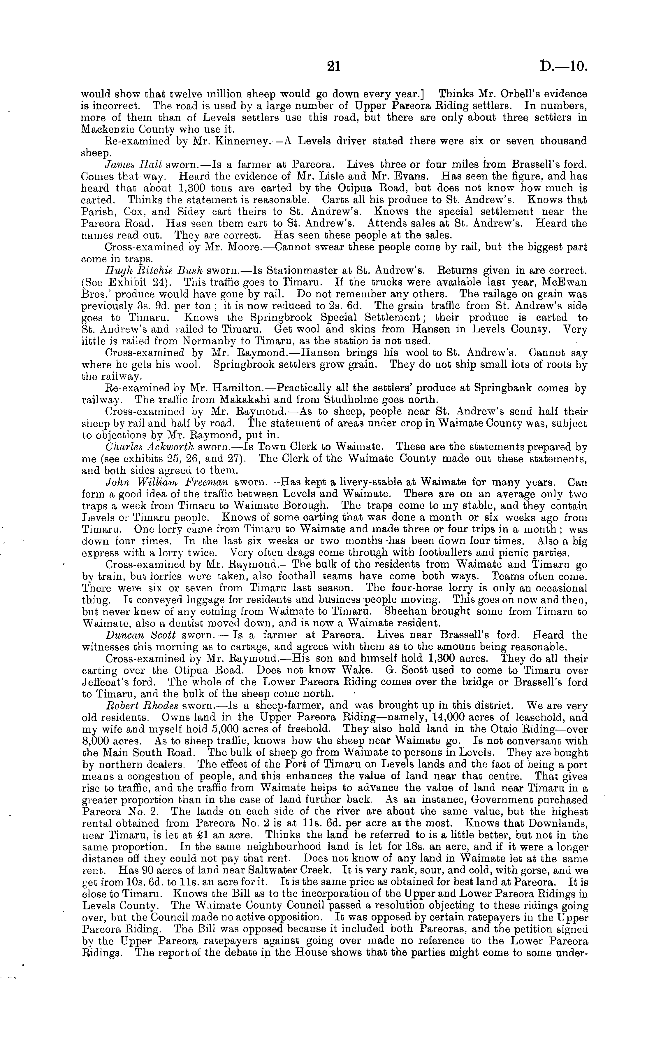 would show that twelve million sheep would go down every year.] Thinks Mr. Orbell's evidence is incorrect. The road is used by a large number of Upper Pareora Eiding settlers. In numbers, more of them than of Levels settlers use this road, but there are only about three settlers in Mackenzie County who use it. Ec-examined by Mr. Kinnerney.-—A Levels driver stated there were six or seven thousand sheep. James Hall sworn.—ls a farmer at Pareora. Lives three or four miles from Brassell's ford. Comes that way. Heard the evidence of Mr. Lisle and Mr. Evans. Has seen the figure, and has heard that about 1,300 tons are carted by the Otipua Eoad, but does not know how much is carted. Thinks the statement is reasonable. Carts all his produce to St. Andrew's. Knows that Parish, Cox, and Sidey cart theirs to St. Andrew's. Knows the special settlement near the Pareora Eoad. Has seen them cart to St. Andrew's. Attends sales at St. Andrew's. Heard the names read out. They are correct. Has seen these people at the sales. Cross-examined by Mr. Moore. —Cannot swear these people come by rail, but the biggest part come in traps. Hugh Ritchie Bush sworn. —Is Stationmaster at St. Andrew's. Eeturns given in are correct. (See Exhibit 24). This traffic goes to Timaru. If the trucks were available last year, McEwan Bros.' produce would have gone by rail. Do not remember any others. The railage on grain was previously 3s. 9d. per ton ;it is now reduced to 2s. 6d. The grain traffic from St. Andrew's side goes to Timaru. Knows the Springbrook Special Settlement; their produce is carted to St. Andrew's and railed to Timaru. Get wool and skins from Hansen in Levels County. Very little is railed from Normanby to Timaru, as the station is not used. Cross-examined by Mr. Eaymond.—Hansen brings his wool to St. Andrew's. Cannot say where he gets his wool. Springbrook settlers grow grain. They do not ship small lots of roots by the railway. Ec-examined by Mr. Hamilton. —Practically all the settlers' produce at Springbank comes by railway. The traffic from Makakahi and from Studholme goes north. Cross-examined by Mr. Eaymond.—As to sheep, people near St. Andrew's send half their sheep by rail and half by road. The statement of areas under crop in Waimate County was, subject to objections by Mr. Eaymond, put in. Charles Ackivorth sworn. —Is Town Clerk to Waimate. These are the statements prepared by me (see exhibits 25, 26, and 27). The Clerk of the Waimate County made out these statements, and both sides agreed to them. John William Freeman sworn.—Has kept a livery-stable at Waimate for many years. Can form a good idea of the traffic between Levels and Waimate. There are on an average only two traps a week from Timaru to Waimate Borough. The traps come to my stable, and they contain Levels or Timaru people. Knows of some carting that was done a month or six w T eeks ago from Timaru. One lorry came from Timaru to Waimate and made three or four trips in a month; was down four times. In the last six weeks or two months -has been down four times. Also a big express with a lorry twice. Very often drags come through with footballers and picnic parties. Cross-examined by Mr. Eaymond.—The bulk of the residents from Waimate and Timaru go by train, but lorries were taken, also football teams have come both ways. Teams often come. There were six or seven from Timaru last season. The four-horse lorry is only an occasional thing. It conveyed luggage for residents and business people moving. This goes on now and then, but never knew of any coming from Waimate to Timaru. Sheehan brought some from Timaru to Waimate, also a dentist moved down, and is now a Waimate resident. Duncan Scott sworn. —Is a farmer at Pareora. Lives near Brassell's ford. Heard the witnesses this morning as to cartage, and agrees with them as to the amount being reasonable. Cross-examined by Mr. Eaymond. —His son and himself hold 1,300 acres. They do all their carting over the Otipua Eoad. Does not know Wake. G. Scott used to come to Timaru over Jeffcoat's ford. The whole of the Lower Pareora Eiding comes over the bridge or Brassell's ford to Timaru, and the bulk of the sheep come north. Robert Rhodes sworn. —Is a sheep-farmer, and was brought up in this district. We are very old residents. Owns land in the Upper Pareora Eiding—namely, 14,000 acres of leasehold, and my wife and myself hold 5,000 acres of freehold. They also hold land in the Otaio Eiding—over 8,000 acres. As to sheep traffic, knows how the sheep near Waimate go. Is not conversant with the Main South Eoad. The bulk of sheep go from Waimate to persons in Levels. They are bought by northern dealers. The effect of the Port of Timaru on Levels lands and the fact of being a port means a congestion of people, and this enhances the value of land near that centre. That gives rise to traffic, and the traffic from Waimate helps to advance the value of land near Timaru in a greater proportion than in the case of land further back. As an instance, Government purchased Pareora No. 2. The lands on each side of the river are about the same value, but the highest rental obtained from Pareora No. 2is at lis. 6d. per acre at the most. Knows that Downlands, near Timaru, is let at £1 an acre. Thinks the land he referred to is a little better, but not in the same proportion. In the same neighbourhood land is let for 18s. an acre, and if it were a longer distance off they could not pay that rent. Does not know of any land in Waimate let at the same rent. Has 90 acres of land near Saltwater Creek. It is very rank, sour, and cold, with gorse, and we get from 10s. 6d. to lis. an acre for it. It is the same price as obtained for best land at Pareora. It is close to Timaru. Knows the Bill as to the incorporation of the Upper and Lower Pareora Eidings in Levels County. The Waimate County Council passed a resolution objecting to these ridings going over, but the Council made no active opposition. It 