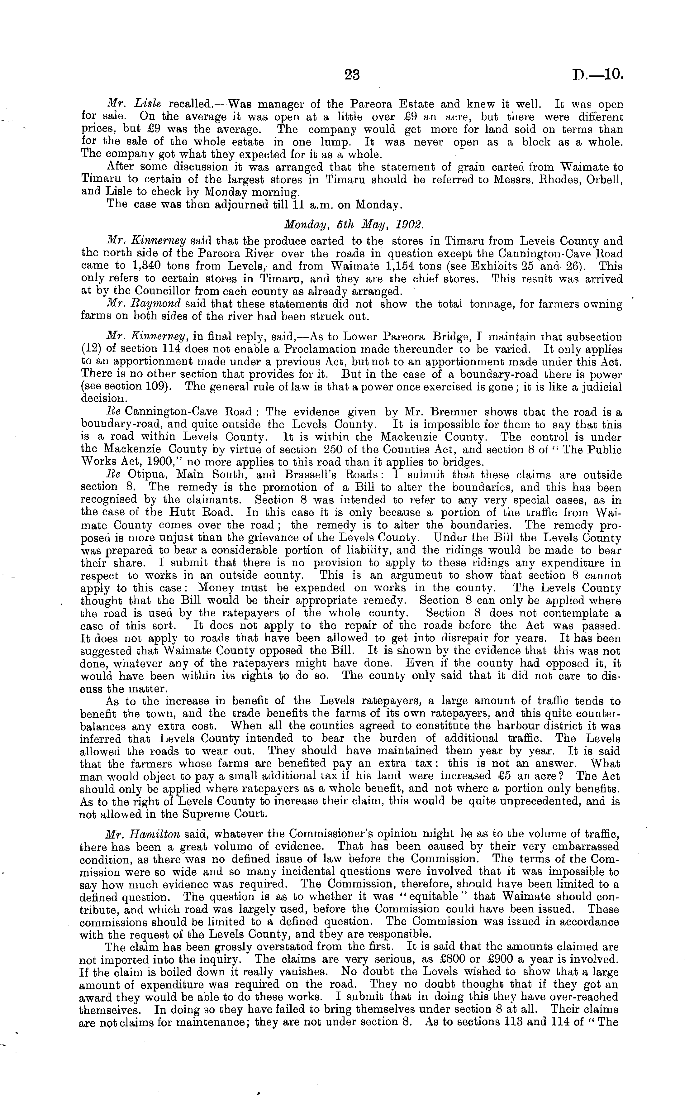 Mr. Lisle recalled.—Was manager of the Pareora Estate and knew it well. It was open for sale. On the average it was open at a little over £9 an acre, but there were different prices, but £9 was the average. The company would get more for land sold on terms than for the sale of the whole estate in one lump. It was never open as a block as a whole. The company got what they expected for it as a whole. After some discussion it was arranged that the statement of grain carted from Waimate to Timaru to certain of the largest stores in Timaru should be referred to Messrs. Ehodes, Orbell, and Lisle to check by Monday morning. The case was then adjourned till 11 a.m. on Monday. Monday, Sth May, 1902. Mr. Kinnerney said that the produce carted to the stores in Timaru from Levels County and the north side of the Pareora Eiver over the roads in question except the Cannington-Cave Eoad came to 1,340 tons from Levels,- and from Waimate 1,154 tons (see Exhibits 25 and 26). This only refers to certain stores in Timaru, and they are the chief stores. This result was arrived at by the Councillor from each county as already arranged. Mr. Raymond said that these statements did not show the total tonnage, for farmers owning farms on both sides of the river had been struck out. Mr. Kinnerney, in final reply, said, —As to Lower Pareora Bridge, I maintain that subsection (12) of section 114 does not enable a Proclamation made thereunder to be varied. It only applies to an apportionment made under a previous Act, but not to an apportionment made under this Act. There is no other section that provides for it. But in the case of a boundary-road there is power (see section 109). The general rule of law is that a power once exercised is gone ;it is like a judicial decision. Re Cannington-Cave Eoad : The evidence given by Mr. Bremner shows that the road is a boundary-road, and quite outside the Levels County. It is impossible for them to say that this is a road within Levels County. It is within the Mackenzie County. The control is under the Mackenzie County by virtue of section 250 of the Counties Act, and section 8 of " The Public Works Act, 1900," no more applies to this road than it applies to bridges. Re Otipua, Main South, and Brassell's Eoads: I submit that these claims are outside section 8. The remedy is the promotion of a Bill to alter the boundaries, and this has been recognised by the claimants. Section 8 was intended to refer to any very special cases, as in the case of the Hutt Eoad. In this case it is only because a portion of the traffic from Waimate County comes over the road ; the remedy is to alter the boundaries. The remedy proposed is more unjust than the grievance of the Levels County. Under the Bill the Levels County was prepared to bear a considerable portion of liability, and the ridings would be made to bear their share. I submit that there is no provision to apply to these ridings any expenditure in respect to works in an outside county. This is an argument to show that section 8 cannot apply to this case: Money must be expended on works in the county. The Levels County thought that the Bill would be their appropriate remedy. Section 8 can only be applied where the road is used by the ratepayers of the whole county. Section 8 does not contemplate a case of this sort. It does not apply to the repair of the roads before the Act was passed. It does not apply to roads that have been allowed to get into disrepair for years. It has been suggested that Waimate County opposed the Bill. It is shown by the evidence that this was not done, whatever any of the ratepayers might have done. Even if the county had opposed it, it would have been within its rights to do so. The county only said that it did not care to discuss the matter. As to the increase in benefit of the Levels ratepayers, a large amount of traffic tends to benefit the town, and the trade benefits the farms of its own ratepayers, and this quite counterbalances any extra cost. When all the counties agreed to constitute the harbour district it was inferred that Levels County intended to bear the burden of additional traffic. The Levels allowed the roads to wear out. They should have maintained them year by year. It is said that the farmers whose farms are benefited pay an extra tax : this is not an answer. What man would object to pay a small additional tax if his land were increased £5 an acre ? The Act should only be applied where ratepayers as a whole benefit, and not where a portion only benefits. As to the right of Levels County to increase their claim, this would be quite unprecedented, and is not allowed in the Supreme Court. Mr. Hamilton said, whatever the Commissioner's opinion might be as to the volume of traffic, there has been a great volume of evidence. That has been caused by their very embarrassed condition, as there was no defined issue of law before the Commission. The terms of the Commission were so wide and so many incidental questions were involved that it was impossible to say how much evidence was required. The Commission, therefore, should have been limited to a defined question. The question is as to whether it was "equitable" that Waimate should contribute, and which road was largely used, before the Commission could have been issued. These commissions should be limited to a defined question. The Commission was issued in accordance with the request of the Levels County, and they are responsible. The claim has been grossly overstated from the first. It is said that the amounts claimed are not imported into the inquiry. The claims are very serious, as £800 or £900 a year is involved. If the claim is boiled down it really vanishes. No doubt the Levels wished to show that a large amount of expenditure was required on the road. They no doubt thought that if they got an award they would be able to do these works. I submit that in doing this they have over-reached themselves. In doing so they have failed to bring 
