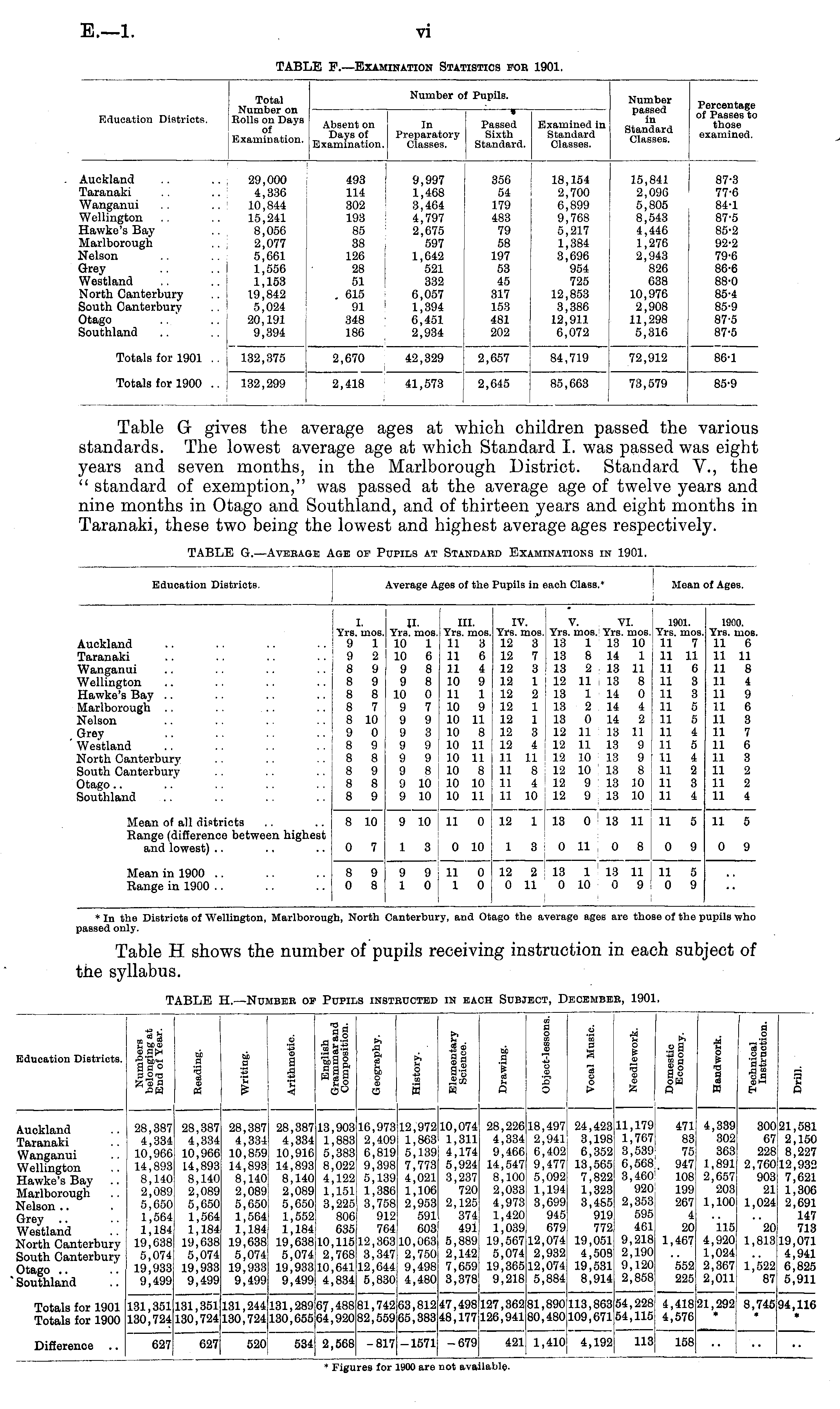 Table G gives the average ages at which children passed the various standards. The lowest average age at which Standard I. was passed was eight years and seven months, in the Marlborough District. Standard V., the " standard of exemption," was passed at the average age of twelve years and nine months in Otago and Southland, and of thirteen years and eight months in Taranaki, these two being the lowest and highest average ages respectively.