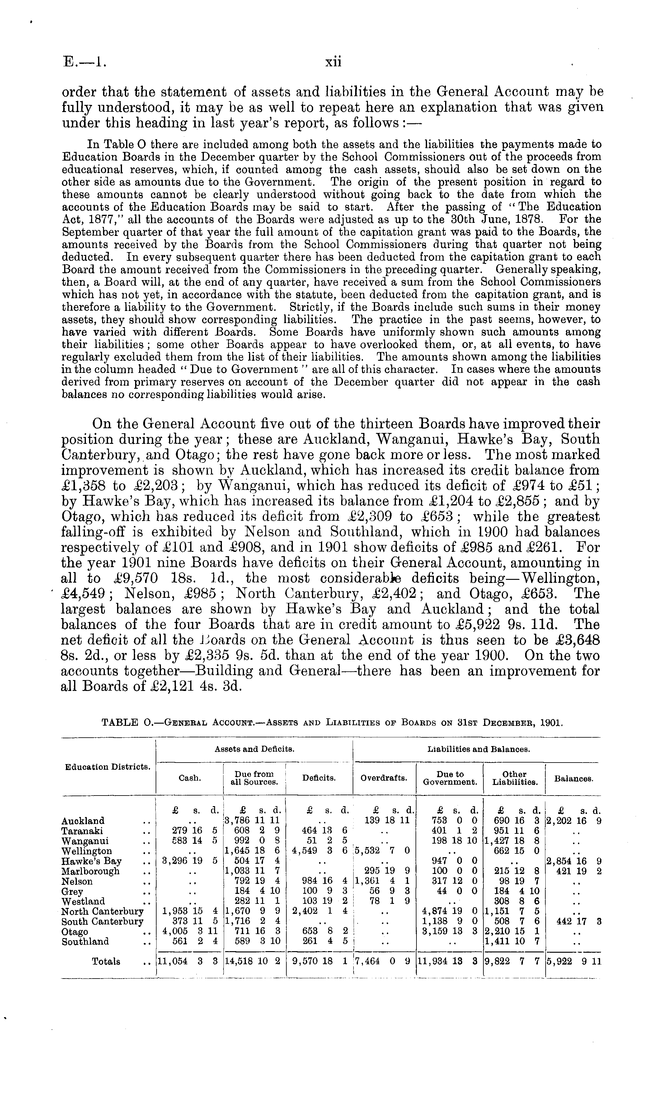 order that the statement of assets and liabilities in the General Account may be fully understood, it may be as well to repeat here an explanation that was given under this heading in last year's report, as follows: — In Table O there are included among both the assets and the liabilities the payments made to Education Boards in the December quarter by the School Commissioners out of the proceeds from educational reserves, which, if counted among the cash assets, should also be set down on the other side as amounts due to the Government. The origin of the present position in regard to these amounts cannot be clearly understood without going back to the date from which the accounts of the Education Boards may be said to start. After the passing of "The Education Act, 1877," all the accounts of the Boards were adjusted as up to the 30th June, 1878. For the September quarter of that year the full amount of the capitation grant was paid to the Boards, the amounts received by the Boards from the School Commissioners during that quarter not being deducted. In every subsequent quarter there has been deducted from the capitation grant to each Board the amount received from the Commissioners in the preceding quarter. Generally speaking, then, a Board will, at the end of any quarter, have received a sum from the School Commissioners which has not yet, in accordance with the statute, been deducted from the capitation grant, and is therefore a liability to the Government. Strictly, if the Boards include such sums in their money assets, they should show corresponding liabilities. The practice in the past seems, however, to have varied with different Boards. Some Boards have uniformly shown such amounts among their liabilities ; some other Boards appear to have overlooked them, or, at all events, to have regularly excluded them from the list of their liabilities. The amounts shown among the liabilities in the column headed " Due to Government " are all of this character. In cases where the amounts derived from primary reserves on account of the December quarter did not appear in the cash balances no corresponding liabilities would arise. On the General Account five out of the thirteen Boards have improved their position during the year; these are Auckland, Wanganui, Hawke's Bay, South Canterbury, and Otago; the rest have gone back more or less. The most marked improvement is shown by Auckland, which has increased its credit balance from £1,358 to ,£2,203; by Wanganui, which has reduced its deficit of £974 to £51; by Hawke's Bay, which has increased its balance from £1,204 to £2,855 ; and by Otago, which has reduced its deficit from £2,309 to £653 ; while the greatest falling-off is exhibited by Nelson and Southland, which in 1900 had balances respectively of £101 and £908, and in 1901 show deficits of £985 and £261. For the year 1901 nine Boards have deficits on their General Account, amounting in all to £9,570 18s. Id., the most considerable deficits being—Wellington, £4,549; Nelson, £985; North Canterbury, £2,402; and Otago, £653. The largest balances are shown by Hawke's Bay and Auckland; and the total balances of the four Boards that are in credit amount to £5,922 9s. lid. The net deficit of all the Jioards on the General Account is thus seen to be £3,648 Bs. 2d., or less by £2,335 9s. sd. than at the end of the year 1900. On the two accounts together—Building and General—there has been an improvement for all Boards of £2,121 4s. 3d.