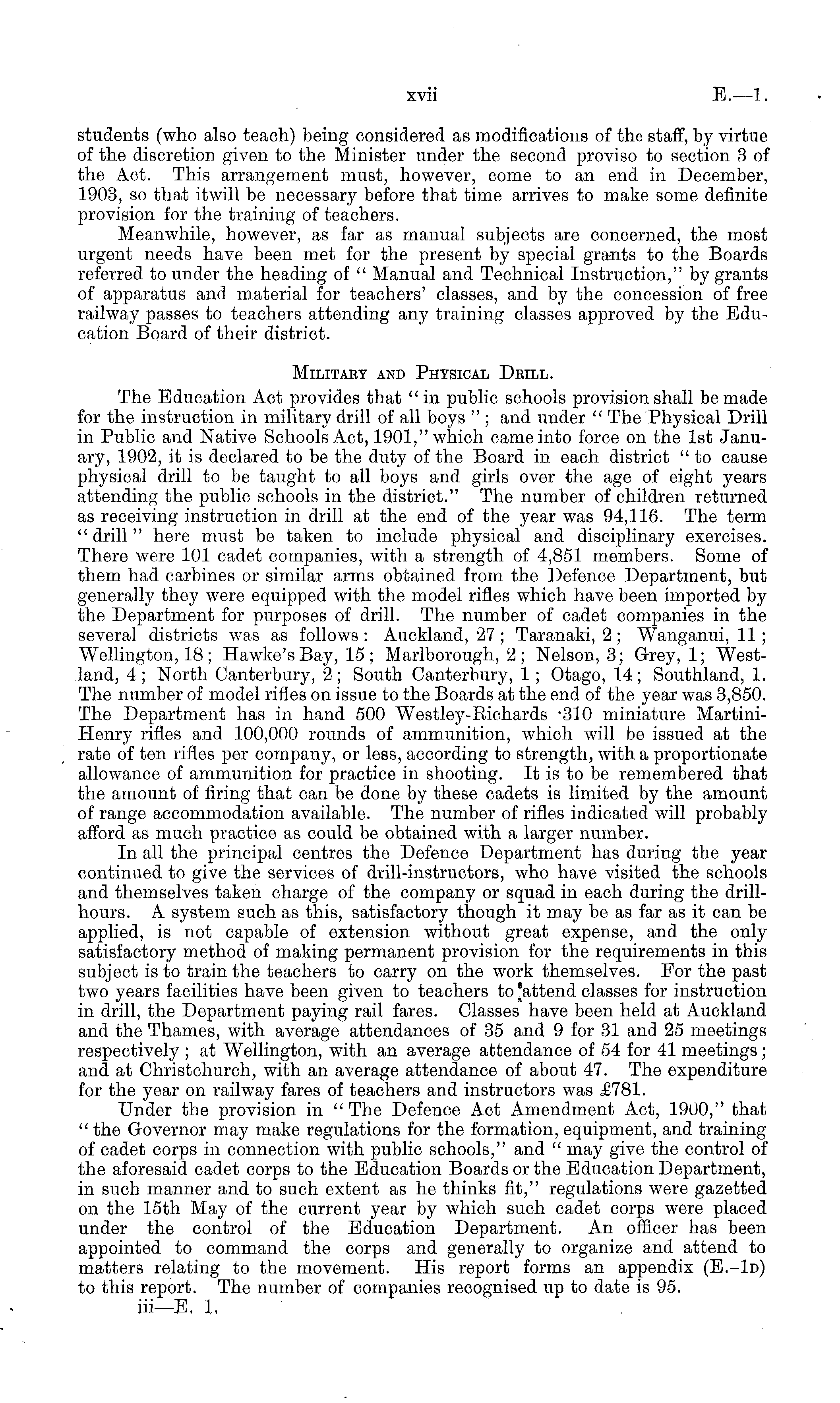 students (who also teach) being considered as modifications of the staff, by virtue of the discretion given to the Minister under the second proviso to section 3 of the Act. This arrangement must, however, come to an end in December, 1903, so that itwill be necessary before that time ai*rives to make some definite provision for the training of teachers. Meanwhile, however, as far as manual subjects are concerned, the most urgent needs have been met for the present by special grants to the Boards referred to under the heading of " Manual and Technical Instruction," by grants of apparatus and material for teachers' classes, and by the concession of free railway passes to teachers attending any training classes approved by the Education Board of their district. MILITAET AND PHYSICAL DRILL. The Education Act provides that "in public schools provision shall be made for the instruction in military drill of all boys " ; and under " The Physical Drill in Public and Native Schools Act, 1901," which came into force on the Ist January, 1902, it is declared to be the duty of the Board in each district " to cause physical drill to be taught to all boys and girls over the age of eight years attending the public schools in the district." The number of children returned as receiving instruction in drill at the end of the year was 94,116. The term " drill " here must be taken to include physical and disciplinary exercises. There were 101 cadet companies, with a strength of 4,851 members. Some of them had carbines or similar arms obtained from the Defence Department, but generally they were equipped with the model rifles which have been imported by the Department for purposes of drill. The number of cadet companies in the several districts was as follows : Auckland, 27 ; Taranaki, 2; Wanganui, 11 ; Wellington, 18; Hawke'sßay, 15; Marlborough, 2; Nelson, 3; Grey, 1; Westland, 4; North Canterbury, 2; South Canterbury, 1; Otago, 14; Southland, 1. The number of model rifles on issue to the Boards at the end of the year was 3,850. The Department has in hand 500 Westley-Eichards '310 miniature MartiniHenry rifles and 100,000 rounds of ammunition, which will be issued at the rate of ten rifles per company, or less, according to strength, with a proportionate allowance of ammunition for practice in shooting. It is to be remembered that the amount of firing that can be done by these cadets is limited by the amount of range accommodation available. The number of rifles indicated will probably afford as much practice as could be obtained with a larger number. In all the principal centres the Defence Department has during the year continued to give the services of drill-instructors, who have visited the schools and themselves taken charge of the company or squad in each during the drillhours. A system such as this, satisfactory though it may be as far as it can be applied, is not capable of extension without great expense, and the only satisfactory method of making permanent provision for the requirements in this subject is to train the teachers to carry on the work themselves. For the past two years facilities have been given to teachers to 'attend classes for instruction in drill, the Department paying rail fares. Classes have been held at Auckland and the Thames, with average attendances of 35 and 9 for 31 and 25 meetings respectively ; at Wellington, with an average attendance of 54 for 41 meetings; and at Christchurch, with an average attendance of about 47. The expenditure for the year on railway fares of teachers and instructors was 56781. Under the provision in " The Defence Act Amendment Act, 1900," that " the Governor may make regulations for the formation, equipment, and training of cadet corps in connection with public schools," and " may give the control of the aforesaid cadet corps to the Education Boards or the Education Department, in such manner and to such extent as he thinks fit," regulations were gazetted on the 15th May of the current year by which such cadet corps were placed under the control of the Education Department. An officer has been appointed to command the corps and generally to organize and attend to matters relating to the movement. His report forms an appendix (E.-1d) to this report. The number of companies recognised up to date is 95. iii—E. 1,