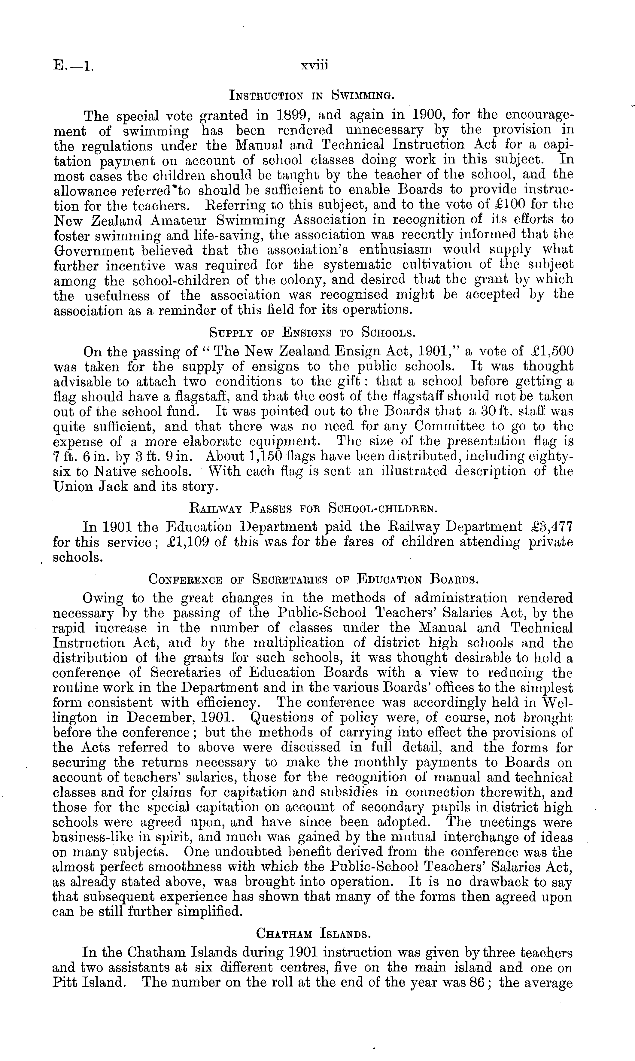 Instkuction in Swimming. The special vote granted in 1899, and again in 1900, for the encouragement of swimming has been rendered unnecessary by the provision in the regulations under the Manual and Technical Instruction Act for a capitation payment on account of school classes doing work in this subject. In most cases the children should be taught by the teacher of the school, and the allowance referred *to should be sufficient to enable Boards to provide instruction for the teachers. Referring to this subject, and to the vote of £100 for the New Zealand Amateur Swimming Association in recognition of its efforts to foster swimming and life-saving, the association was recently informed that the Government believed that the association's enthusiasm would supply what further incentive was required for the systematic cultivation of the subject among the school-children of the colony, and desired that the grant by which the usefulness of the association was recognised might be accepted by the association as a reminder of this field for its operations. Supply of Ensigns to Schools. On the passing of " The New Zealand Ensign Act, 1901," a vote of £1,500 was taken for the supply of ensigns to the public schools. It was thought advisable to attach two conditions to the gift: that a school before getting a flag should have a flagstaff, and that the cost of the flagstaff should not be taken out of the school fund. It was pointed out to the Boards that a3O ft. staff was quite sufficient, and that there was no need for any Committee to go to the expense of a more elaborate equipment. The size of the presentation flag is 7 ft. 6 in. by 3 ft. 9 in. About 1,150 flags have been distributed, including eightysix to Native schools. With each flag is sent an illustrated description of the Union Jack and its story. Railway Passes foe School-children. In 1901 the Education Department paid the Railway Department £3,477 for this service; £1,109 of this was for the fares of children attending private schools. Conference of Secretaries of Education Boards. Owing to the great changes in the methods of administration rendered necessary by the passing of the Public-School Teachers' Salaries Act, by the rapid increase in the number of classes under the Manual and Technical Instruction Act, and by the multiplication of district high schools and the distribution of the grants for such schools, it was thought desirable to hold a conference of Secretaries of Education Boards with a view to reducing the routine work in the Department and in the various Boards' offices to the simplest form consistent with efficiency. The conference was accordingly held in Wellington in December, 1901. Questions of policy were, of course, not brought before the conference ; but the methods of carrying into effect the provisions of the Acts referred to above were discussed in full detail, and the forms for securing the returns necessary to make the monthly payments to Boards on account of teachers' salaries, those for the recognition of manual and technical classes and for claims for capitation and subsidies in connection therewith, and those for the special capitation on account of secondary pupils in district high schools were agreed upon, and have since been adopted. The meetings were business-like in spirit, and much was gained by the mutual interchange of ideas on many subjects. One undoubted benefit derived from the conference was the almost perfect smoothness with which the Public-School Teachers' Salaries Act, as already stated above, was brought into operation. It is no drawback to say that subsequent experience has shown that many of the forms then agreed upon can be still further simplified. Chatham Islands. In the Chatham Islands during 1901 instruction was given by three teachers and two assistants at six different centres, five on the main island and one on Pitt Island. The number on the roll at the end of the year was 86 ; the average