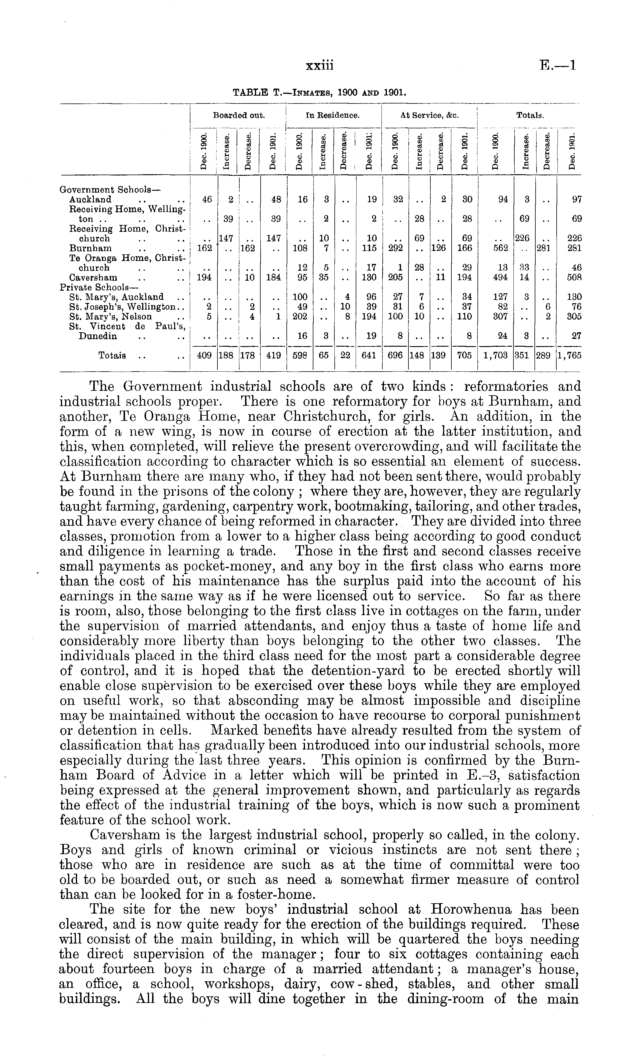 The Government industrial schools are of two kinds : reformatories and industrial schools proper. There is one reformatory for boys at Burnham, and another, Te Oranga Home, near Christchurch, for girls. An addition, in the form of a new wing, is now in course of erection at the latter institution, and this, when completed, will relieve the present overcrowding, and will facilitate the classification according to character which is so essential an element of success. At Burnham there are many who, if they had not been sent there, would probably be found in the prisons of the colony ; where they are, however, they are regularly taught farming, gardening, carpentry work, bootmaking, tailoring, and other trades, and have every chance of being reformed in character. They are divided into three classes, promotion from a lower to a higher class being according to good conduct and diligence in learning a trade. Those in the first and second classes receive small payments as pocket-money, and any boy in the first class who earns more than the cost of his maintenance has the surplus paid into the account of his earnings in the same way as if he were licensed out to service. So far as there is room, also, those belonging to the first class live in cottages on the farm, under the supervision of married attendants, and enjoy thus a taste of home life and considerably more liberty than boys belonging to the other two classes. The individuals placed in the third class need for the most part a considerable degree of control, and it is hoped that the detention-yard to be erected shortly will enable close supervision to be exercised over these boys while they are employed on useful work, so that absconding may be almost impossible and discipline maybe maintained without the occasion to have recourse to corporal punishment or detention in cells. Marked benefits have already resulted from the system of classification that has gradually been introduced into our industrial schools, more especially during the last three years. This opinion is confirmed by the Burnham Board of Advice in a letter which will be printed in E.-3, satisfaction being expressed at the general improvement shown, and particularly as regards the effect of the industrial training of the boys, which is now such a prominent feature of the school work. Caversham is the largest industrial school, properly so called, in the colony. Boys and girls of known criminal or vicious instincts are not sent there ; those who are in residence are such as at the time of committal were too old to be boarded out, or such as need a somewhat firmer measure of control than can be looked for in a foster-home. The site for the new boys' industrial school at Horowhenua has been cleared, and is now quite ready for the erection of the buildings required. These will consist of the main building, in which will be quartered the boys needing the direct supervision of the manager; four to six cottages containing each about fourteen boys in charge of a married attendant; a manager's house, an office, a school, workshops, dairy, cow - shed, stables, and other small buildings. All the boys will dine together in the dining-room of the main