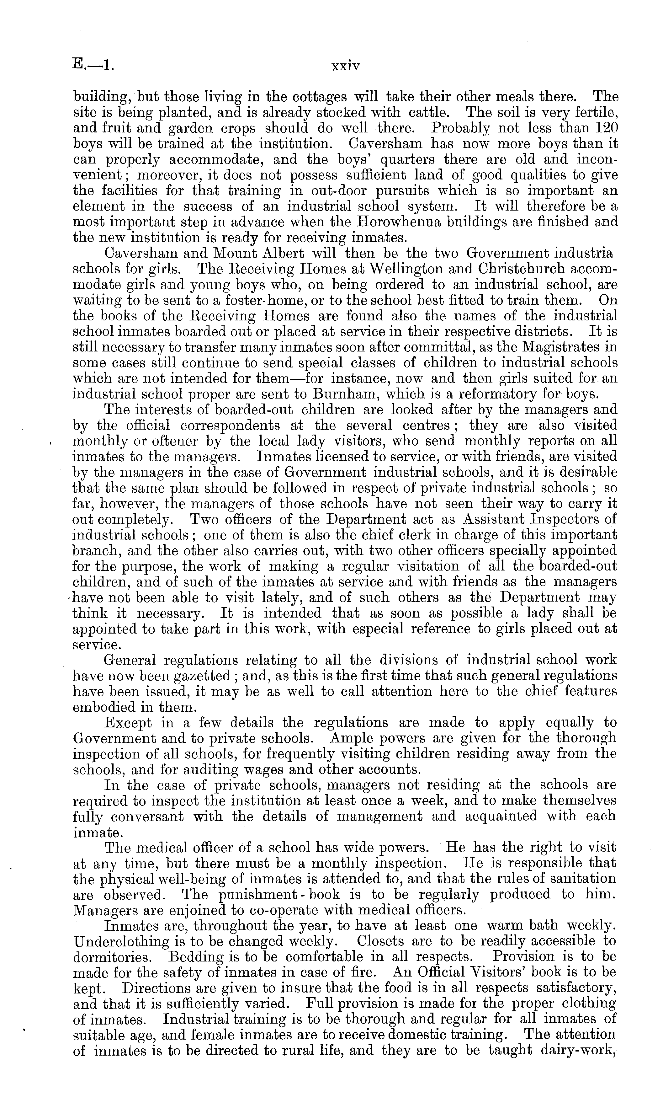 building, but those living in the cottages will take their other meals there. The site is being planted, and is already stocked with cattle. The soil is very fertile, and fruit and garden crops should do well there. Probably not less than 120 boys will be trained at the institution. Caversham has now more boys than it can properly accommodate, and the boys' quarters there are old and inconvenient ; moreover, it does not possess sufficient land of good qualities to give the facilities for that training in out-door pursuits which is so important an element in the success of an industrial school system. It will therefore be a most important step in advance when the Horowhenua buildings are finished and the new institution is ready for receiving inmates. Caversham and Mount Albert will then be the two Government industria schools for girls. The Receiving Homes at Wellington and Christchurch accommodate girls and young boys who, on being ordered to an industrial school, are waiting to be sent to a foster-home, or to the school best fitted to train them. On the books of the Receiving Homes are found also the names of the industrial school inmates boarded out or placed at service in their respective districts. It is still necessary to transfer many inmates soon after committal, as the Magistrates in some cases still continue to send special classes of children to industrial schools which are not intended for them —for instance, now and then girls suited for an industrial school proper are sent to Burnham, which is a reformatory for boys. The interests of boarded-out children are looked after by the managers and by the official correspondents at the several centres; they are also visited monthly or oftener by the local lady visitors, who send monthly reports on all inmates to the managers. Inmates licensed to service, or with friends, are visited by the managers in the case of Government industrial schools, and it is desirable that the same plan should be followed in respect of private industrial schools; so far, however, the managers of those schools have not seen their way to carry it out completely. Two officers of the Department act as Assistant Inspectors of industrial schools; one of them is also the chief clerk in charge of this important branch, and the other also carries out, with two other officers specially appointed for the purpose, the work of making a regular visitation of all the boarded-out children, and of such of the inmates at service and with friends as the managers have not been able to visit lately, and of such others as the Department may think it necessary. It is intended that as soon as possible a lady shall be appointed to take part in this work, with especial reference to girls placed out at service. General regulations relating to all the divisions of industrial school work have now been gazetted ; and, as this is the first time that such general regulations have been issued, it may be as well to call attention here to the chief features embodied in them. Except in a few details the regulations are made to apply equally to Government and to private schools. Ample powers are given for the thorough inspection of all schools, for frequently visiting children residing away from the schools, and for auditing wages and other accounts. In the case of private schools, managers not residing at the schools are required to inspect the institution at least once a week, and. to make themselves fully conversant with the details of management and acquainted with each inmate. The medical officer of a school has wide powers. He has the right to visit at any time, but there must be a monthly inspection. He is responsible that the physical well-being of inmates is attended to, and that the rules of sanitation are observed. The punishment - book is to be regularly produced to him. Managers are enjoined to co-operate with medical officers. Inmates are, throughout the year, to have at least one warm bath weekly. Underclothing is to be changed weekly. Closets are to be readily accessible to dormitories. Bedding is to be comfortable in all respects. Provision is to be made for the safety of inmates in case of fire. An Official Visitors' book is to be kept. Directions are given to insure that the food is in all respects satisfactory, and that it is sufficiently varied. Full provision is made for the proper clothing of inmates. Industrial training is to be thorough and regular for all inmates of suitable age, and female inmates are to receive domestic training. The attention of inmates is to be directed to rural life, and they are to be taught dairy-work,