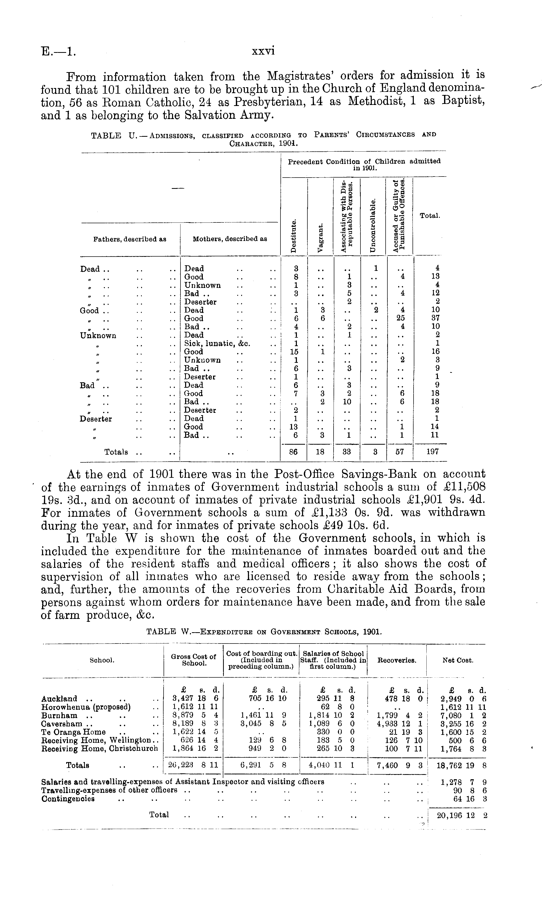 At the end of 1901 there was in the Post-Office Savings-Bank on account of the earnings of inmates of Government industrial schools a sum of £11,508 19s. 3d., and on account of inmates of private industrial schools £1,901 9s. 4d. For inmates of Government schools a sum of £1,133 os. 9d. was withdrawn during the year, and for inmates of private schools £49 10s. 6d. In Table W is shown the cost of the Government schools, in which is included the expenditure for the maintenance of inmates boarded out and the salaries of the resident staffs and medical officers ; it also shows the cost of supervision of all inmates who are licensed to reside away from the schools; and, further, the amounts of the recoveries from Charitable Aid Boards, from persons against whom orders for maintenance have been made, and from the sale of farm produce, &c.