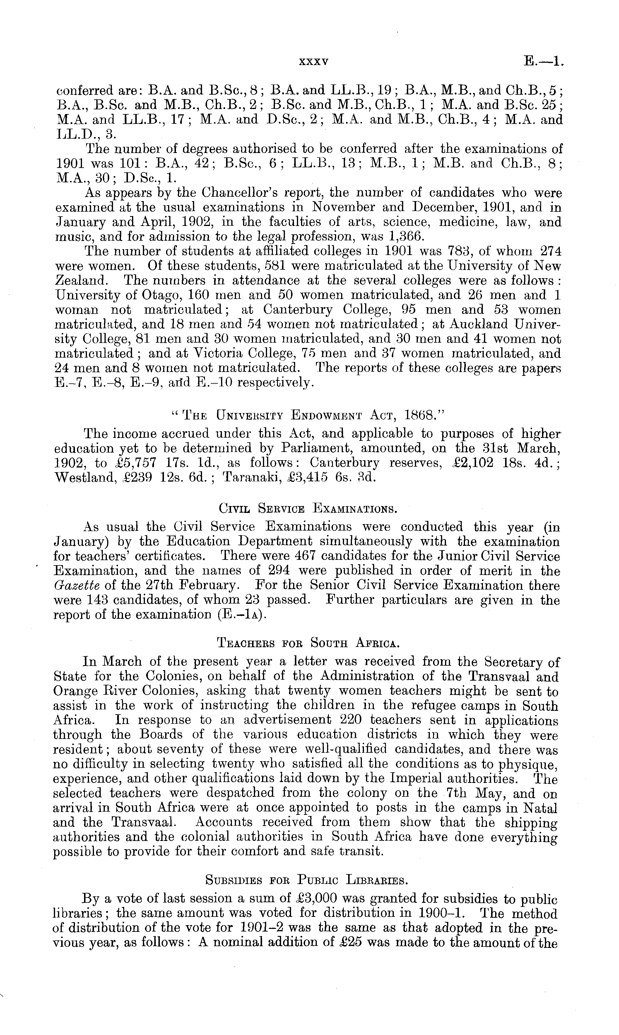 conferred are: B.A. and B.Sc, 8 ; B.A. and LL.B., 19 ; 8.A., M.8., and Ch.B., 5 ; 8.A., B.Sc. and M.8., Ch.B., 2 ; B.Sc. and M.8., Ch.B., 1; M.A. and B.Sc. 25 ; M.A. and LL.B., 17 ; M.A. and D.Sc, 2 ; M.A. and M.8., Ch.B., 4; M.A. and LL.I)., 3. The number of degrees authorised to be conferred after the examinations of 1901 was 101: 8.A., 42; B.Sc, 6; LL.B., 13; M.8., 1; M.B. and Ch.B., 8; M.A., 30; D.Sc, 1. As appears by the Chancellor's report, the number of candidates who were examined at the usual examinations in November and December, 1901, and in January and April, 1902, in the faculties of arts, science, medicine, law, and music, and for admission to the legal profession, was 1,366. The number of students at affiliated colleges in 1901 was 783, of whom 274 were women. Of these students, 581 were matriculated at the University of New Zealand. The numbers in attendance at the several colleges were as follows : University of Otago, 160 men and 50 women matriculated, and 26 men and 1 woman not matriculated; at Canterbury College, 95 men and 53 women matriculated, and 18 men and 54 women not matriculated; at Auckland University College, 81 men and 30 women matriculated, and 30 men and 41 women not matriculated; and at Victoria College, 75 men and 37 women matriculated, and 24 men and 8 women not matriculated. The reports of these colleges are papers E.-7, E.-8, E.-9, arid E.-10 respectively. " The Univeusity Endowment Act, 1868." The income accrued under this Act, and applicable to purposes of higher education yet to be determined by Parliament, amounted, on the 31st March, 1902, to .£5,757 17s. Id., as follows: Canterbury reserves, £2,102 18s. 4d.; Westland, £239 12s. 6d. ; Taranaki, £3,415 6s. 3d. Civil Service Examinations. As usual the Civil Service Examinations were conducted this year (in January) by the Education Department simultaneously with the examination for teachers' certificates. There were 467 candidates for the Junior Civil Service Examination, and the names of 294 were published in order of merit in the Gazette of the 27th February. For the Senior Civil Service Examination there were 143 candidates, of whom 23 passed. Further particulars are given in the report of the examination (E.-1a). Teachebs fob South Afbica. In March of the present year a letter was received from the Secretary of State for the Colonies, on behalf of the Administration of the Transvaal and Orange River Colonies, asking that twenty women teachers might be sent to assist in the work of instructing the children in the refugee camps in South Africa. In response to an advertisement 220 teachers sent in applications through the Boards of the various education districts in which they were resident; about seventy of these were well-qualified candidates, and there was no difficulty in selecting twenty who satisfied all the conditions as to physique, experience, and other qualifications laid down by the Imperial authorities. The selected teachers were despatched from the colony on the 7th May, and on arrival in South Africa were at once appointed to posts in the camps in Natal and the Transvaal. Accounts received from them show that the shipping authorities and the colonial authorities in South Africa have done everything possible to provide for their comfort and safe transit. Subsidies fob Public Libbabies. By a vote of last session a sum of j£3,000 was granted for subsidies to public libraries; the same amount was voted for distribution in 1900-1. The method of distribution of the vote for 1901-2 was the same as that adopted in the previous year, as follows : A nominal addition of £25 was made to the amount of the