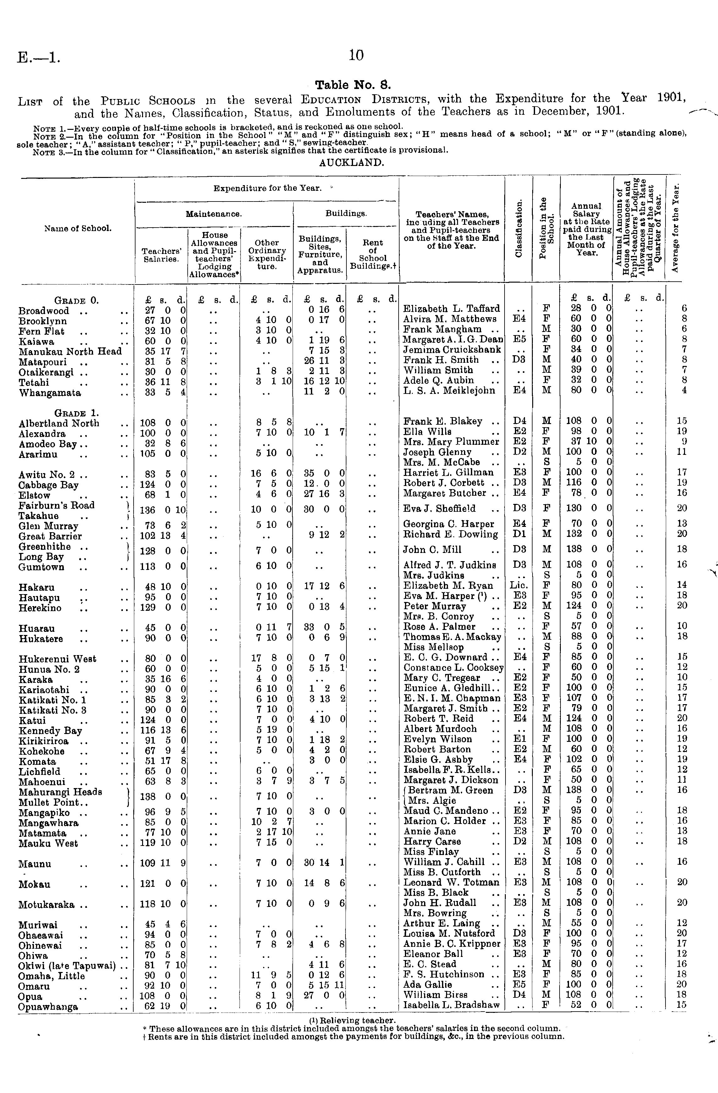 Table No. 8. List of the Public Schools in the several Education Districts, with the Expenditure for the Year 1901, and the Names, Classification, Status, and Emoluments of the Teachers as in December, 1901.