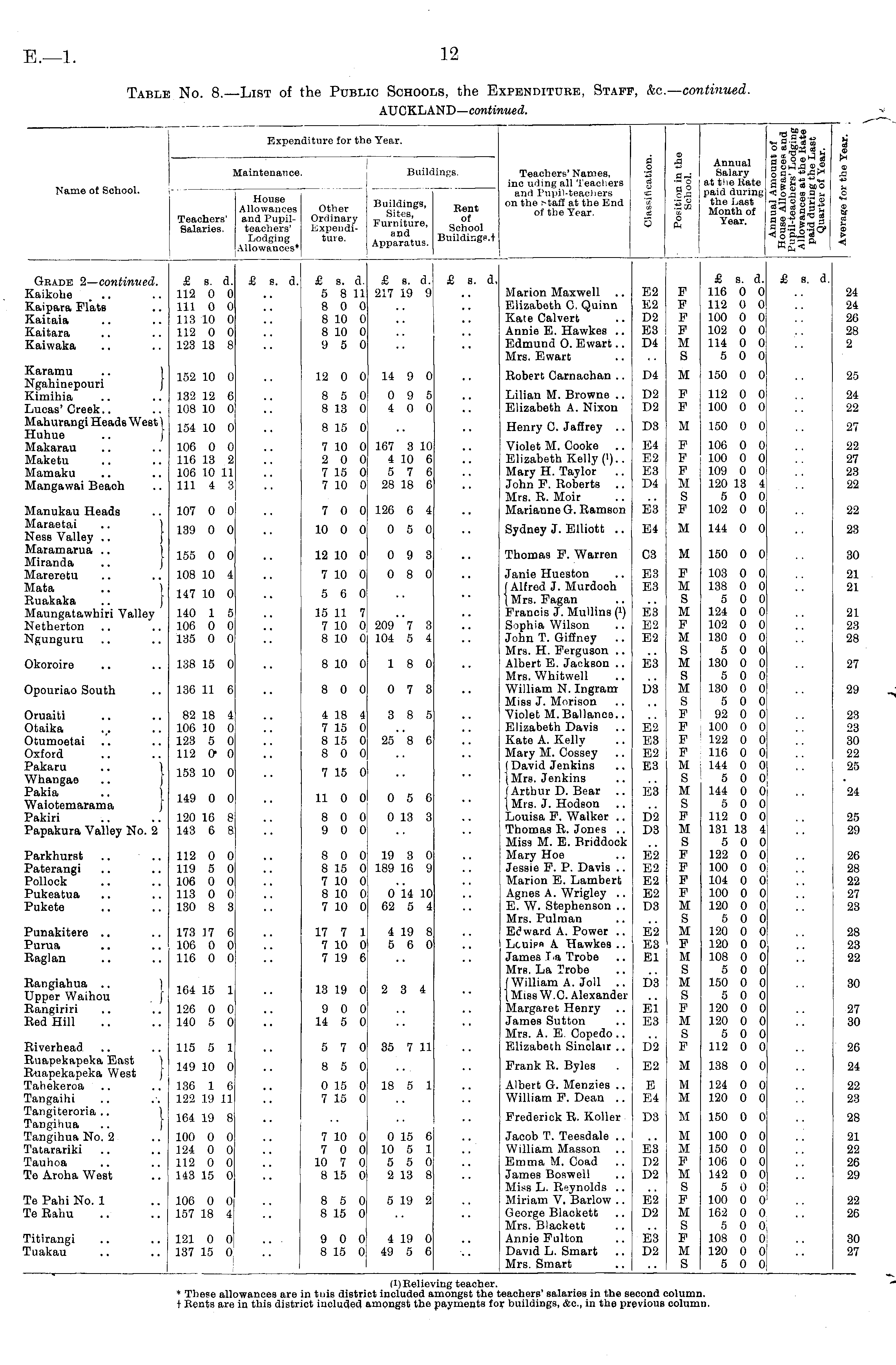 Table No. 8. —List of the Public Schools, the Expenditure, Staff, &c.—continued. AUCKLAND— continued.