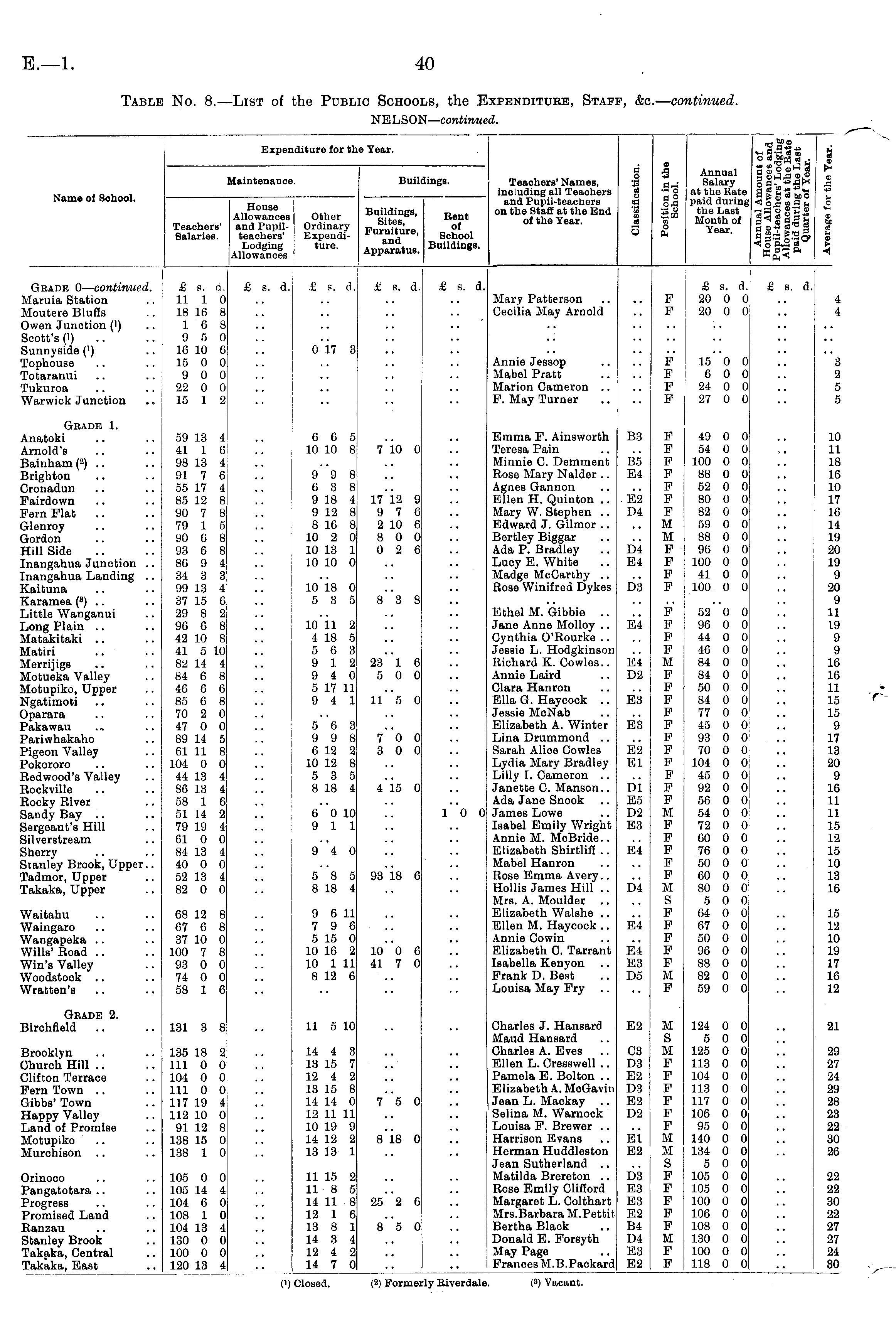 Table No. 8.—List of the Public Schools, the Expenditure, Staff, &c.— continued. NELSON— continued.