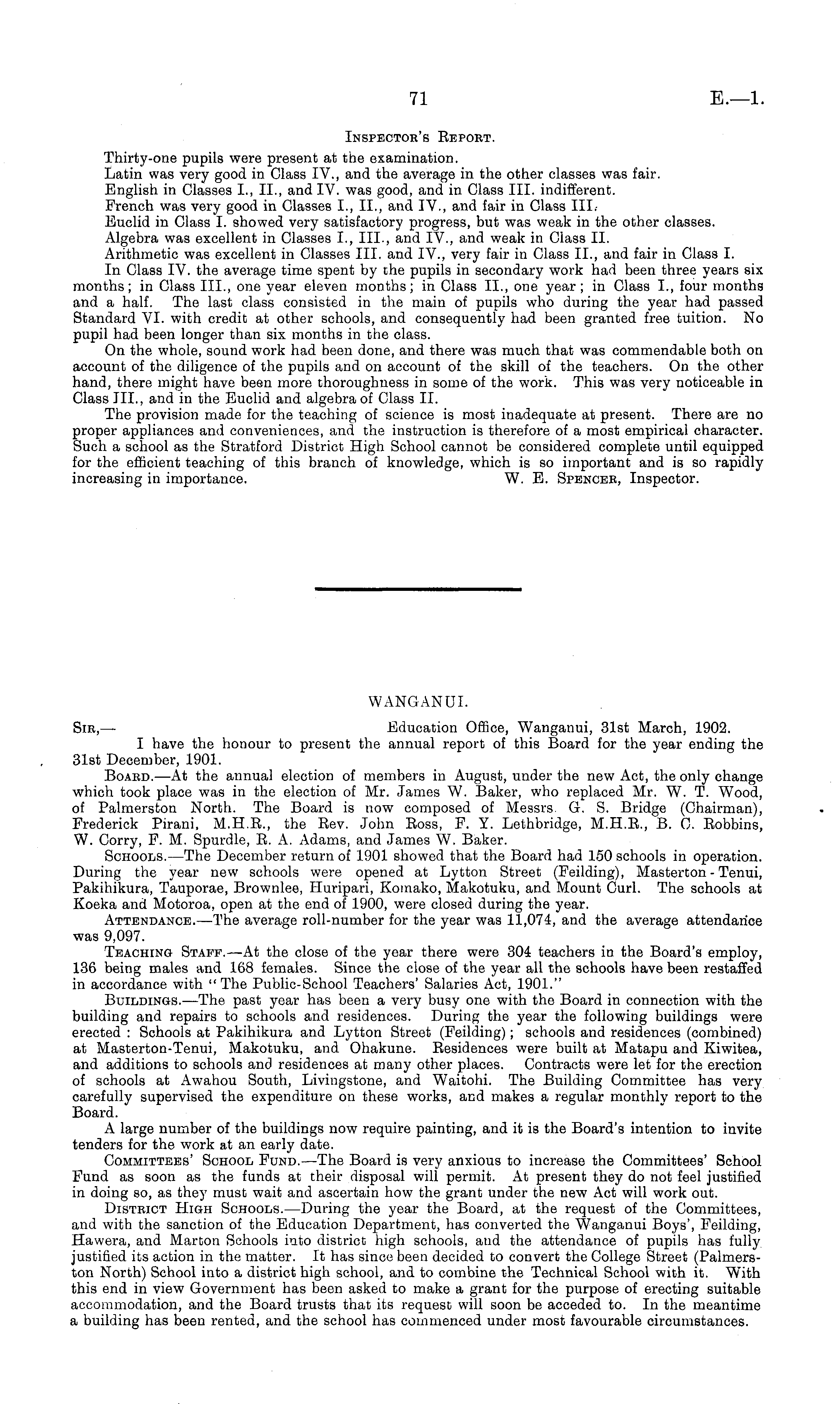WANGANUI. Sir, — Education Office, Wanganui, 31st March, 1902. I have the honour to present the annual report of this Board for the year ending the 31st December, 1901. Board.—At the annual election of members in August, under the new Act, the only change which took place was in the election of Mr. James W. Baker, who replaced Mr. W. T. Wood, of Palmerston North. The Board is now composed of Messrs. G. S. Bridge (Chairman), Frederick Pirani, M.H.E., the Rev. John Ross, F. Y. Lethbridge, M.H.R., B. C. Bobbins, W. Corry, F. M. Spurdle, R. A. Adams, and James W. Baker. Schools. —The December return of 1901 showed that the Board had 150 schools in operation. During the year new schools were opened at Lytton Street (Feilding), Masterton - Tenui, Pakihikura, Tauporae, Brownlee, Huripari, Komako, Makotuku, and Mount Curl. The schools at Koeka and Motoroa, open at the end of 1900, were closed during the year. Attendance.—The average roll-number for the year was 11,074, and the average attendance was 9,097. Teaching Staff. —At the close of the year there were 304 teachers in the Board's employ, 136 being males and 168 females. Since the close of the year all the schools have been restaffed in accordance with "The Public-School Teachers' Salaries Act, 1901." Buildings.—The past year has been a very busy one with the Board in connection with the building and repairs to schools and residences. During the year the following buildings were erected : Schools at Pakihikura and Lytton Street (Feilding); schools and residences (combined) at Masterton-Tenui, Makotuku, and Ohakune. Residences were built at Matapu and Kiwitea, and additions to schools and residences at many other places. Contracts were let for the erection of schools at Awahou South, Livingstone, and Waitohi. The Building Committee has very carefully supervised the expenditure on these works, and makes a regular monthly report to the Board. A large number of the buildings now require painting, and it is the Board's intention to invite tenders for the work at an early date. Committees' School Fond.—The Board is very anxious to increase the Committees' School Fund as soon as the funds at their disposal will permit. At present they do not feel justified in doing so, as the} 7 must wait and ascertain how the grant under the new Act will work out. District High Schools.—During the year the Board, at the request of the Committees, and with the sanction of the Education Department, has converted the Wanganui Boys', Feilding, Hawera, and Marton Schools into district high schools, and the attendance of pupils has fully justified its action in the matter. It has since been decided to convert the College Street (Palmerston North) School into a district high school, and to combine the Technical School with it. With this end in view Government has been asked to make a grant for the purpose of erecting suitable accommodation, and the Board trusts that its request will soon be acceded to. In the meantime a building has been rented, and the school has commenced under most favourable circumstances.