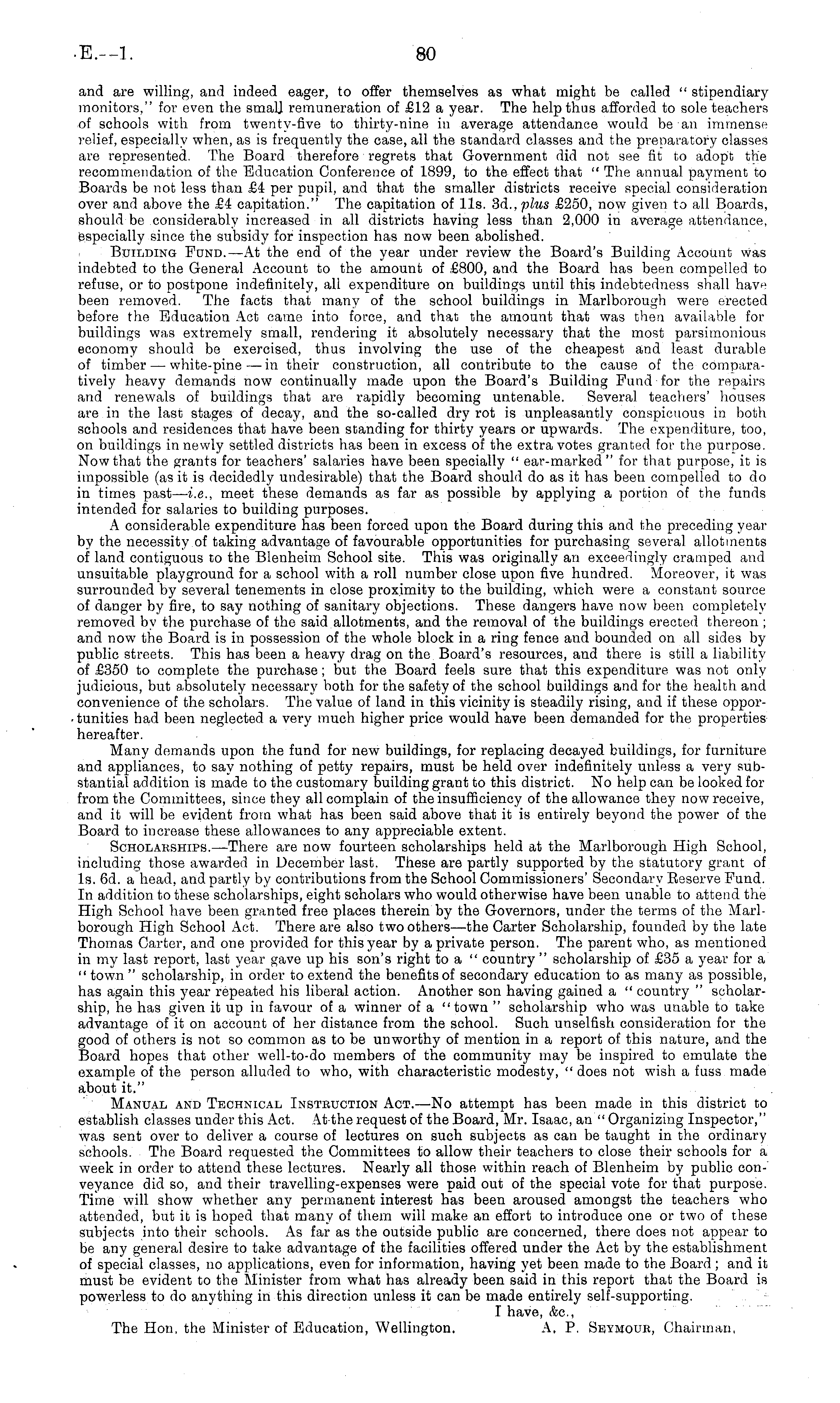 and are willing, and indeed eager, to offer themselves as what might be called " stipendiary monitors," for even the small remuneration of £12 a year. The help thus afforded to sole teachers of schools with from twenty-five to thirty-nine in average attendance would be an immense relief, especially when, as is frequently the case, all the standard classes and the preparatory classes are represented. The Board therefore regrets that Government did not see fit to adopt the recommendation of the Education Conference of 1899, to the effect that " The annual payment to Boards be not less than £4 per pupil, and that the smaller districts receive special consideration over and above the £4 capitation." The capitation of 11s. 3d., plus £250, now given to all Boards, should be considerably increased in all districts having less than 2,000 in average attendance, especially since the subsidy for inspection has now been abolished. Building Fund.—At the end of the year under review the Board's Building Account was indebted to the General Account to the amount of £800, and the Board has been compelled to refuse, or to postpone indefinitely, all expenditure on buildings until this indebtedness shall have been removed. The facts that many of the school buildings in Marlborough were erected before the Education Act came into force, and that the amount that was then available for buildings was extremely small, rendering it absolutely necessary that the most parsimonious economy should be exercised, thus involving the use of the cheapest and least durable of timber — white-pine —in their construction, all contribute to the cause of the comparatively heavy demands now continually made upon the Board's Building Fund for the repairs and renewals of buildings that are rapidly becoming untenable. Several teachers' houses are in the last stages of decay, and the so-called dry rot is unpleasantly conspicuous in both schools and residences that have been standing for thirty years or upwards. The expenditure, too, on buildings in newly settled districts has been in excess of the extra votes granted for the purpose. Now that the grants for teachers' salaries have been specially " ear-marked" for that purpose, it is impossible (as it is decidedly undesirable) that the Board should do as it has been compelled to do in times past— i.e., meet these demands as far as possible by applying a portion of the funds intended for salaries to building purposes. A considerable expenditure has been forced upon the Board during this and the preceding year by the necessity of taking advantage of favourable opportunities for purchasing several allotments of land contiguous to the Blenheim School site. This was originally an exceedingly cramped and unsuitable playground for a school with a roll number close upon five hundred. Moreover, it was surrounded by several tenements in close proximity to the building, which were a constant source of danger by fire, to say nothing of sanitary objections. These dangers have now been completely removed by the purchase of the said allotments, and the removal of the buildings erected thereon ; and now the Board is in possession of the whole block in a ring fence and bounded on all sides by public streets. This has been a heavy drag on the Board's resources, and there is still a liability of £350 to complete the purchase ; but the Board feels sure that this expenditure, was not only judicious, but absolutely necessary both for the safety of the school buildings and for the health and convenience of the scholars. The value of land in this vicinity is steadily rising, and if these opportunities bad been neglected a very much higher price would have been demanded for the properties hereafter. Many demands upon the fund for new buildings, for replacing decayed buildings, for furniture and appliances, to say nothing of petty repairs, must be held over indefinitely unless a very substantial addition is made to the customary building grant to this district. No help can be looked for from the Committees, since they all complain of the insufficiency of the allowance they now receive, and it will be evident from what has been said above that it is entirely beyond the power of the Board to increase these allowances to any appreciable extent. Scholarships.—There are now fourteen scholarships held at the Marlborough High School, including those awarded in December last. These are partly supported by the statutory grant of Is. 6d. a head, and partly by contributions from the School Commissioners' Secondary Eeserve Fund. In addition to these scholarships, eight scholars who would otherwise have been unable to attend the High School have been granted free places therein by the Governors, under the terms of the Marlborough High School Act. There are also two others —the Carter Scholarship, founded by the late Thomas Carter, and one provided for this year by a private person. The parent who, as mentioned in my last report, last year gave up his son's right to a " country " scholarship of £35 a year for a "town" scholarship, in order to extend the benefits of secondary education to as many as possible, has again this year repeated his liberal action. Another son having gained a " country " scholarship, he has given it up in favour of a winner of a "town " scholarship who was unable to take advantage of it on account of her distance from the school. Such unselfish consideration for the good of others is not so common as to be unworthy of mention in a report of this nature, and the Board hopes that other well-to-do members of the community may be inspired to emulate the example of the person alluded to who, with characteristic modesty, " does not wish a fuss made about it," Manual and Technical Instruction Act.—No attempt has been made in this district to establish classes under this Act. ;\tthe request of the Board, Mr. Isaac, an " Organizing Inspector," was sent over to deliver a course of lecture