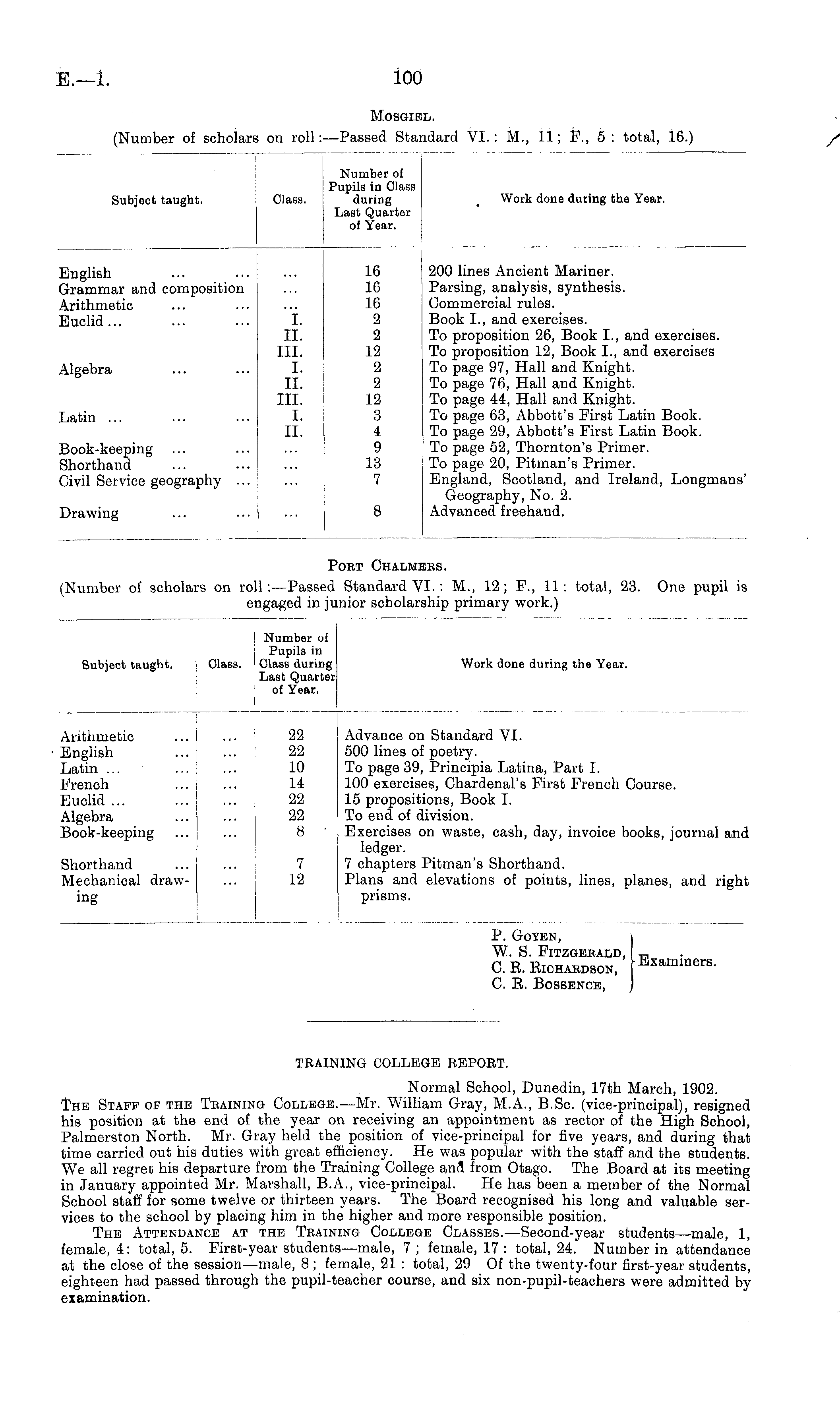 TRAINING COLLEGE REPORT. Normal School, Dunedin, 17th March, 1902. The Staff of the Teainin& College.—Mr. William Gray, M.A., B.Sc. (vice-principal), resigned his position at the end of the year on receiving an appointment as rector of the High School, Palmerston North. Mr. Gray held the position of vice-principal for five years, and during that time carried out his duties with great efficiency. He was popular with the staff and the students. We all regret his departure from the Training College and from Otago. The Board at its meeting in January appointed Mr. Marshall, 8.A., vice-principal. He has been a member of the Normal School staff for some twelve or thirteen years. The Board recognised his long and valuable services to the school by placing him in the higher and more responsible position. The Attendance at the Teaining College Classes.—Second-year students—male, 1, female, 4: total, 5. First-year students—male, 7; female, 17 : total, 24. Number in attendance at the close of the session—male, 8 ; female, 21 : total, 29 Of the twenty-four first-year students, eighteen had passed through the pupil-teacher course, and six non-pupil-teachers were admitted by examination.