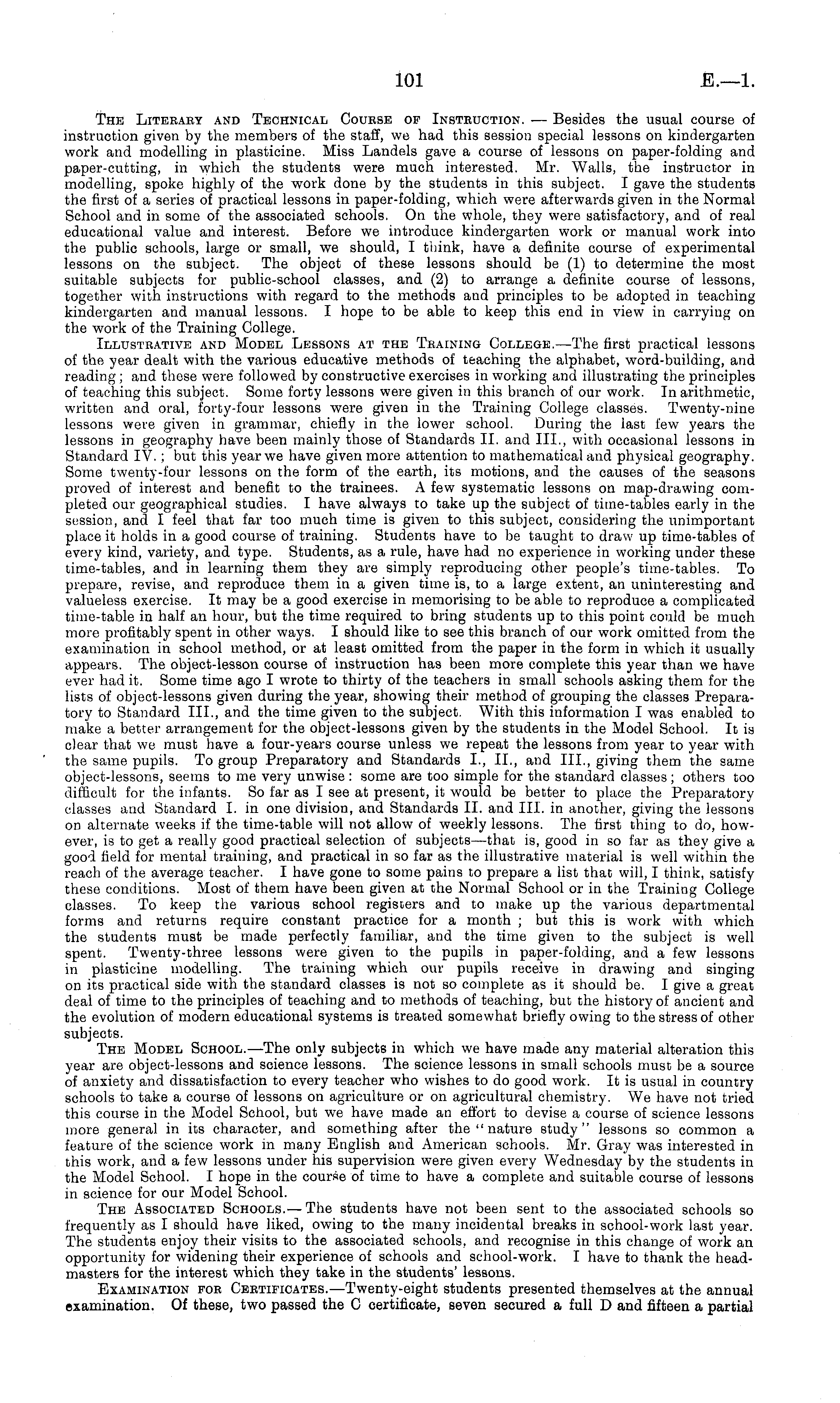 The Literary and Technical Course of Insteuction. — Besides the usual course of instruction given by the members of the staff, we had this session special lessons on kindergarten work and modelling in plasticine. Miss Landels gave a course of lessons on paper-folding and paper-cutting, in which the students were much interested. Mr. Walls, the instructor in modelling, spoke highly of the work done by the students in this subject. I gave the students the first of a series of practical lessons in paper-folding, which were afterwards given in the Normal School and in some of the associated schools. On the whole, they were satisfactory, and of real educational value and interest. Before we introduce kindergarten work or manual work into the public schools, large or small, we should, I t'nink, have a definite course of experimental lessons on the subject. The object of these lessons should be (1) to determine the most suitable subjects for public-school classes, and (2) to arrange a definite course of lessons, together with instructions with regard to the methods and principles to be adopted in teaching kindergarten and manual lessons. I hope to be able to keep this end in view in carrying on the work of the Training College. Illustrative and Model Lessons at the Training College.—The first practical lessons of the year dealt with the various educative methods of teaching the alphabet, word-building, and reading; and these were followed by constructive exercises in working and illustrating the principles of teaching this subject. Some forty leesons were given in this branch of our work. In arithmetic, written and oral, forty-four lessons were given in the Training College classes. Twenty-nine lessons were given in grammar, chiefly in the lower school. During the last few years the lessons in geography have been mainly those of Standards 11. and 111., with occasional lessons in Standard IV.; but this year we have given more attention to mathematical and physical geography. Some twenty-four lessons on the form of the earth, its motions, and the causes of the seasons proved of interest and benefit to the trainees. A few systematic lessons on map-drawing completed our geographical studies. I have always to take up the subject of time-tables early in the session, and I feel that far too much time is given to this subject, considering the unimportant place it holds in a good course of training. Students have to be taught to draw up time-tables of every kind, variety, and type. Students, as a rule, have had no experience in working under these time-tables, and in learning them they are simply reproducing other people's time-tables. To prepare, revise, and reproduce them in a given time is, to a large extent, an uninteresting and valueless exercise. It may be a good exercise in memorising to be able to reproduce a complicated time-table in half an hour, but the time required to bring students up to this point could be much more profitably spent in other ways. I should like to see this branch of our work omitted from the examination in school method, or at least omitted from the paper in the form in which it usually appears. The object-lesson course of instruction has been more complete this year than we have ever had it. Some time ago I wrote to thirty of the teachers in small schools asking them for the lists of object-lessons given during the year, showing their method of grouping the classes Preparatory to Standard 111., and the time given to the subject. With this information I was enabled to make a better arrangement for the object-lessons given by the students in the Model School. It is clear that we must have a four-years course unless we repeat the lessons from year to year with the same pupils. To group Preparatory and Standards 1., 11., and 111., giving them the same object-lessons, seems to me very unwise : some are too simple for the standard classes; others too difficult for the infants. So far as I see at present, it would be better to place the Preparatory classes and Standard I. in one division, and Standards 11. and 111. in another, giving the lessons on alternate weeks if the time-table will not allow of weekly lessons. The first thing to do, however, is to get a really good practical selection of subjects—that is, good in so far as they give a good field for mental training, and practical in so far as the illustrative material is well within the reach of the average teacher. I have gone to some pains to prepare a list that will, I think, satisfy these conditions. Most of them have been given at the Normal School or in the Training College classes. To keep the various school registers and to make up the various departmental forms and returns require constant practice for a month ; but this is work with which the students must be made perfectly familiar, and the time given to the subject is well spent. Twenty-three lessons were given to the pupils in paper-folding, and a few lessons in plasticine modelling. The training which our pupils receive in drawing and singing on its practical side with the standard classes is not so complete as it should be. I give a great deal of time to the principles of teaching and to methods of teaching, but the history of ancient and the evolution of modern educational systems is treated somewhat briefly owing to the stress of other subjects. The Model School.—The only subjects in which we have made any material alteration this year are object-lessons and science lessons. The science lessons in small schools must be a source of anxiety and dissatisfaction to every teacher who wishes to do good work. It is usual in country schools to take a course of lessons on agriculture or on agricultural chemistry. We have not tried this course in the Model School, but we have made an effort to devise a course of science lessons more general in its character, and something after the " nature study" lessons so common a feature of the science work in many Engli