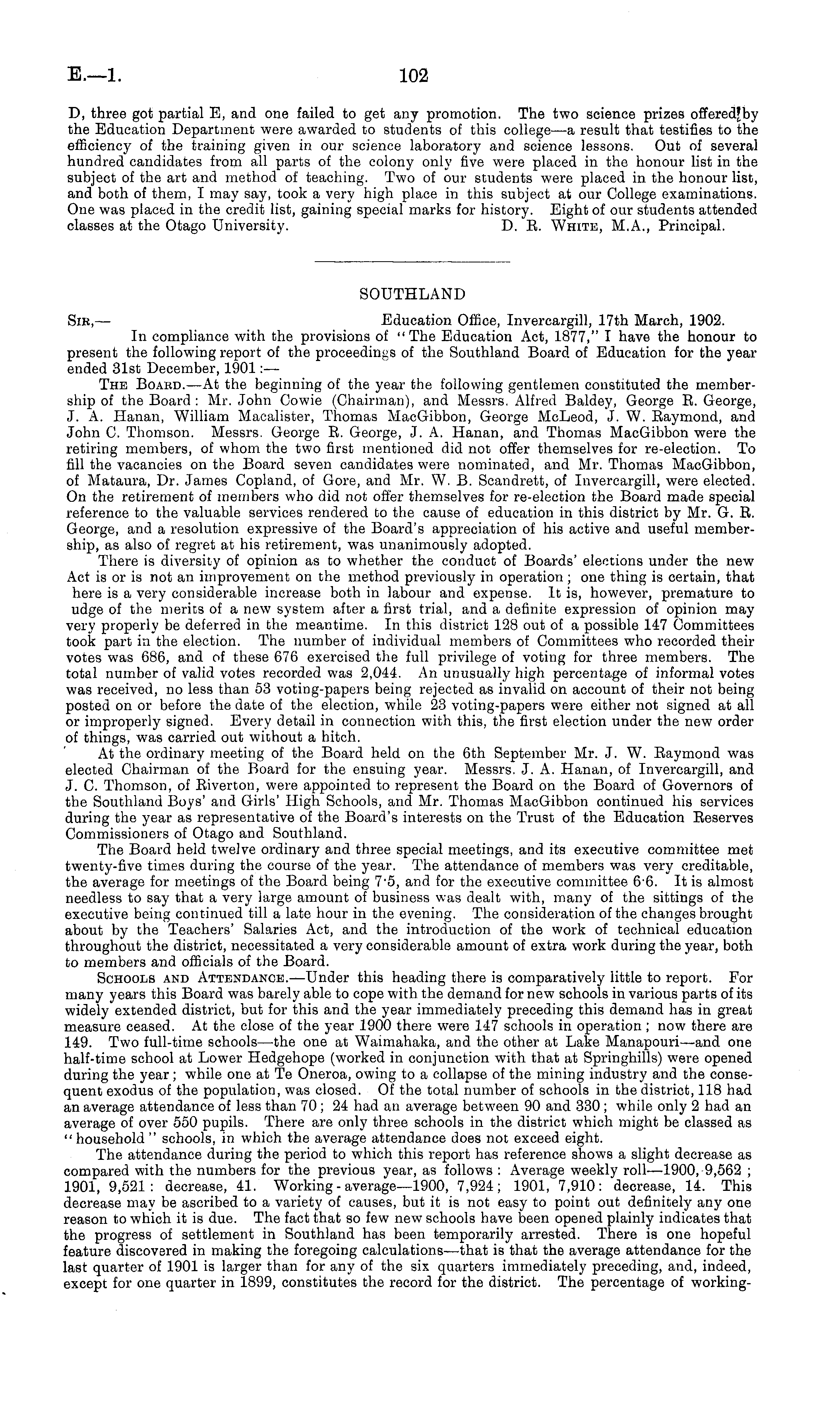 SOUTHLAND Sib, — Education Office, Invercargill, 17th March, 1902. In compliance with the provisions of "The Education Act, 1877," I have the honour to present the following report of the proceedings of the Southland Board of Education for the year ended 31st December, 1901: — The Boakd.—At the beginning of the year the following gentlemen constituted the membership of the Board : Mr. John Cowie (Chairman), and Messrs. Alfred Baldey, George B. George, J. A. Hanan, William Macalister, Thomas Mac Gibbon, George McLeod, J. W. Eaymond, and John C. Thomson. Messrs. George E. George, J. A. Hanan, and Thomas Mac Gibbon were the retiring members, of whom the two first mentioned did not offer themselves for re-election. To fill the vacancies on the Board seven candidates were nominated, and Mr. Thomas Mac Gibbon, of Mataura, Dr. James Copland, of Gore, and Mr. W. B. Scandrett, of Invercargill, were elected. On the retirement of members who did not offer themselves for re-election the Board made special reference to the valuable services rendered to the cause of education in this district by Mr. G. E. George, and a resolution expressive of the Board's appreciation of his active and useful membership, as also of regret at his retirement, was unanimously adopted. There is diversity of opinion as to whether the conduct of Boards' elections under the new Act is or is not an improvement on the method previously in operation ; one thing is certain, that here is a very considerable increase both in labour and expense. It is, however, premature to udge of the merits of a new system after a first trial, and a definite expression of opinion may very properly be deferred in the meantime. In this district 128 out of a possible 147 Committees took part in the election. The number of individual members of Committees who recorded their votes was 686, and of these 676 exercised the full privilege of voting for three members. The total number of valid votes recorded was 2,044. An unusually high percentage of informal votes was received, no less than 53 voting-papers being rejected as invalid on account of their not being posted on or before the date of the election, while 23 voting-papers were either not signed at all or improperly signed. Every detail in connection with this, the first election under the new order of things, was carried out without a hitch. At the ordinary meeting of the Board held on the 6th September Mr. J. W. Eaymond was elected Chairman of the Board for the ensuing year. Messrs. J. A. Hanan, of Invercargill, and J. C. Thomson, of Eiverton, were appointed to represent the Board on the Board of Governors of the Southland Boys' and Girls' High Schools, and Mr. Thomas Mac Gibbon continued his services during the year as representative of the Board's interests on the Trust of the Education Eeserves Commissioners of Otago and Southland. The Board held twelve ordinary and three special meetings, and its executive committee met twenty-five times during the course of the year. The attendance of members was very creditable, the average for meetings of the Board being 75, and for the executive committee 66. It is almost needless to say that a very large amount of business was dealt with, many of the sittings of the executive being continued till a late hour in the evening. The consideration of the changes brought about by the Teachers' Salaries Act, and the introduction of the work of technical education throughout the district, necessitated a very considerable amount of extra work during the year, both to members and officials of the Board. Schools and Attendance. —"Under this heading there is comparatively little to report. For many years this Board was barely able to cope with the demand for new schools in various parts of its widely extended district, but for this and the year immediately preceding this demand has in great measure ceased. At the close of the year 1900 there were 147 schools in operation ; now there are 149. Two full-time schools—the one at Waimahaka, and the other at Lake Manapouri—and one half-time school at Lower Hedgehope (worked in conjunction with that at Springhills) were opened during the year; while one at Te Oneroa, owing to a collapse of the mining industry and the consequent exodus of the population, was closed. Of the total number of schools in the district, 118 had an average attendance of less than 70 ; 24 had an average between 90 and 330 ; while only 2 had an average of over 550 pupils. There are only three schools in the district which might be classed as "household " schools, in which the average attendance does not exceed eight. The attendance during the period to which this report has reference shows a slight decrease as compared with the numbers for the previous year, as follows : Average weekly roll—l9oo, 9,562 ; 1901, 9,521: decrease, 41. Working - average—l9oo, 7,924; 1901, 7,910: decrease, 14. This decrease may be ascribed to a variety of causes, but it is not easy to point out definitely any one reason to which it is due. The fact that so few new schools have been opened plainly indicates that the progress of settlement in Southland has been temporarily arrested. There is one hopeful feature discovered in making the foregoing calculations—that is that the average attendance for the last quarter of 1901 is larger than for any of the six quarters immediately preceding, and, indeed, except for one quarter in 1899, constitutes the record for the district. The percentage of working-