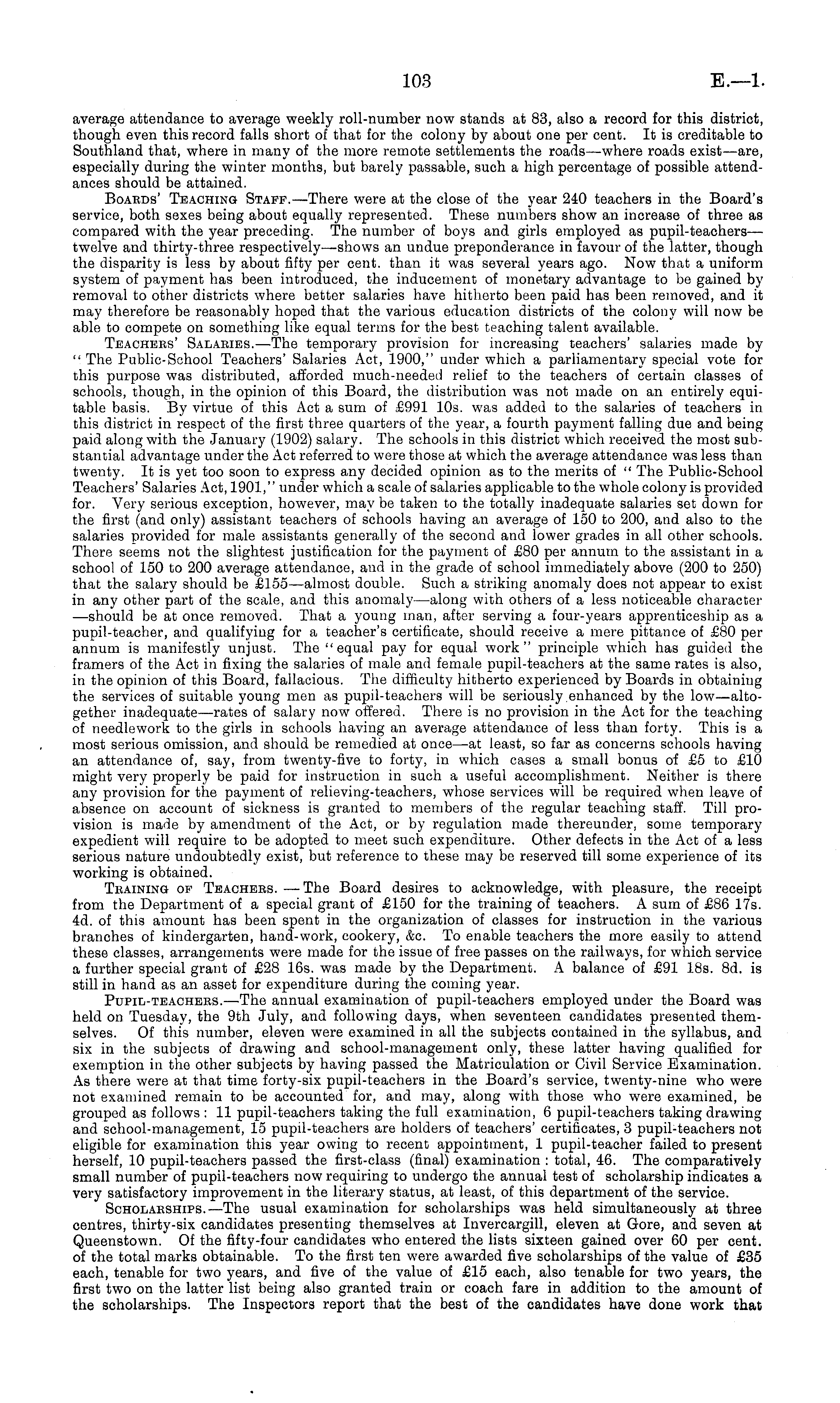 average attendance to average weekly roll-number now stands at 83, also a record for this district, though even this record falls short of that for the colony by about one per cent. It is creditable to Southland that, where in many of the more remote settlements the roads—where roads exist—are, especially during the winter months, but barely passable, such a high percentage of possible attendances should be attained. Boaeds' Teaching Staff.—There were at the close of the year 240 teachers in the Board's service, both sexes being about equally represented. These numbers show an increase of three as compared with the year preceding. The number of boys and girls employed as pupil-teachers— twelve and thirty-three respectively—shows an undue preponderance in favour of the latter, though the disparity is less by about fifty per cent, than it was several years ago. Now that a uniform system of payment has been introduced, the inducement of monetary advantage to be gained by removal to other districts where better salaries have hitherto been paid has been removed, and it may therefore be reasonably hoped that the various education districts of the colony will now be able to compete on something like equal terms for the best teaching talent available. Teaohbes' Salaries.—The temporary provision for increasing teachers' salaries made by " The Public-School Teachers' Salaries Act, 1900," under which a parliamentary special vote for this purpose was distributed, afforded much-needed relief to the teachers of certain classes of schools, though, in the opinion of this Board, the distribution was not made on an entirely equitable basis. By virtue of this Act a sum of £991 10s. was added to the salaries of teachers in this district in respect of the first three quarters of the year, a fourth payment falling due and being paid along with the January (1902) salary. The schools in this district which received the most substantial advantage under the Act referred to were those at which the average attendance was less than twenty. It is yet too soon to express any decided opinion as to the merits of " The Public-School Teachers' Salaries Act, 1901," under which a scale of salaries applicable to the whole colony is provided for. Very serious exception, however, may be taken to the totally inadequate salaries set down for the first (and only) assistant teachers of schools having an average of 150 to 200, and also to the salaries provided for male assistants generally of the second and lower grades in all other schools. There seems not the slightest justification for the payment of £80 per annum to the assistant in a school of 150 to 200 average attendance, and in the grade of school immediately above (200 to 250) that the salary should be £155—almost double. Such a striking anomaly does not appear to exist in any other part of the scale, and this anomaly—along with others of a less noticeable character —should be at once removed. That a young man, after serving a four-years apprenticeship as a pupil-teacher, and qualifying for a teacher's certificate, should receive a mere pittance of £80 per annum is manifestly unjust. The "equal pay for equal work" principle which has guided the framers of the Act in fixing the salaries of male and female pupil-teachers at the same rates is also, in the opinion of this Board, fallacious. The difficulty hitherto experienced by Boards in obtaining the services of suitable young men as pupil-teachers will be seriously enhanced by the low—altogether inadequate —rates of salary now offered. There is no provision in the Act for the teaching of needlework to the girls in schools having an average attendance of less than forty. This is a most serious omission, and should be remedied at onee —at least, so far as concerns schools having an attendance of, say, from twenty-five to forty, in which cases a small bonus of £5 to £10 might very properly be paid for instruction in such a useful accomplishment. Neither is there any provision for the payment of relieving-teachers, whose services will be required when leave of absence on account of sickness is granted to members of the regular teaching staff. Till provision is made by amendment of the Act, or by regulation made thereunder, some temporary expedient will require to be adopted to meet such expenditure. Other defects in the Act of a less serious nature undoubtedly exist, but reference to these may be reserved till some experience of its working is obtained. Training of Teachers. —The Board desires to acknowledge, with pleasure, the receipt from the Department of a special grant of £150 for the training of teachers. A sum of £86 17s. 4d. of this amount has been spent in the organization of classes for instruction in the various branches of kindergarten, hand-work, cookery, &c. To enable teachers the more easily to attend these classes, arrangements were made for the issue of free passes on the railways, for which service a further special grant of £28 16s. was made by the Department. A balance of £91 18s. Bd. is still in hand as an asset for expenditure during the coming year. Pupil-teachers.—The annual examination of pupil-teachers employed under the Board was held on Tuesday, the 9th July, and following days, when seventeen candidates presented themselves. Of this number, eleven were examined in all the subjects contained in the syllabus, and six in the subjects of drawing and school-management only, these latter having qualified for exemption in the other subjects by having passed the Matriculation or Civil Service Examination. As there were at that time forty-six pupil-teachers in the Board's service, twenty-nine who were not examined remain to be accounted for, and may, along with those who were examined, be grouped as follows : 11 pupil-teachers taking the full examination, 6 pupil-teachers taking drawing and school-management, 15 pupil-teachers are holders of teachers' certificates, 3 pup