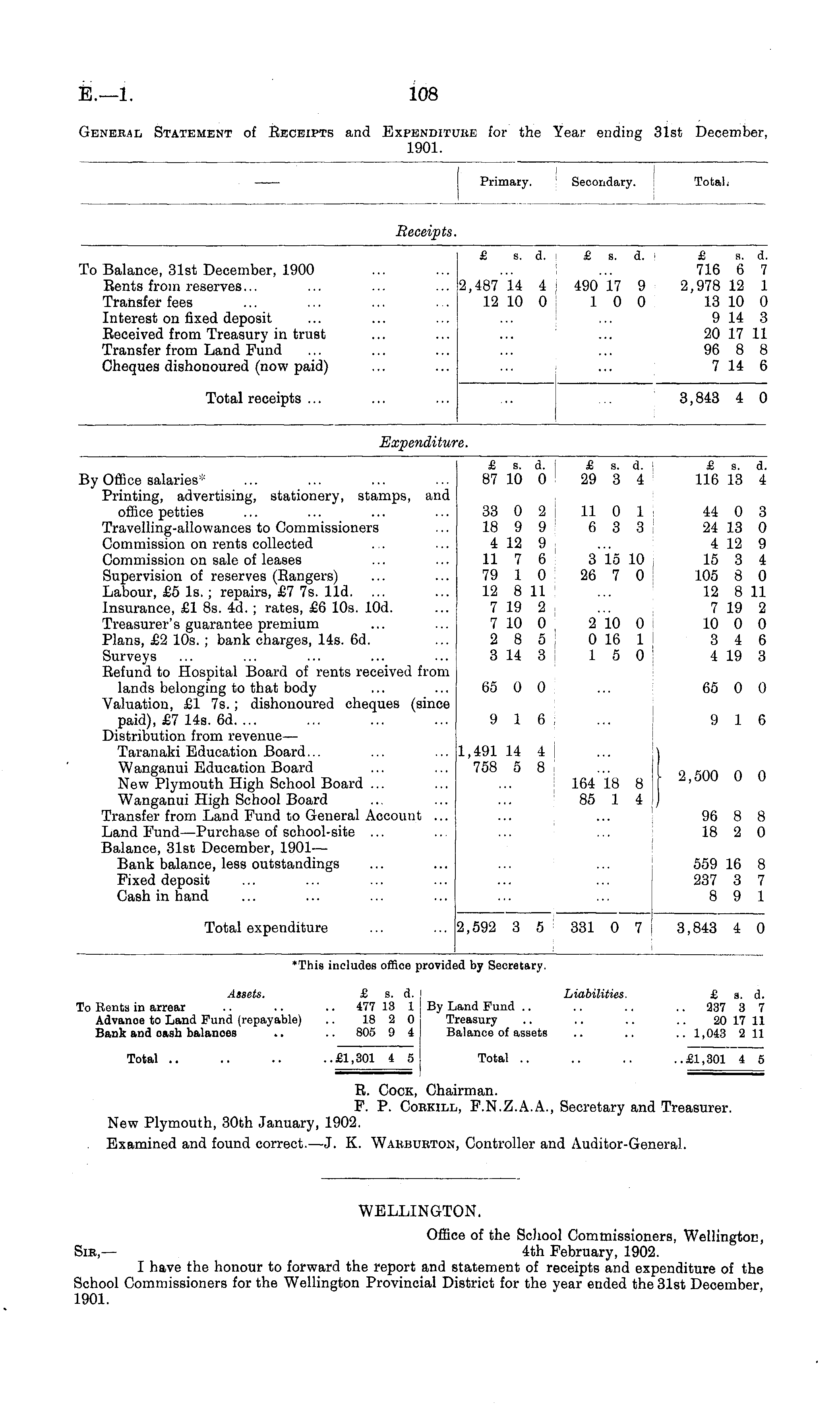 WELLINGTON. Office of the School Commissioners, Wellington, Sm,— 4th February, 1902. I have the honour to forward the report and statement of receipts and expenditure of the School Commissioners for the Wellington Provincial District for the year ended the 31st December, 1901.