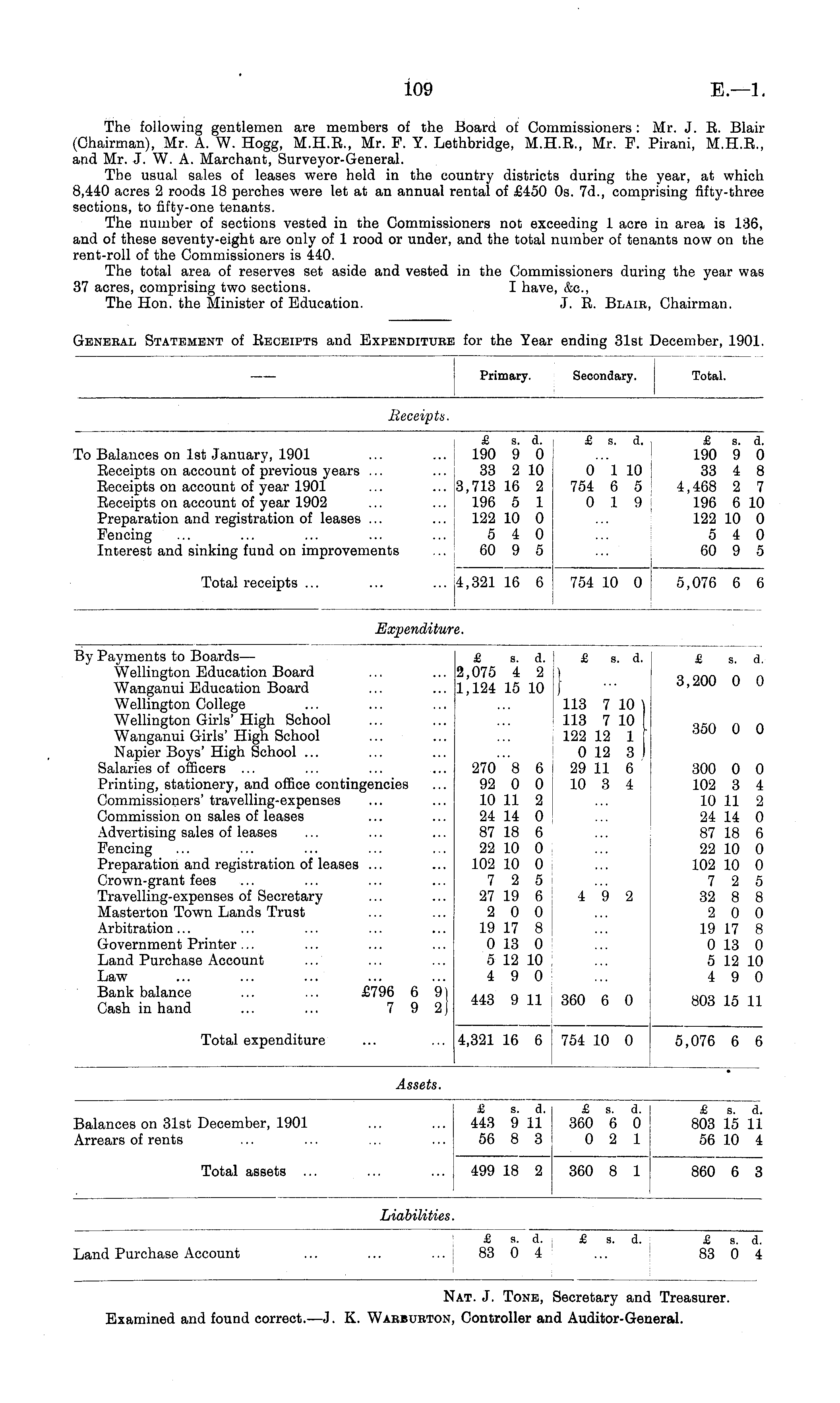 Nat. J. Tone, Secretary and Treasurer. Examined and found correct.— J. K. Warburton, Controller and Auditor-General.