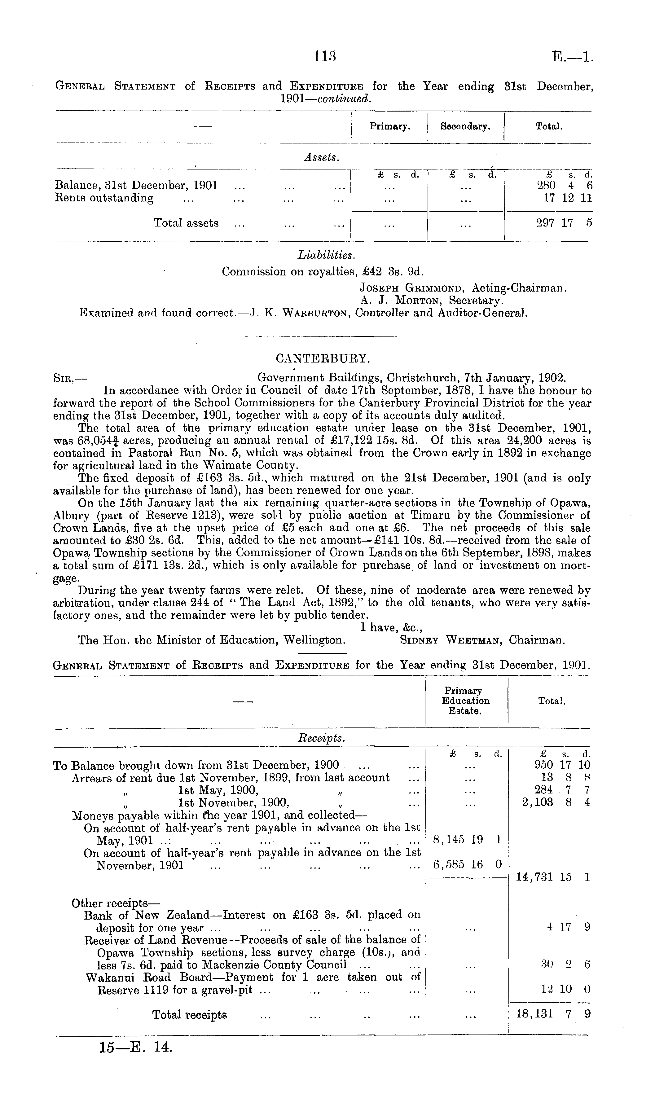 CANTERBURY. Sir, — Government Buildings, Christchurch, 7th January, 1902. In accordance with Order in Council of date 17th September, 1878, I have the honour to forward the report of the School Commissioners for the Canterbury Provincial District for the year ending the 31st December, 1901, together with a copy of its accounts duly audited. The total area of the primary education estate under lease on the 31st December, 1901, was 68,054f acres, producing an annual rental of £17,122 15s. Bd. Of this area 24,200 acres is contained in Pastoral Run No. 5, which was obtained from the Crown early in 1892 in exchange for agricultural land in the Waimate County. The fixed deposit of £163 3s. 5d., which matured on the 21st December, 1901 (and is only available for the purchase of land), has been renewed for one year. On the 15th January last the six remaining quarter-acre sections in the Township of Opawa, Albury (part of Reserve 1213), were sold by public auction at Timaru by the Commissioner of Crown Lands, five at the upset price of £5 each and one at £6. The net proceeds of this sale amounted to £30 2s. 6d. This, added to the net amount—£l4l 10s. Bd.—received from the sale of Opawa Township sections by the Commissioner of Crown Lands on the 6th September, 1898, makes a total sum of £171 13s. 2d., which is only available for purchase of land or investment on gageDuring the year twenty farms were relet. Of these, nine of moderate area were renewed by arbitration, under clause 244 of " The Land Act, 1892," to the old tenants, who were very satisfactory ones, and the remainder were let by public tender. 1 have, &c, The Hon. the Minister of Education, Wellington. Sidney Webtman, Chairman.