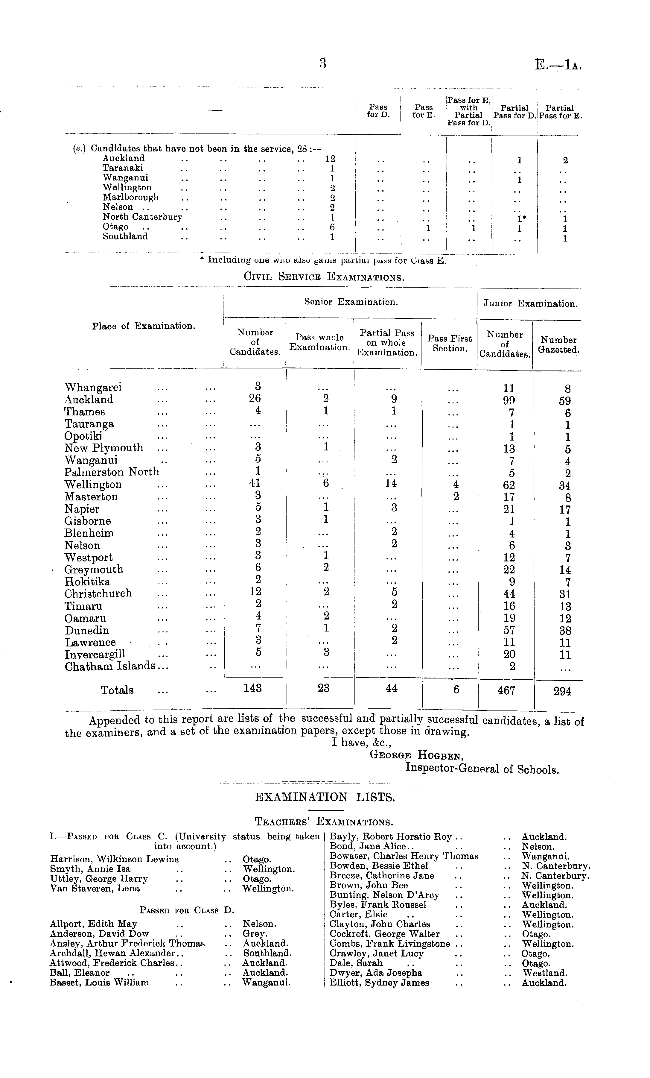 Appended to this report are lists of the successful and partially successful candidates, a list of the examiners, and a set of the examination papers, except those in drawing. I have, &c, Geoege Hogben, Inspector-General of Schools.