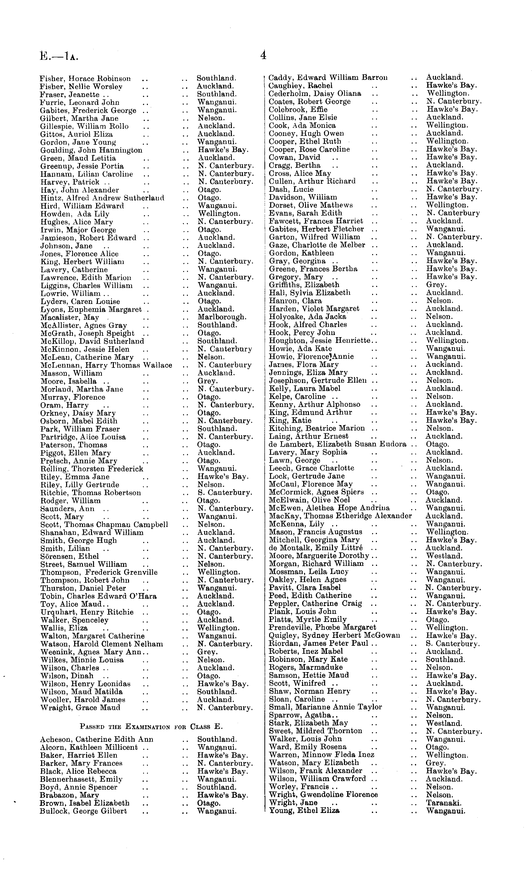 Fisher, Horace Robinson .. .. Southland. Fisher, Nellie Worsley .. .. Auckland. Fraser, Jeanette .. .. .. Southland. Furrie, Leonard John .. .. Wanganui. Gabites, Frederick George .. .. Wanganui. Gilbert, Martha Jane .. .. Nelson. Gillespie. William Rollo .. .. Auckland. Gittos, Auriol Eliza .. .. Auckland. Gordon, Jane Young .. .. Wanganui. Goulding, John Hannington .. Hawke's Bay. Green, Maud Letitia .. .. Auckland. Greenup, Jessie Portia .. .. N. Canterbury. Hannam, Lilian Caroline .. .. N. Canterbury. Harvey, Patrick .. .. .. N. Canterbury. Hay, John Alexander .. .. Otago. Hintz, Alfred Andrew Sutherland .. Otago. Hird, William Edward .. .. Wanganui. Howden, Ada Lily .. .. Wellington. Hughes, Alice Mary .. .. N. Canterbury. Irwin, Major George .. .. Otago. Jamieson, Robert Edward .. .. Auckland. Johnson, Jane .. .. .. Auckland. Jones, Florence Alice .. .. Otago. King, Herbert William .. .. N. Canterbury. I.a very, Catherine .. .. Wanganui. Lawrence, Edith Marion .. .. N. Canterbury. Liggins, Charles William .. .. Wanganui. Lowrie, William .. .. .. Auckland. Lyders, Caren Louise .. .. Otago. Lyons, Euphemia Margaret . .. Auckland. Macalister, May , .. .. Marlborough. McAllister, Agnes Gray .. .. Southland. McGrath, Joseph Speight .. .. Otago. McKillop, David Sutherland .. Southland. McKinnon, Jessie Helen .. .. N. Canterbury McLean, Catherine Mary .. .. Nelson. McLenuan, Harry Thomas Wallace .. N. Canterbury Masson, William .. .. Auckland. Moore, Isabella .. .. .. Grey. Morlaud, Martha Jane .. .. N.Canterbury. Murray, Florence .. .. Otago. Oram, Harry .. .. .. N. Canterbury. Orkney, Daisy Mary .. .. Otago. Osborn, Mabel Edith .. .. N.Canterbury. Park, William Fraser .. .. Southland. Partridge, Aiice Louisa .. .. N. Canterbury. Paterson, Thomas .. .. Otago. Piggot, Ellen Mary .. .. Auckland. Pretsch, Annie Mary .. .. Otago. Belling, Thorsten Frederick .. Wanganui. Riley, Emma Jane .. .. Hawke's Bay. Riley, Lilly Gertrude .. .. Nelson. Ritchie, Thomas Robertson .. S. Canterbury. Rodger, William .. .. Otago. Saunders, Ann .. .. .. N. Canterbury. Scott, Mary .. .. .. Wanganui. Scott, Thomas Chapman Campbell .. Nelson. Shanahau, Edward William .. Auckland. Smith, George Hugh .. .. Auckland. Smith, Lilian .. .. .. N. Canterbury. Sorensen, Ethel .. .. N. Canterbury. Street, Samuel William .. .. Nelson. Thompson, Frederick Grenville .. Wellington. Thompson, Robert John .. .. N. Canterbury. Thurston, Daniel Peter .. .. Wanganui. Tobin, Charles Edward O'Hara .. Auckland. Toy, Alice Maud.. .. .. Auckland. Urquhart, Henry Ritchie .. .. Otago. Walker, Spenceley .. .. Auckland. Wallis, Eliza .. .. .. Wellington. Walton, Margaret Catherine .. Wanganui. Watson, Harold Clement Nelham .. N. Canterbury. Weenink, Agnes Mary Ann.. .. Grey. Wilkes, Minnie Louisa .. .. Nelson. Wilson, Charles .. .. .. Auckland. Wilson, Dinah .. .. .. Otago. Wilson, Henry Leonidas .. .. Hawke's Bay. Wilson, Maud Matilda .. .. Southland. Wooller, Harold James .. .. Auckland. Wraight, Grace Maud .. .. N. Canterbury. Passed the Examination fob Class E. Acheson, Catherine Edith Ann .. Southland. Alcorn, Kathleen Millicent .. .. Wanganui. Baker, Harriet Ellen .. .. Hawke's Bay. Barker, Mary Frances .. .. N. Canterbury. Black, Alice Rebecca .. .. Hawke's Bay. Blennerhassett, Emily .. .. Wanganui. Boyd, Annie Spencer .. .. Southland. Brabazon, Mary .. .. Hawke's Bay. Brown, Isabel Elizabeth .. .. Otago. Bullock, George Gilbert .. .. Wanganui.