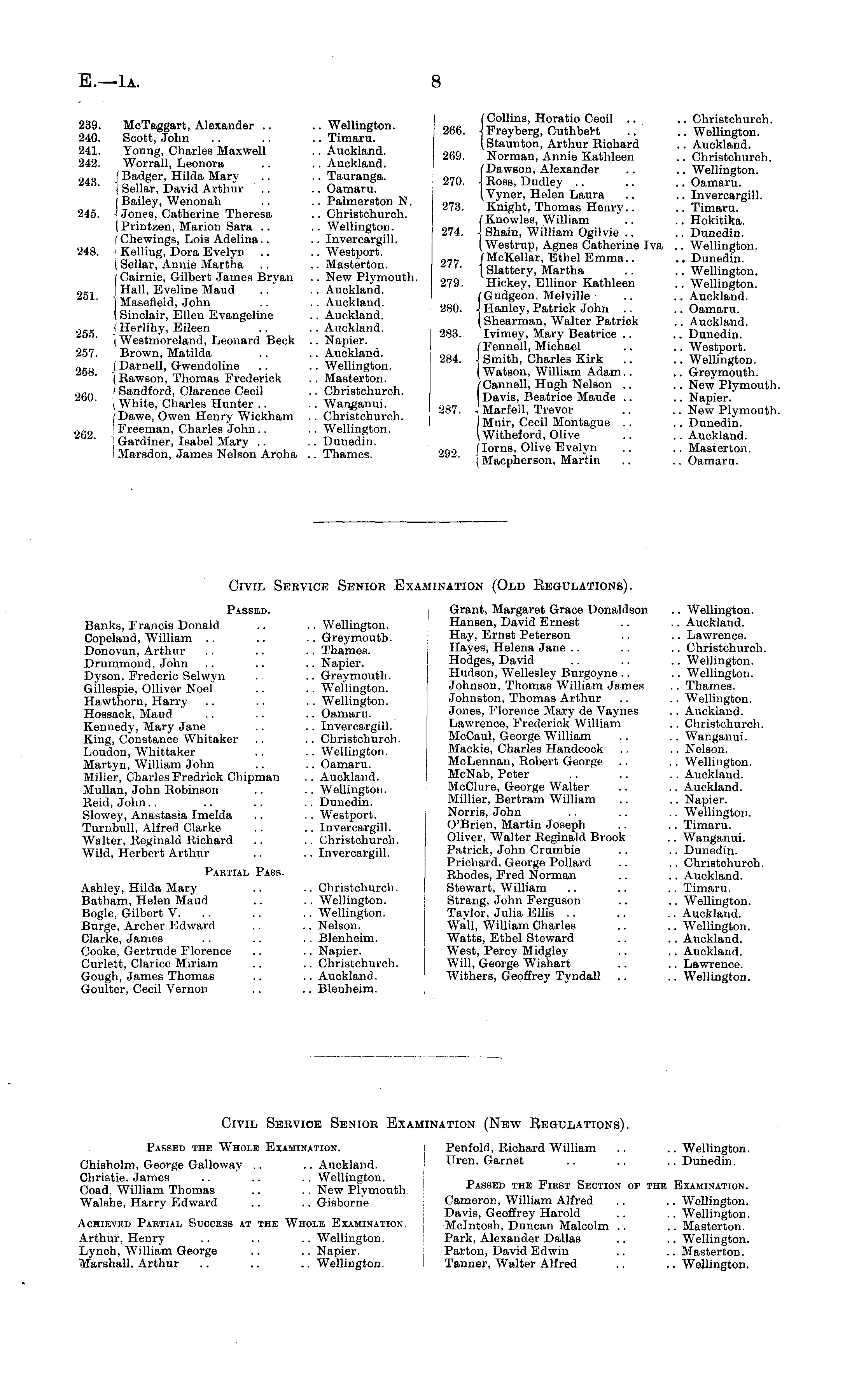 Civil Service Senior Examination (Old Eegulations). Passed. i Grant, Margaret Grace Donaldson .. Wellington. Banks, Francis Donald .. ..Wellington. Hansen, David Ernest .. ..Auckland. Copeland, William .. .. .. Grevmouth. Hay, Ernst Peterson .. ..Lawrence. Donovan, Arthur .. .. ..Thames. Hayes, Helena Jane .. .. ..Christchurch. Drummond, John .. .. .. Napier. Hodges, David .. .. .. Wellington. Dyson, Frederic Selwyn . .. Greymouth. Hudson, Wellesley Burgoyne .. .. Wellington. Gillespie, Olliver Noel .. .. Wellington. Johnson, Thomas William James .. Thames. Hawthorn, Harry .. .. .. Wellington. Johnston, Thomas Arthur .. .. Wellington. Hossack. Maud " .. .. .. Oamaru. Jones, Florence Mary de Vaynes .. Auckland. Kennedy, Mary Jane .. ..Invercargill. Lawrence, Frederick William ..Christchurch. King, Constance Whitaker .. ..Christchurch. McCaul, George William .. ..Wanganui. Loudon, Whittaker .. .. Wellington. Mackie, Charles Handcock .. .. Nelson. Martyn, William John .. .. Oamaru. McLennan, Robert George .. .. Wellington. Miller, Charles Fredrick Chipman ..Auckland. McNab, Peter .. .. ..Auckland. Mullan, John Robinson .. ..Wellington. McClure, George Walter .. ..Auckland. Reid, John.. .. .. ..Dunedin. Milher, Bertram William .. ..Napier. Slowey, Anastasia Imelda .. .. W 7 estport. Norris, John .. .. ..Wellington. Turnbull, Alfred Clarke .. .. Invercargill. O'Brien, Martin Joseph .. .. Timaru. Walter, Reginald Richard .. ..Christchurch. Oliver, Walter Reginald Brook ..Wanganui. Wild, Herbert Arthur .. ..Invercargill. Patrick, John Crumble .. ..Dunedin. Prichard, George Pollard .. .. Christchurch. Paetial Pass. Rhodes, Fred Norman .. .. Auckland. Ashley, Hilda Mary .. .. Christchurch. Stewart, William .. .. .. Timaru. Batham, Helen Maud .. .. Wellington. Strang, John Ferguson .. .. Wellington. Bogle, Gilbert V. .. .. .. Wellington. Taylor, Julia Ellis .. .. .. Auckland. Burge, Archer Edward .. .. Nelson. Wall, William Charles .. .. Wellington. Clarke, James .. .. .. Blenheim. Watts, Ethel Steward .. ..Auckland. Cooke, Gertrude Florence .. .. Napier. West, Percy Midgley .. .. Auckland. Curlett, Clarice Miriam .. .. Christchurch. Will, George Wishart .. .. Lawrence. Gough, James Thomas .. ..Auckland. Withers, Geoffrey Tyndall .. .. Wellington. Goulter, Cecil Vernon .. .. Blenheim.