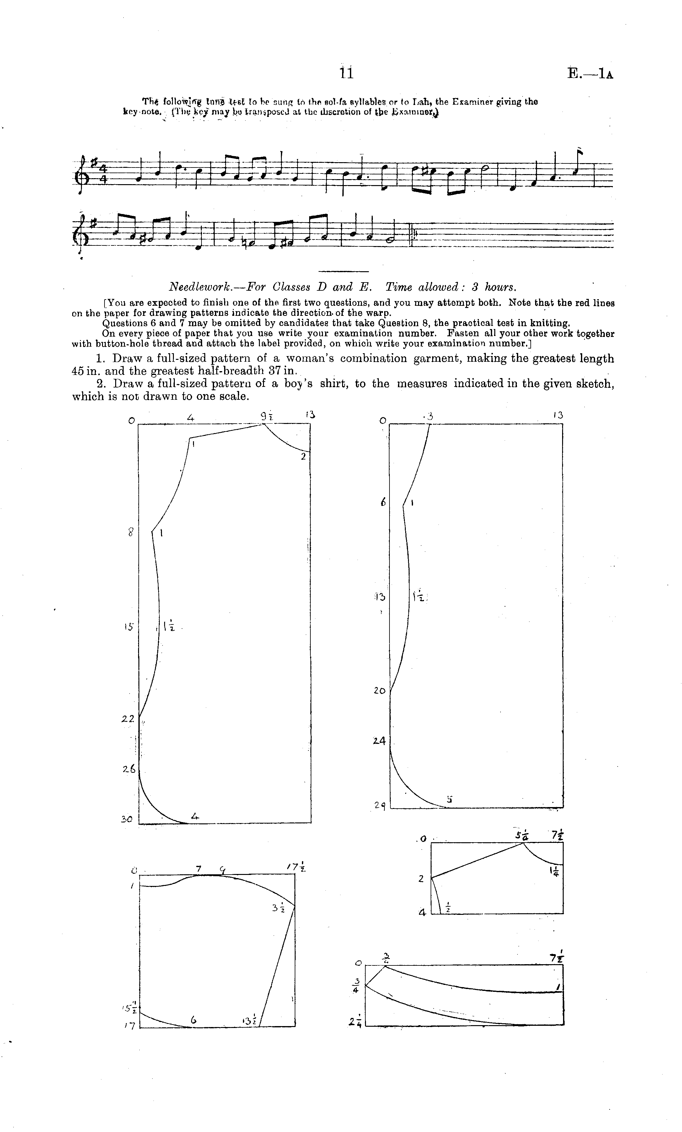 Needlework. — For Classes D and E. Time alloived: 3 hours. [You are expected to finish one of the first two questions, and you may attempt both. Note that the red lines on the paper for drawing patterns indicate the direction of the warp. Questions 6 and 7 may be omitted by candidates that take Question 8, the praotical test in knitting. On every piece of paper that you use write your examination number. Fasten all your other work together with button-hole thread and attach the label provided, on which write your examination number.] 1. Draw a full-sized pattern of a woman's combination garment, making the greatest length 45 in. and the greatest half-breadth 37 in. 2. Draw a full-sized pattern of a boy's shirt, to the measures indicated in the given sketch, which is not drawn to one scale.