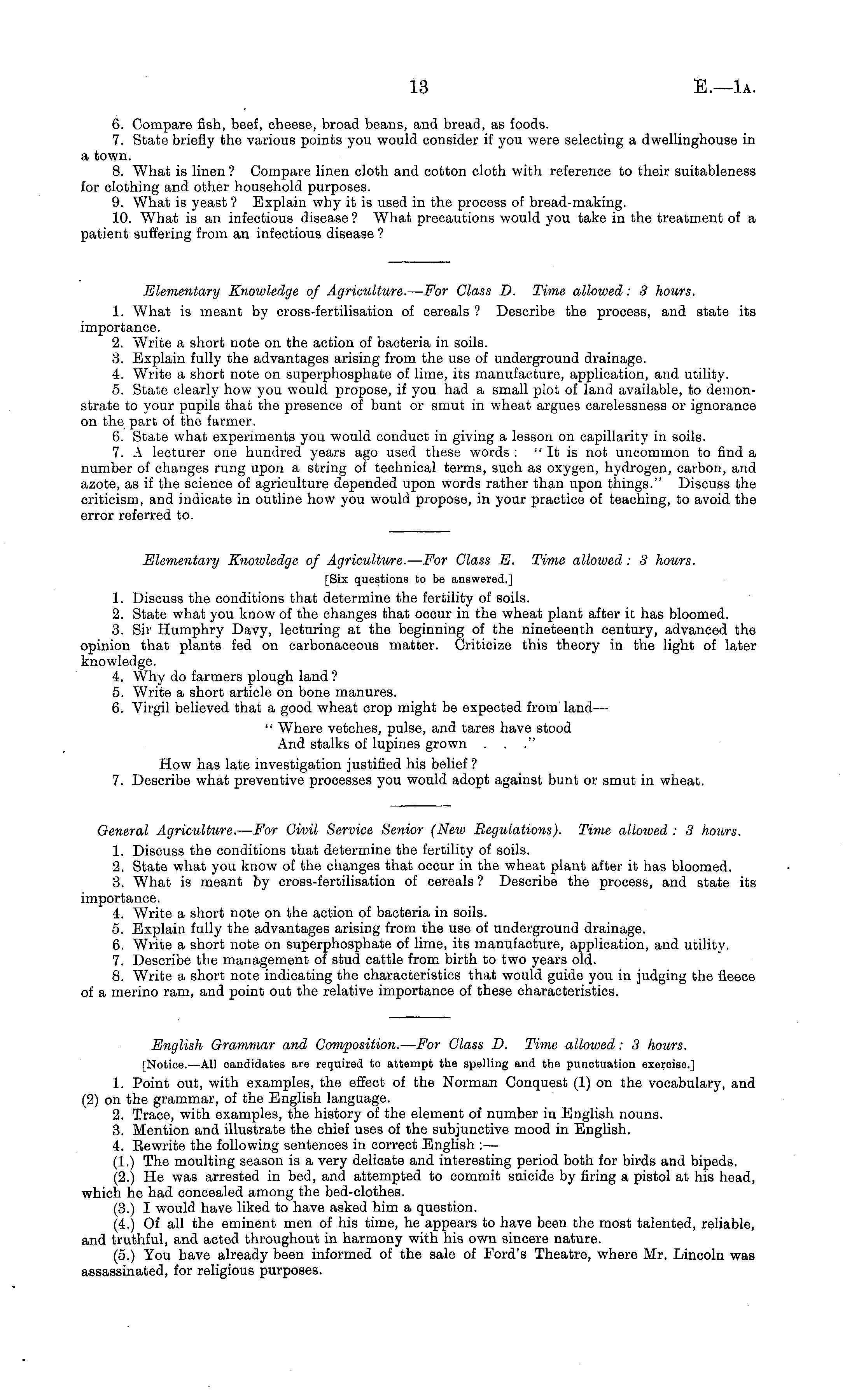 Elementary Knowledge of Agriculture. — For Class D. Time allowed: 3 hours. 1. What is meant by cross-fertilisation of cereals ? Describe the process, and state its importance. 2. Write a short note on the action of bacteria in soils. 3. Explain fully the advantages arising from the use of underground drainage. 4. Write a short note on superphosphate of lime, its manufacture, application, and utility. 5. State clearly how you would propose, if you had a small plot of land available, to demonstrate to your pupils that the presence of bunt or smut in wheat argues carelessness or ignorance on the part of the farmer. 6. State what experiments you would conduct in giving a lesson on capillarity in soils. 7. A lecturer one hundred years ago used these words : "It is not uncommon to find a number of changes rung upon a string of technical terms, such as oxygen, hydrogen, carbon, and azote, as if the science of agriculture depended upon words rather than upon things." Discuss the criticism, and indicate in outline how you would propose, in your practice of teaching, to avoid the error referred to.
