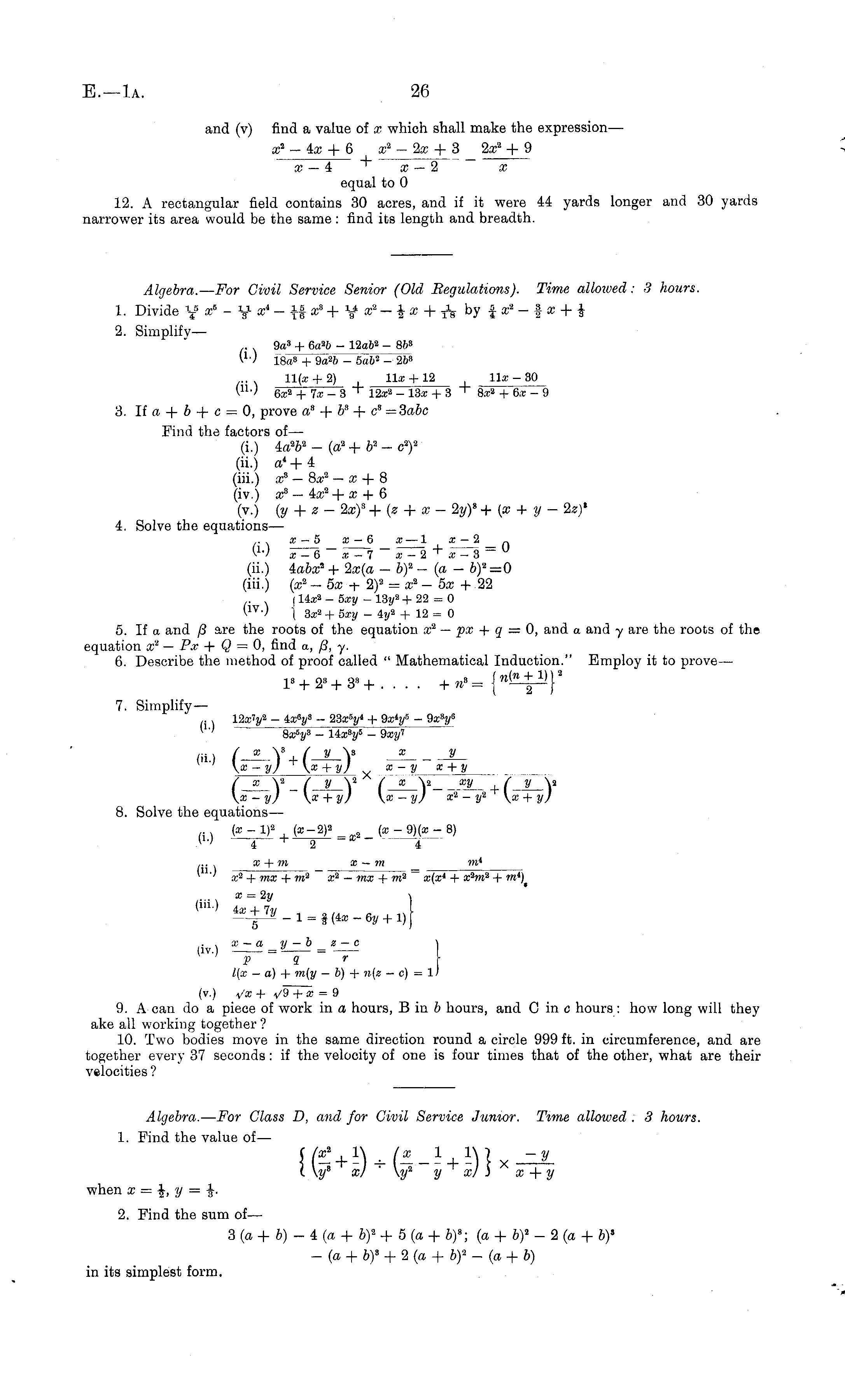 Algebra. — For Civil Service Senior (Old Regulations). Time alloived : 3 hours. 1. Divide \* x* -y * 4 -tI * 8 +V**- i x + A b Y t&~f x + i 2. Simplify— 9a 3 + 6a 2 6 - 12a& 2 - 8/) 3 V-> 18a" + 9a*b - 5ab 2 - 2b* ... . ll(a; + 2) 11a; + 12 11a; - 30 ("•) 6a; 2 + 7.r -3 + 12a; 2 - l&r + 3 + 8.r 2 + 6,r - 9 3. If a + b + c = 0, prove a s + b" + c" =3a6c Find the factors of — (i.) 4a 2 6 2 - (a 2 +b2 - c 2) 2 (ii.) a 4 + 4 (iii.) X s - 8x 2 -x + 8 (iv.) a; 8 — 4a; 2 +x + 6 (v.) (y +z - 2a;) 3 +(z+ x - 2?/) 8 +(x+ y - 2z)' 4. Solve the equations— . x— 5 a; —6 a; — 1 x— 2 .. W ~ x~-'l ~ x -2 + x- 3 = U (ii.) 4ate 2 + 2x(a -bf-(a- bf =0 (iii.) (a; 2 - sa; + 2) 2 = a; 2 - sa; +22 ( 14a; 2 - sxy - 13;/ 2 + 22 = 0 V lV ') \ 3a; 2 + sxy - iy 2 + 12 = 0 5. If a and /3 are the roots of the equation x 2 — px + q = 0, and a and y are the roots of the equation x 2 — P.r + Q = 0, find a, /3, y. 6. Describe the method of proof called " Mathematical Induction." Employ it to prove— !'+»+»+. .. . +w . = {«i!L|i)( a 7. Simplify — (i 1 123% 2 - 4a 6 ;/ 3 - gSa: 5 ;/ 4 + 9x*y 5 - 9a: 3 ;/ 6 I■' ~~ 8x 6 y s - Ha; 8 ?/ 5 - 9xjf ( ii.) C_£.Y + C_IL.V _■ V— \x -yj \g +y/ x x-y a+j \* - 2// V* + 2// \ x -y) * a ~ 2/ 2 V* + ?// 8. Solve the equations — fit («-!)' , (»-2)' -. (as - 9)(* -8) .... a; + to a; — m ra 4 v ' a; 2 +mx+ m 2 a; 2 -mx+ m 2 x(a: 4 + x 2 m 2 + m 4) a; = 2j/ n ( m ) 4a; + 7« ( iv.) ) p 2 »■ r i(a - a) + m(j/ - o) + »(* — c) = lJ (v.) v"a; +V9+a; = 9 9. A can do a piece of work in a hours, B in b hours, and C in c hours : how long will they ake all working together ? 10. Two bodies move in the same direction round a circle 999 ft. in circumference, and are together every 37 seconds : if the velocity of one is four times that of the other, what are their velocities ?