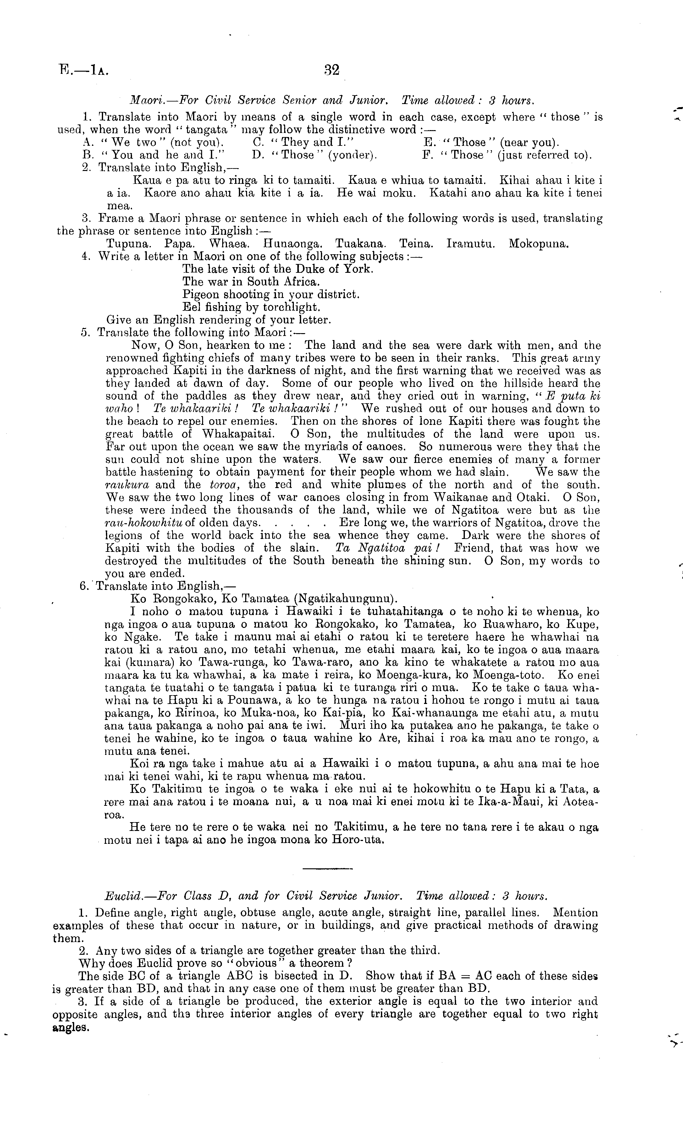 Maori. — For Civil Service Senior and Junior. Time allowed : 3 hours. 1. Translate into Maori by means of a single word in each case, except where " those " is used, when the word " tangata " may follow the distinctive word :— A. "We two " (not you). C. " They and I." E. " Those " (near you). B. "You and he and I." D. "Those" (yonder). F. "Those" (just referred to). 2. Translate into English,— Kaua epa atu to ringa ki to tamaiti. Kaua c whiua to tamaiti. Kihai ahau i kite i a ia. Kaore ano ahau kia kite i a ia. He wai moku. Katahi ano ahau ka kite i tenei mea. 3. Frame a Maori phrase or sentence in which each of the following words is used, translating the phrase or sentence into English :— Tupuna. Papa. Whaea. Hunaonga. Tuakana. Teina. Iramutu. Mokopuna. 4. Write a letter in Maori on one of the following subjects : — The late visit of the Duke of York. The war in South Africa. Pigeon shooting in your district. Eel fishing by torchlight. Give an English rendering of your letter. 5. Translate the following into Maori : — Now, 0 Son, hearken to me : The land and the sea were dark with men, and the renowned fighting chiefs of many tribes were to be seen in their ranks. This great army approached Kapiti iv the darkness of night, and the first warning that we received was as they landed at dawn of day. Some of our people who lived on the hillside heard the sound of the paddles as they drew near, and they cried out in warning, " E puta ki wahol Te whakaariki! Te whakaariki ! " We rushed out of our houses and down to the beach to repel our enemies. Then on the shores of lone Kapiti there was fought the great battle of Whakapaitai. 0 Son, the multitudes of the land were upon us. Far out upon the ocean we saw the myriads of canoes. So numerous were they that the sun could not shine upon the waters. We saw our fierce enemies of many a former battle hastening to obtain payment for their people whom we had slain. We saw the raukura and the toroa, the red and white plumes of the north and of the south. We saw the two long lines of war canoes closing in from Waikanae and Otaki. 0 Son, these were indeed the thousands of the land, while we of Ngatitoa were but as the rau-hokoivhitu of olden days Ere long we, the warriors of Ngatitoa, drove the legions of the world back into the sea whence they came. Dark were the shores of Kapiti with the bodies of the slain. Ta Ngatitoa pai ! Friend, that was how vve destroyed the multitudes of the South beneath the shining sun. O Son, my words to you are ended. 6. Translate into English, — Ko Eongokako, Ko Tamatea (Ngatikahungunu). I noho o matou tupuna i Hawaiki i te tuhatahitanga o te noho kite whenua, ko nga ingoa o aua tupuna o matou ko Eongokako, ko Tamatea, ko Ruawharo, ko Kupe, ko Ngake. Te take i maunu mai ai etahi o ratou kite teretere haere he whawhai na ratou ki a ratou ano, mo tetahi whenua, me etahi maara kai, ko te ingoa o aua maara kai (kumara) ko Tawa-runga, ko Tawa-raro, ano ka kino te whakatete a ratou mo aua maara ka tv ka whawhai, a ka mate i reira, ko Moenga-kura, ko Moenga-toto. Ko enei tangata te tuatahi ote tangata i patua kite turanga riri o mua. Ko te take o taua whawhai na te Hapu ki a Pounawa, a ko te hunga na ratou i hohou te rongo i mutu ai taua pakanga, ko Eirinoa, ko Muka-noa, ko Kai-pia, ko Kai-whanaunga me etahi atu, a mutu ana taua pakanga a noho pai ana te iwi. Muri iho ka putakea ano he pakanga, te take o tenei he wahine, ko te ingoa o taua wahine ko Are, kihai i roa ka mau ano te rongo, a mutu ana tenei. Koi ra nga take i mahue atu ai a Hawaiki i o matou tupuna, a ahu ana mai te hoe mai ki tenei wahi, kite rapu whenua ma ratou. Ko Takitimu te ingoa o te waka i eke nui ai te hokowhitu o te Hapu ki a Tata, a rere mai ana ratou i te moana nui, a v noa mai ki enei motu kite Ika-a-Maui, ki Aotearoa. He tere no te rere o te waka nei no Takitimu, a he tere no tana rere i te akau o nga motu nei i tapa ai ano he ingoa mona ko Horo-uta,