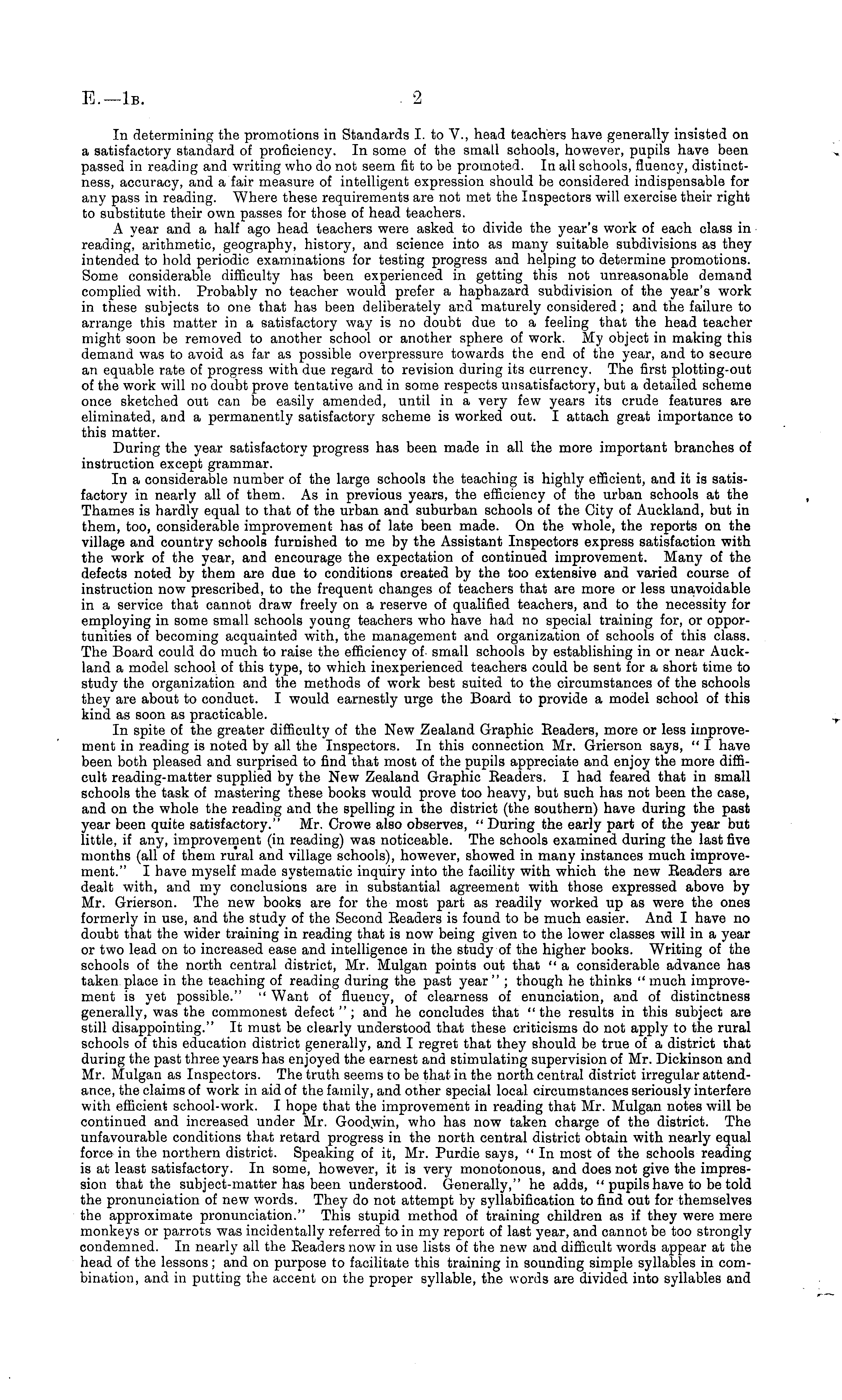 In determining the promotions in Standards I. to V., head teachers have generally insisted on a satisfactory standard of proficiency. In some of the small schools, however, pupils have been passed in reading and writing who do not seem fit to be promoted. In all schools, fluency, distinctness, accuracy, and a fair measure of intelligent expression should be considered indispensable for any pass in reading. Where these requirements are not met the Inspectors will exercise their right to substitute their own passes for those of head teachers. A year and a half ago head teachers were asked to divide the year's work of each class in reading, arithmetic, geography, history, and science into as many suitable subdivisions as they intended to hold periodic examinations for testing progress and helping to determine promotions. Some considerable difficulty has been experienced in getting this not unreasonable demand complied with. Probably no teacher would prefer a haphazard subdivision of the year's work in these subjects to one that has been deliberately and maturely considered; and the failure to arrange this matter in a satisfactory way is no doubt due to a feeling that the head teacher might soon be removed to another school or another sphere of work. My object in making this demand was to avoid as far as possible overpressure towards the end of the year, and to secure an equable rate of progress with due regard to revision during its currency. The first plotting-out of the work will no doubt prove tentative and in some respects unsatisfactory, but a detailed scheme once sketched out can be easily amended, until in a very few years its crude features are eliminated, and a permanently satisfactory scheme is worked out. I attach great importance to this matter. During the year satisfactory progress has been made in all the more important branches of instruction except grammar. In a considerable number of the large schools the teaching is highly efficient, and it is satisfactory in nearly all of them. As in previous years, the efficiency of the urban schools at the Thames is hardly equal to that of the urban and suburban schools of the City of Auckland, but in them, too, considerable improvement has of late been made. On the whole, the reports on the village and country schools furnished to me by the Assistant Inspectors express satisfaction with the work of the year, and encourage the expectation of continued improvement. Many of the defects noted by them are due to conditions created by the too extensive and varied course of instruction now prescribed, to the frequent changes of teachers that are more or less unavoidable in a service that cannot draw freely on a reserve of qualified teachers, and to the necessity for employing in some small schools young teachers who have had no special training for, or opportunities of becoming acquainted with, the management and organization of schools of this class. The Board could do much to raise the efficiency of small schools by establishing in or near Auckland a model school of this type, to which inexperienced teachers could be sent for a short time to study the organization and the methods of work best suited to the circumstances of the schools they are about to conduct. I would earnestly urge the Board to provide a model school of this kind as soon as practicable. In spite of the greater difficulty of the New Zealand Graphic Eeaders, more or less improvement in reading is noted by all the Inspectors. In this connection Mr. Grierson says, " I have been both pleased and surprised to find that most of the pupils appreciate and enjoy the more difficult reading-matter supplied by the New Zealand Graphic Headers. I had feared that in small schools the task of mastering these books would prove too heavy, but such has not been the case, and on the whole the reading and the spelling in the district (the southern) have during the past year been quite satisfactory." Mr. Crowe also observes, " During the early part of the year but little, if any, improvement (in reading) was noticeable. The schools examined during the last five months (all of them rural and village schools), however, showed in many instances much improvement." I have myself made systematic inquiry into the facility with which the new Headers are dealt with, and my conclusions are in substantial agreement with those expressed above by Mr. Grierson. The new books are for the most part as readily worked up as were the ones formerly in use, and the study of the Second Readers is found to be much easier. And I have no doubt that the wider training in reading that is now being given to the lower classes will in a year or two lead on to increased ease and intelligence in the study of the higher books. Writing of the schools of the north central district, Mr. Mulgan points out that " a considerable advance has taken place in the teaching of reading during the past year" ; though he thinks "much improvement is yet possible." " Want of fluency, of clearness of enunciation, and of distinctness generally, was the commonest defect"; and he concludes that "the results in this subject are still disappointing." It must be clearly understood that these criticisms do not apply to the rural schools of this education district generally, and I regret that they should be true of a district that during the past three years has enjoyed the earnest and stimulating supervision of Mr. Dickinson and Mr. Mulgan as Inspectors. The truth seems to be that in the north central district irregular attendance, the claims of work in aid of the family, and other special local circumstances seriously interfere with efficient school-work. I hope that the improvement in reading that Mr. Mulgan notes will be continued and increased under Mr. Goodwin, who has now taken charge of the district. The unfavourable conditions that retard progress in the north central district obtain with nearly equal force in the northern district. Speaking o