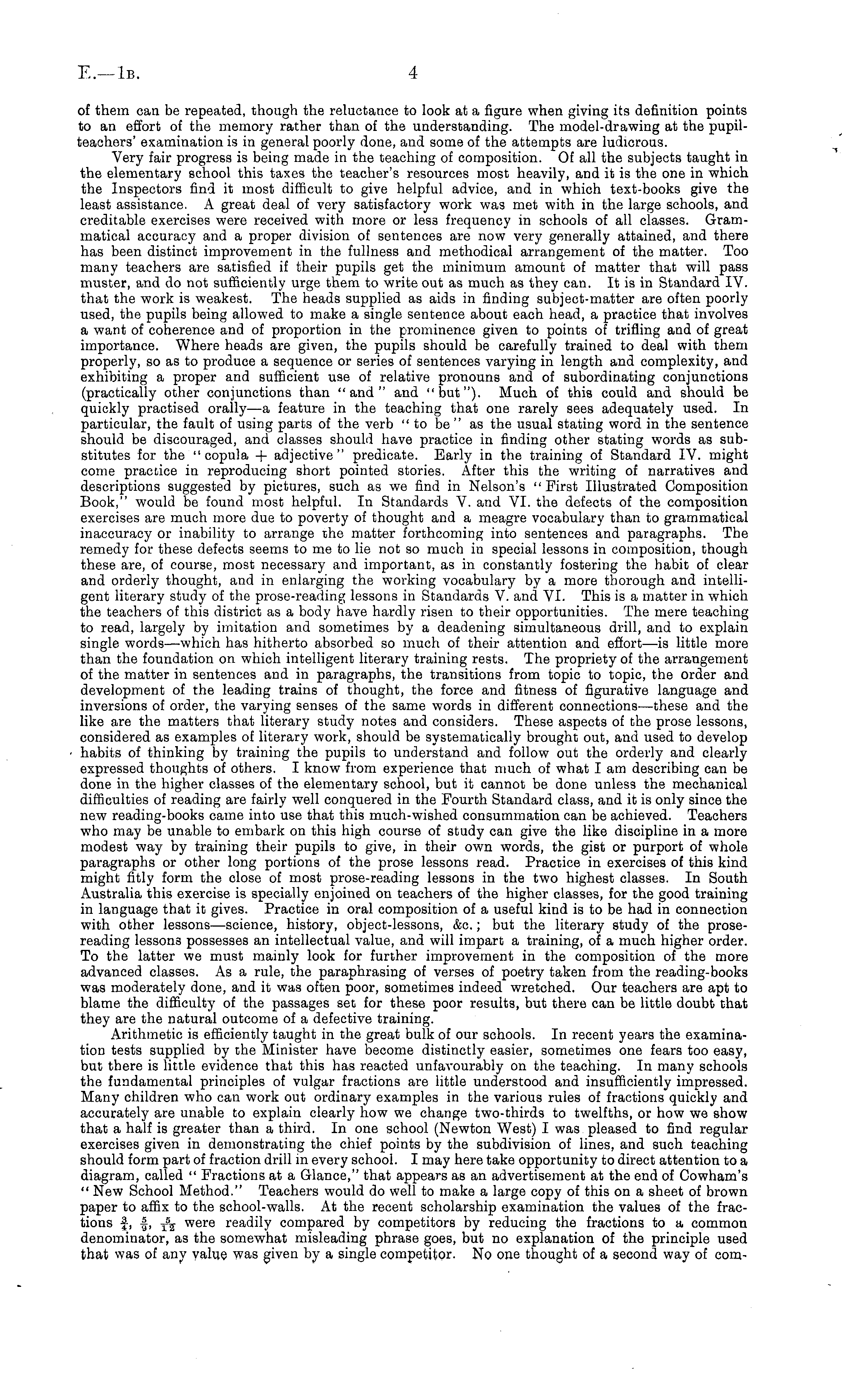 of them can be repeated, though the reluctance to look at a figure when giving its definition points to an effort of the memory rather than of the understanding. The model-drawing at the pupilteachers' examination is in general poorly done, and some of the attempts are ludicrous. Very fair progress is being made in the teaching of composition. Of all the subjects taught in the elementary school this taxes the teacher's resources most heavily, and it is the one in which the Inspectors find it most difficult to give helpful advice, and in which text-books give the least assistance. A great deal of very satisfactory work was met with in the large schools, and creditable exercises were received with more or less frequency in schools of all classes. Grammatical accuracy and a proper division of sentences are now very generally attained, and there has been distinct improvement in the fullness and methodical arrangement of the matter. Too many teachers are satisfied if their pupils get the minimum amount of matter that will pass muster, and do not sufficiently urge them to write out as much as they can. It is in Standard IV. that the work is weakest. The heads supplied as aids in finding subject-matter are often poorly used, the pupils being allowed to make a single sentence about each head, a practice that involves a want of coherence and of proportion in the prominence given to points of trifling and of great importance. Where heads are given, the pupils should be carefully trained to deal with them properly, so as to produce a sequence or series of sentences varying in length and complexity, and exhibiting a proper and sufficient use of relative pronouns and of subordinating conjunctions (practically other conjunctions than "and" and "but"). Much of this could and should be quickly practised orally—a feature in the teaching that one rarely sees adequately used. In particular, the fault of using parts of the verb " to be " as the usual stating word in the sentence should be discouraged, and classes should have practice in finding other stating words as substitutes for the "copula + adjective" predicate. Early in the training of Standard IV. might come practice in reproducing short pointed stories. After this the writing of narratives and descriptions suggested by pictures, such as we find in Nelson's " First Illustrated Composition Book," would be found most helpful. In Standards V. and VI. the defects of the composition exercises are much more due to poverty of thought and a meagre vocabulary than to grammatical inaccuracy or inability to arrange the matter forthcoming into sentences and paragraphs. The remedy for these defects seems to me to lie not so much in special lessons in composition, though these are, of course, most necessary and important, as in constantly fostering the habit of clear and orderly thought, and in enlarging the working vocabulary by a more thorough and intelligent literary study of the prose-reading lessons in Standards V. and VI. This is a matter in which the teachers of this district as a body have hardly risen to their opportunities. The mere teaching to read, largely by imitation and sometimes by a deadening simultaneous drill, and to explain single words—which has hitherto absorbed so much of their attention and effort—is little more than the foundation on which intelligent literary training rests. The propriety of the arrangement of the matter in sentences and in paragraphs, the transitions from topic to topic, the order and development of the leading trains of thought, the force and fitness of figurative language and inversions of order, the varying senses of the same words in different connections —these and the like are the matters that literary study notes and considers. These aspects of the prose lessons, considered as examples of literary work, should be systematically brought out, and used to develop habits of thinking by training the pupils to understand and follow out the orderly and clearly expressed thoughts of others. I know from experience that much of what lam describing can be done in the higher classes of the elementary school, but it cannot be done unless the mechanical difficulties of reading are fairly well conquered in the Fourth Standard class, and it is only since the new reading-books came into use that this much-wished consummation can be achieved. Teachers who may be unable to embark on this high course of study can give the like discipline in a more modest way by training their pupils to give, in their own words, the gist or purport of whole paragraphs or other long portions of the prose lessons read. Practice in exercises of this kind might fitly form the close of most prose-reading lessons in the two highest classes. In South Australia this exercise is specially enjoined on teachers of the higher classes, for the good training in language that it gives. Practice in oral composition of a useful kind is to be had in connection with other lessons—science, history, object-lessons, &c.; but the literary study of the prosereading lessons possesses an intellectual value, and will impart a training, of a much higher order. To the latter we must mainly look for further improvement in the composition of the more advanced classes. As a rule, the paraphrasing of verses of poetry taken from the reading-books was moderately done, and it was often poor, sometimes indeed wretched. Our teachers are apt to blame the difficulty of the passages set for these poor results, but there can be little doubt that they are the natural outcome of a defective training. Arithmetic is efficiently taught in the great bulk of our schools. In recent years the examination tests supplied by the Minister have become distinctly easier, sometimes one fears too easy, but there is little evidence that this has reacted unfavourably on the teaching. In many schools the fundamental principles of vulgar fractions are little understood and insufficiently impressed. Man