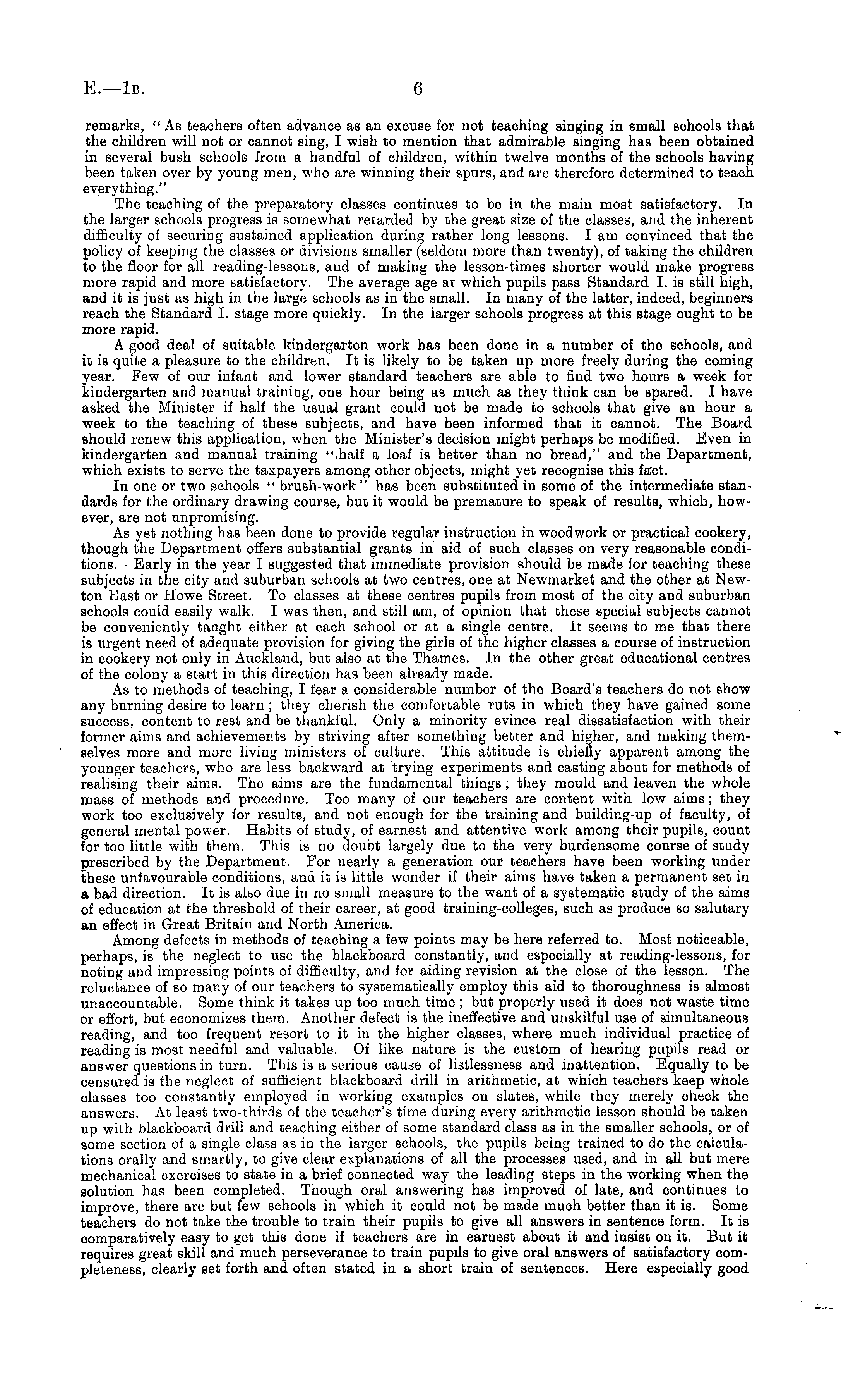 remarks, " As teachers often advance as an excuse for not teaching singing in small schools that the children will not or cannot sing, I wish to mention that admirable singing has been obtained in several bush schools from a handful of children, within twelve months of the schools having been taken over by young men, who are winning their spurs, and are therefore determined to teach everything." The teaching of the preparatory classes continues to be in the main most satisfactory. In the larger schools progress is somewhat retarded by the great size of the classes, and the inherent difficulty of securing sustained application during rather long lessons. lam convinced that the policy of keeping the classes or divisions smaller (seldom more than twenty), of taking the children to the floor for all reading-lessons, and of making the lesson-times shorter would make progress more rapid and more satisfactory. The average age at which pupils pass Standard I. is still high, and it is just as high in the large schools as in the small. In many of the latter, indeed, beginners reach the Standard I. stage more quickly. In the larger schools progress at this stage ought to be more rapid. A good deal of suitable kindergarten work has been done in a number of the schools, and it is quite a pleasure to the children. It is likely to be taken up more freely during the coming year. Few of our infant and lower standard teachers are able to find two hours a week for kindergarten and manual training, one hour being as much as they think can be spared. I have asked the Minister if half the usual grant could not be made to schools that give an hour a week to the teaching of these subjects, and have been informed that it cannot. The Board should renew this application, when the Minister's decision might perhaps be modified. Even in kindergarten and manual training "half a loaf is better than no bread," and the Department, which exists to serve the taxpayers among other objects, might yet recognise this fact. In one or two schools " brush-work " has been substituted in some of the intermediate standards for the ordinary drawing course, but it would be premature to speak of results, which, however, are not unpromising. As yet nothing has been done to provide regular instruction in woodwork or practical cookery, though the Department offers substantial grants in aid of such classes on very reasonable conditions. Early in the year I suggested that immediate provision should be made for teaching these subjects in the city and suburban schools at two centres, one at Newmarket and the other at Newton East or Howe Street. To classes at these centres pupils from most of the city and suburban schools could easily walk. I was then, and still am, of opinion that these special subjects cannot be conveniently taught either at each school or at a single centre. It seems to me that there is urgent need of adequate provision for giving the girls of the higher classes a course of instruction in cookery not only in Auckland, but also at the Thames. In the other great educational centres of the colony a start in this direction has been already made. As to methods of teaching, I fear a considerable number of the Board's teachers do not show any burning desire to learn; they cherish the comfortable ruts in which they have gained some success, content to rest and be thankful. Only a minority evince real dissatisfaction with their former aims and achievements by striving after something better and higher, and making themselves more and more living ministers of culture. This attitude is chiefly apparent among the younger teachers, who are less backward at trying experiments and casting about for methods of realising their aims. The aims are the fundamental things ; they mould and leaven the whole mass of methods and procedure. Too many of our teachers are content with low aims; they work too exclusively for results, and not enough for the training and building-up of faculty, of general mental power. Habits of study, of earnest and attentive work among their pupils, count for too little with them. This is no doubt largely due to the very burdensome course of study prescribed by the Department. For nearly a generation our teachers have been working under these unfavourable conditions, and it is little wonder if their aims have taken a permanent set in a bad direction. It is also due in no small measure to the want of a systematic study of the aims of education at the threshold of their career, at good training-colleges, such as produce so salutary an effect in Great Britain and North America. Among defects in methods of teaching a few points may be here referred to. Most noticeable, perhaps, is the neglect to use the blackboard constantly, and especially at reading-lessons, for noting and impressing points of difficulty, and for aiding revision at the close of the lesson. The reluctance of so many of our teachers to systematically employ this aid to thoroughness is almost unaccountable. Some think it takes up too much time ; but properly used it does not waste time or effort, but economizes them. Another defect is the ineffective and unskilful use of simultaneous reading, and too frequent resort to it in the higher classes, where much individual practice of reading is most needful and valuable. Of like nature is the custom of hearing pupils read or answer questions in turn. This is a serious cause of listlessness and inattention. Equally to be censured is the neglect of sufficient blackboard drill in arithmetic, at which teachers keep whole classes too constantly employed in working examples on slates, while they merely check the answers. At least two-thirds of the teacher's time during every arithmetic lesson should be taken up with blackboard drill and teaching either of some standard class as in the smaller schools, or of some section of a single class as in the larger schools, the pupils being trained to do the calculations orally and