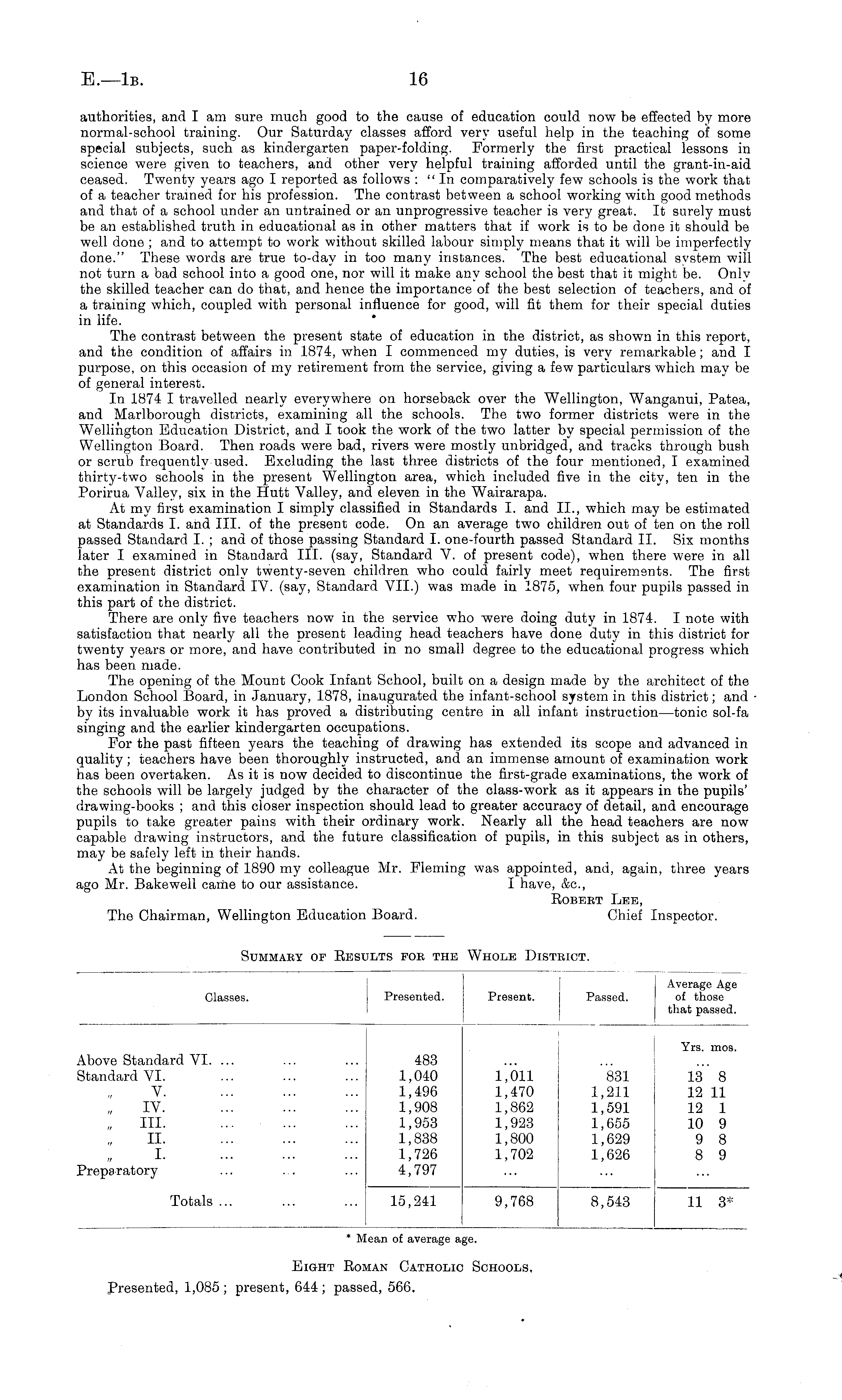 authorities, and I am sure much good to the cause of education could now be effected by more normal-school training. Our Saturday classes afford very useful help in the teaching of some special subjects, such as kindergarten paper-folding. Formerly the first practical lessons in science were given to teachers, and other very helpful training afforded until the grant-in-aid ceased. Twenty years ago I reported as follows : "In comparatively few schools is the work that of a teacher trained for his profession. The contrast between a school working with good methods and that of a school under an untrained or an unprogressive teacher is very great. It surely must be an established truth in educational as in other matters that if work is to be done it should be well done ; and to attempt to work without skilled labour simply means that it will be imperfectly done." These words are true to-day in too many instances. The best educational system will not turn a bad school into a good one, nor will it make any school the best that it might be. Only the skilled teacher can do that, and hence the importance of the best selection of teachers, and of a training which, coupled with personal influence for good, will fit them for their special duties in life. The contrast between the present state of education in the district, as shown in this report, and the condition of affairs in 1874, when I commenced my duties, is very remarkable; and I purpose, on this occasion of my retirement from the service, giving a few particulars which may be of general interest. In 1874 I travelled nearly everywhere on horseback over the Wellington, Wanganui, Patea, and Marlborough districts, examining all the schools. The two former districts were in the Wellington Education District, and I took the work of the two latter by special permission of the Wellington Board. Then roads were bad, rivers were mostly unbridged, and tracks through bush or scrub frequently used. Excluding the last three districts of the four mentioned, I examined thirty-two schools in the present Wellington area, which included five in the city, ten in the Porirua Valley, six in the Hutt Valley, and eleven in the Wairarapa. At my first examination I simply classified in Standards I. and 11., which may be estimated at Standards I. and 111. of the present code. On an average two children out of ten on the roll passed Standard I. ; and of those passing Standard I. one-fourth passed Standard 11. Six months later I examined in Standard 111. (say, Standard V. of present code), when there were in all the present district only twenty-seven children who could fairly meet requirements. The first examination in Standard IV. (say, Standard VII.) was made in 1875, when four pupils passed in this part of the district. There are only five teachers now in the service who were doing duty in 1874. I note with satisfaction that nearly all the present leading head teachers have done duty in this district for twenty years or more, and have contributed in no small degree to the educational progress which has been made. The opening of the Mount Cook Infant School, built on a design made by the architect of the London School Board, in January, 1878, inaugurated the infant-school system in this district; and by its invaluable work it has proved a distributing centre in all infant instruction—tonic sol-fa singing and the earlier kindergarten occupations. For the past fifteen years the teaching of drawing has extended its scope and advanced in quality; teachers have been thoroughly instructed, and an immense amount of examination work has been overtaken. As it is now decided to discontinue the first-grade examinations, the work of the schools will be largely judged by the character of the class-work as it appears in the pupils' drawing-books ; and this closer inspection should lead to greater accuracy of detail, and encourage pupils to take greater pains with their ordinary work. Nearly all the head teachers are now capable drawing inatructors, and the future classification of pupils, in this subject as in others, may be safely left in their hands. At the beginning of 1890 my colleague Mr. Fleming was appointed, and, again, three years ago Mr. Bake well came to our assistance. I have, &c, Robeet Lee, The Chairman, Wellington Education Board. Chief Inspector.