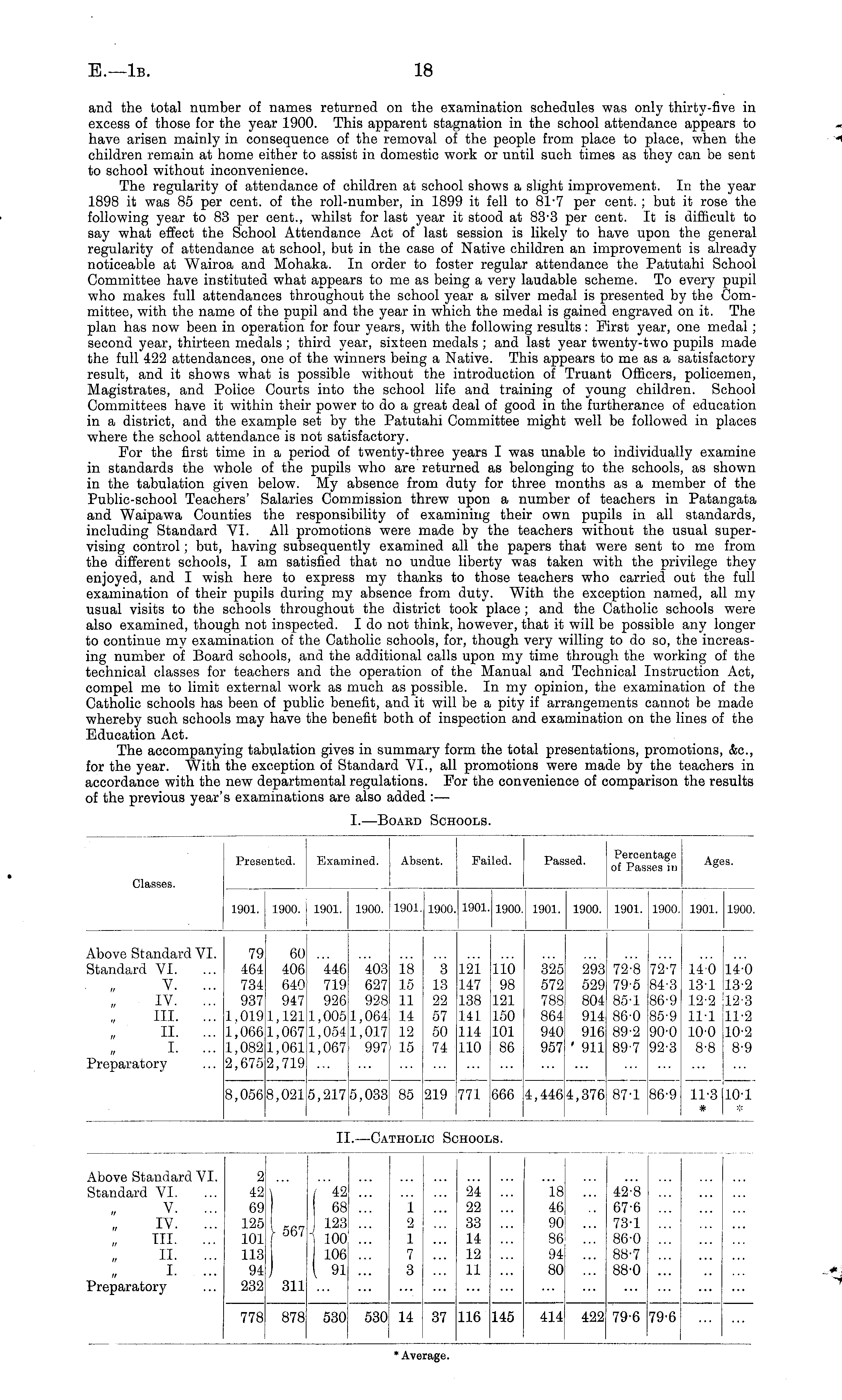 and the total number of names returned on the examination schedules was only thirty-five in excess of those for the year 1900. This apparent stagnation in the school attendance appears to have arisen mainly in consequence of the removal of the people from place to place, when the children remain at home either to assist in domestic work or until such times as they can be sent to school without inconvenience. The regularity of attendance of children at school shows a slight improvement. In the year 1898 it was 85 per cent, of the roll-number, in 1899 it fell to 817 per cent. ; but it rose the following year to 83 per cent., whilst for last year it stood at 83-3 per cent. It is difficult to say what effect the School Attendance Act of last session is likely to have upon the general regularity of attendance at school, but in the case of Native children an improvement is already noticeable at Wairoa and Mohaka. In order to foster regular attendance the Patutahi School Committee have instituted what appears to me as being a very laudable scheme. To every pupil who makes full attendances throughout the school year a silver medal is presented by the Committee, with the name of the pupil and the year in which the medal is gained engraved on it. The plan has now been in operation for four years, with the following results : First year, one medal ; second year, thirteen medals ; third year, sixteen medals ; and last year twenty-two pupils made the full 422 attendances, one of the winners being a Native. This appears to me as a satisfactory result, and it shows what is possible without the introduction of Truant Officers, policemen, Magistrates, and Police Courts into the school life and training of young children. School Committees have it within their power to do a great deal of good in the furtherance of education in a district, and the example set by the Patutahi Committee might well be followed in places where the school attendance is not satisfactory. For the first time in a period of twenty-three years I was unable to individually examine in standards the whole of the pupils who are returned as belonging to the schools, as shown in the tabulation given below. My absence from duty for three months as a member of the Public-school Teachers' Salaries Commission threw upon a number of teachers in Patangata and Waipawa Counties the responsibility of examining their own pupils in all standards, including Standard VI. All promotions were made by the teachers without the usual supervising control; but, having subsequently examined all the papers that were sent to me from the different schools, I am satisfied that no undue liberty was taken with the privilege they enjoyed, and I wish here to express my thanks to those teachers who carried out the full examination of their pupils during my absence from duty. With the exception named, all my usual visits to the schools throughout the district took place; and the Catholic schools were also examined, though not inspected. Ido not think, however, that it will be possible any longer to continue my examination of the Catholic schools, for, though very willing to do so, the increasing number of Board schools, and the additional calls upon my time through the working of the technical classes for teachers and the operation of the Manual and Technical Instruction Act, compel me to limit external work as much as possible. In my opinion, the examination of the Catholic schools has been of public benefit, and it will be a pity if arrangements cannot be made whereby such schools may have the benefit both of inspection and examination on the lines of the Education Act. The accompanying tabulation gives in summary form the total presentations, promotions, &c, for the year. With the exception of Standard VI., all promotions were made by the teachers in accordance with the new departmental regulations. For the convenience of comparison the results of the previous year's examinations are also added : —