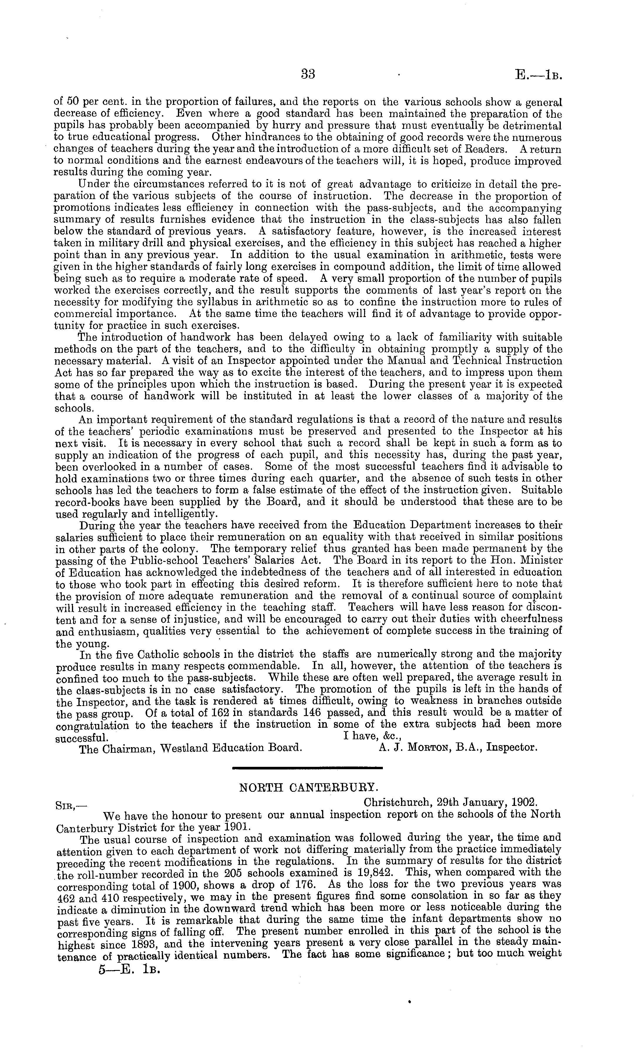 NORTH CANTERBURY. g m Christchurch, 29th January, 1902. We have the honour to present our annual inspection report on the schools of the North Canterbury District for the year 1901. The usual course of inspection and examination was followed during the year, the time and attention given to each department of work not differing materially from the practice immediately preceding the recent modifications in the regulations. In the summary of results for the district the roll-number recorded in the 205 schools examined is 19,842. This, when compared with the corresponding total of 1900, shows a drop of 176. As the loss for the two previous years was 462 and 410 respectively, we may in the present figures find some consolation in so far as they indicate a diminution in the downward trend which has been more or less noticeable during the past five years. It is remarkable that during the same time the infant departments show no corresponding signs of falling off. The present number enrolled in this part of the school is the highest since 1893, and the intervening years present a very close parallel in the steady maintenance of practically identical numbers. The fact has some significance; but too much weight 5—E. Iβ.