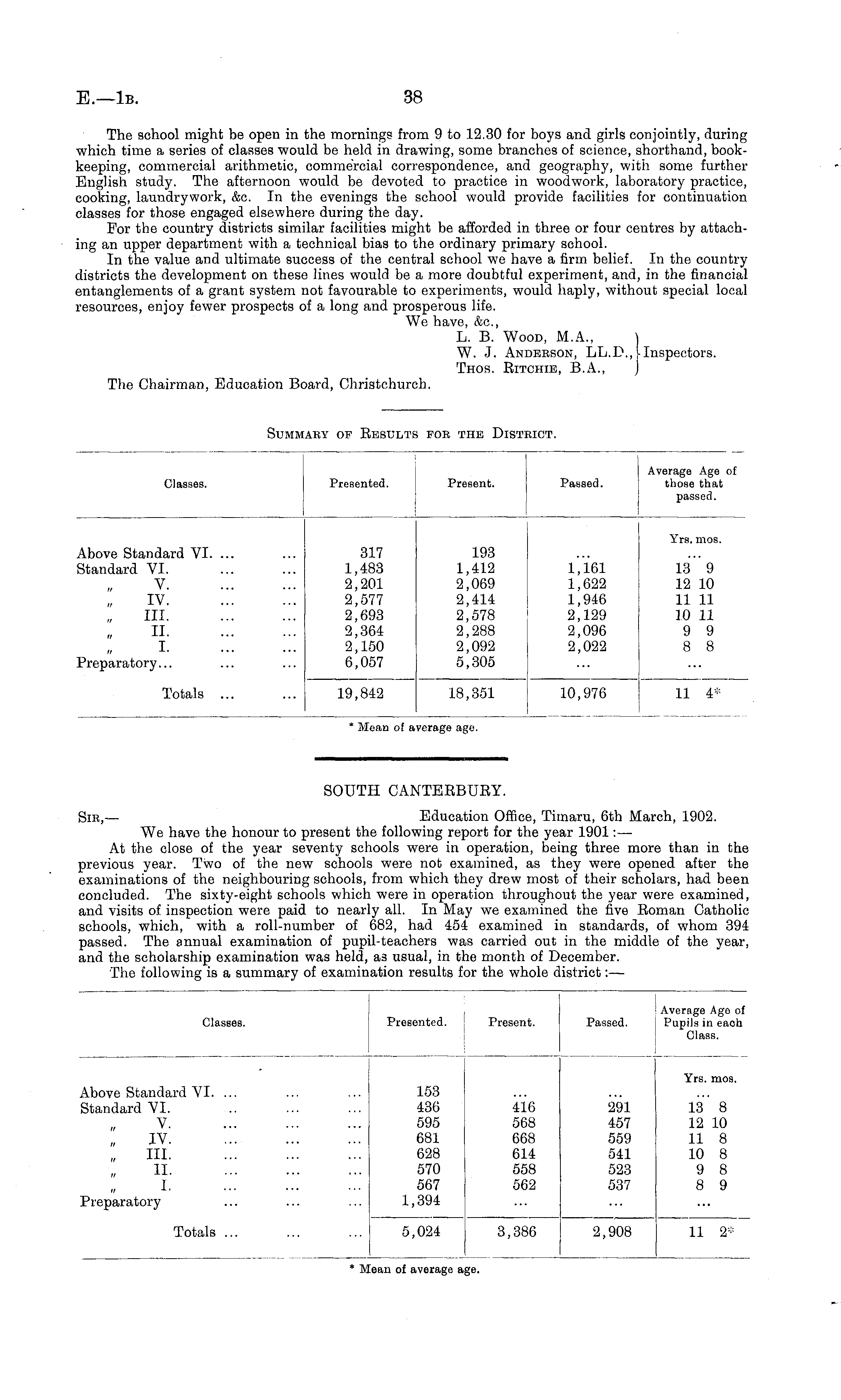 SOUTH CANTERBUEY. Sir,— Education Office, Timaru, 6th March, 1902. We have the honour to present the following report for the year 1901: — At the close of the year seventy schools were in operation, being three more than in the previous year. Two of the new schools were not examined, as they were opened after the examinations of the neighbouring schools, from which they drew most of their scholars, had been concluded. The sixty-eight schools which were in operation throughout the year were examined, and visits of inspection were paid to nearly all. In May we examined the five Roman Catholic schools, which, with a roll-number of 682, had 454 examined in standards, of whom 394 passed. The annual examination of pupil-teachers was carried out in the middle of the year, and the scholarship examination was held, as usual, in the month of December. The following is a summary of examination results for the whole district: —