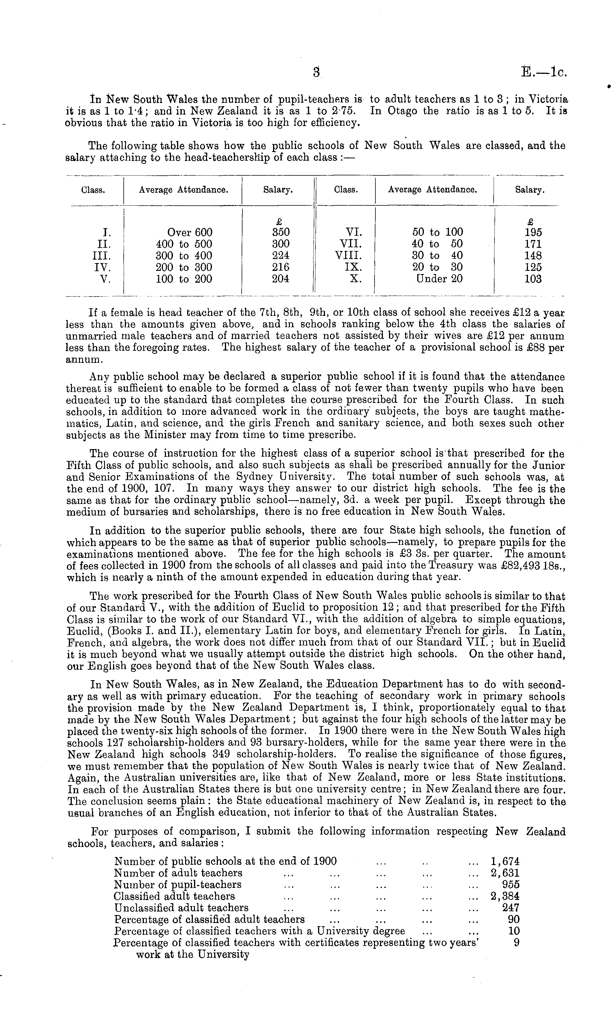 In New South Wales the number of pupil-teachers is to adult teachers as 1 to 3 ; in Victoria it is as Ito 1-4; and in New Zealand it is as Ito 275. In Otago the ratio is as Ito 5. It is obvious that the ratio in Victoria is too high for efficiency. The following table shows how the public schools of New South Wales are classed, and the salary attaching to the head-teachership of each class : —