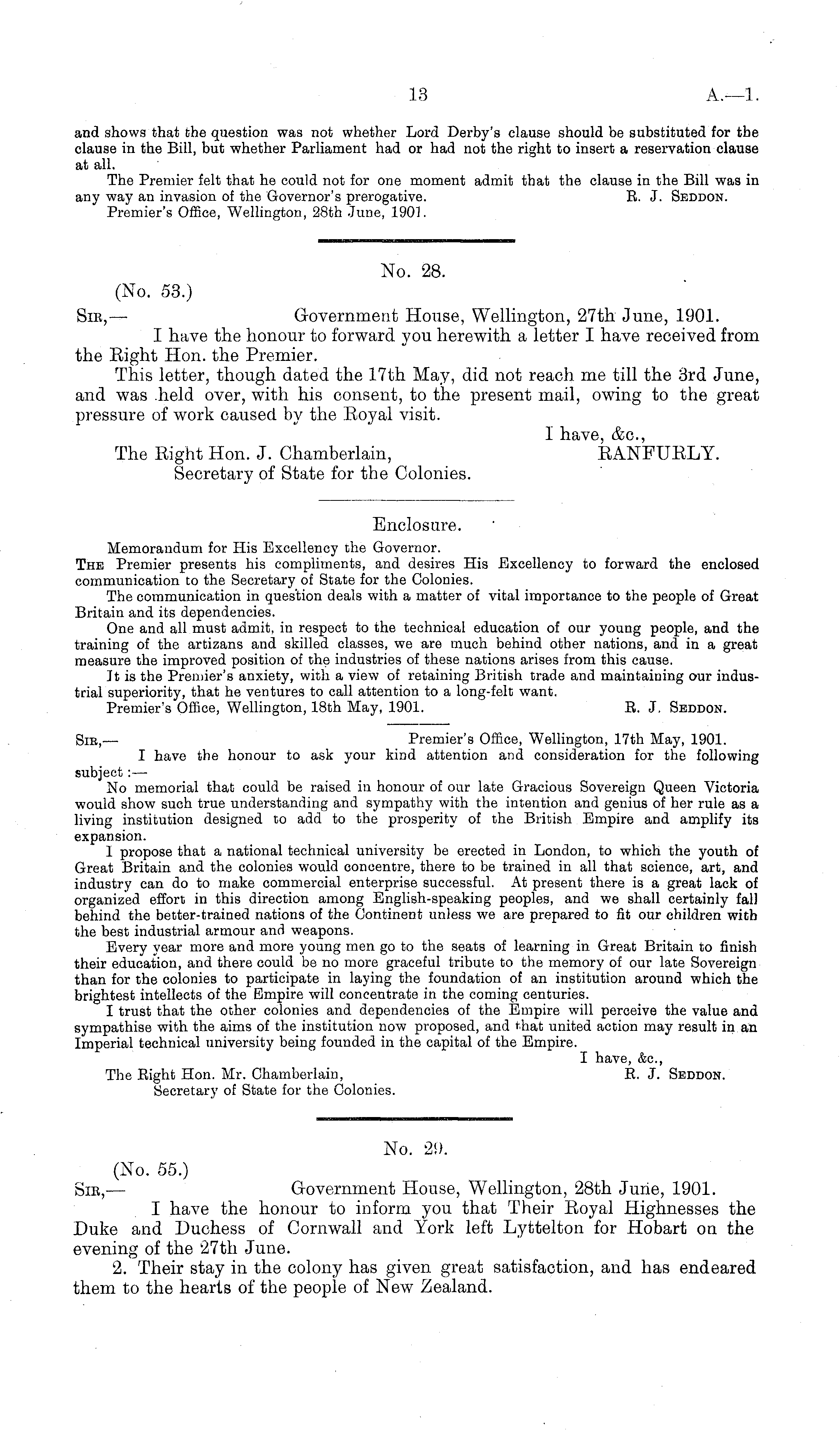Enclosure. Memorandum for His Excellency the Governor. The Premier presents his compliments, and desires His Excellency to forward the enclosed communication to the Secretary of State for the Colonies. The communication in question deals with a matter of vital importance to the people of Great Britain and its dependencies. One and all must admit, in respect to the technical education of our young people, and the training of the artizans and skilled classes, we are much behind other nations, and in a great measure the improved position of the industries of these nations arises from this cause. It is the Premier's anxiety, with a view of retaining British trade and maintaining our industrial superiority, that he ventures to call attention to a long-felt want. Premier's Office, Wellington, 18th May, 1901. R. J. Seddon. Sib— Premier's Office, Wellington, 17th May, 1901. I have the honour to ask your kind attention and consideration for the following subject: — No memorial that could be raised in honour of our late Gracious Sovereign Queen Victoria would show such true understanding and sympathy with the intention and genius of her rule as a living institution designed to add to the prosperity of the British Empire and amplify its expansion. I propose that a national technical university be erected in London, to which the youth of Great Britain and the colonies would concentre, there to be trained in all that science, art, and industry can do to make commercial enterprise successful. At present there is a great lack of organized effort in this direction among English-speaking peoples, and we shall certainly fall behind the better-trained nations of the Continent unless we are prepared to fit our children with the best industrial armour and weapons. Every year more and more young men go to the seats of learning in Great Britain to finish their education, and there could be no more graceful tribute to the memory of our late Sovereign than for the colonies to participate in laying the foundation of an institution around which the brightest intellects of the Empire will concentrate in the coming centuries. I trust that the other colonies and dependencies of the Empire will perceive the value and sympathise with the aims of the institution now proposed, and that united action may result in an Imperial technical university being founded in the capital of the Empire. I have, &c, The Right Hon. Mr. Chamberlain, R. J. Seddon. Secretary of State for the Colonies.