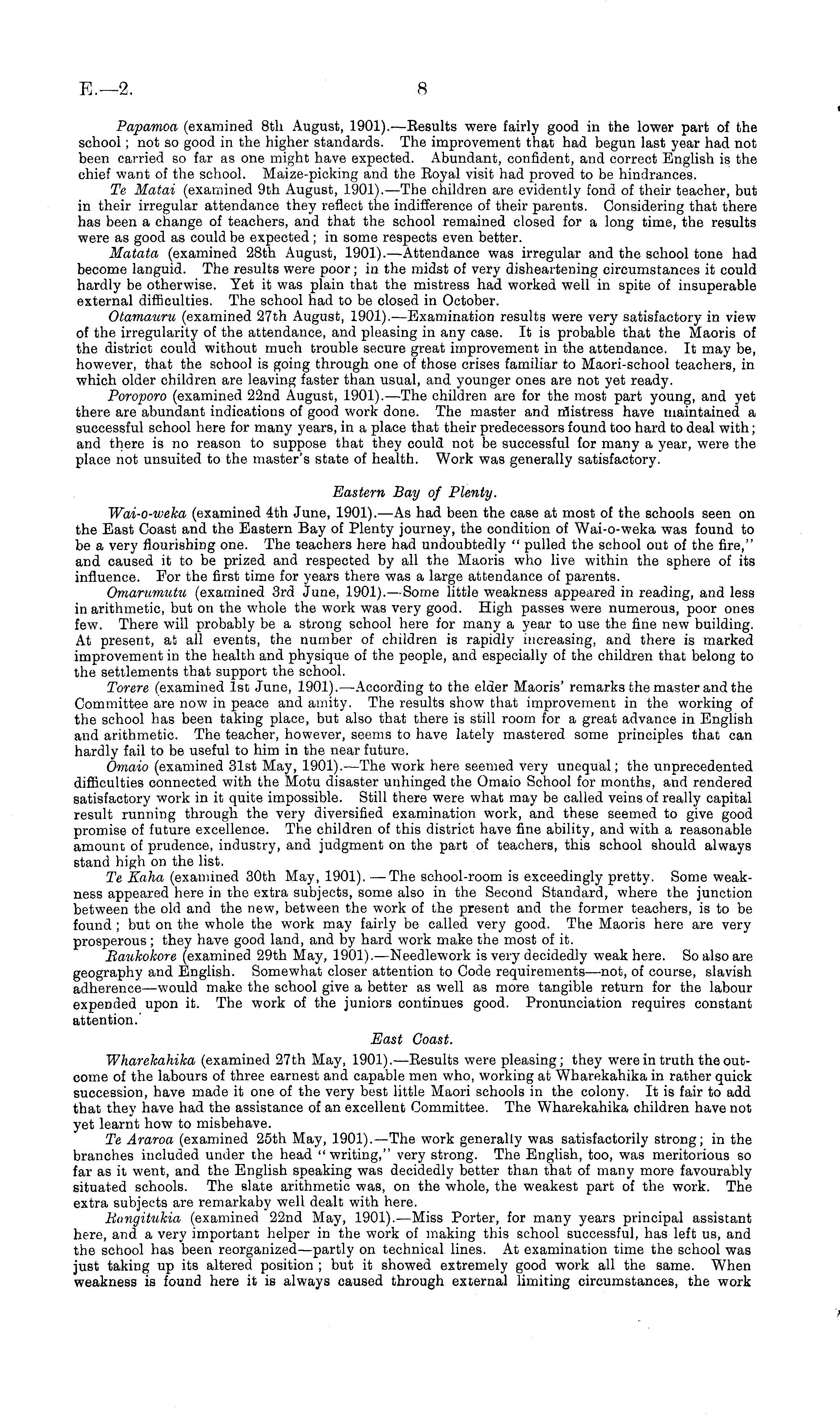 Papamoa (examined Bth August, 1901). —Results were fairly good in the lower part of the school; not so good in the higher standards. The improvement that had begun last year had not been carried so far as one might have expected. Abundant, confident, and correct English is the chief want of the school. Maize-picking and the Royal visit had proved to be hindrances. Te Matai (examined 9th August, 1901). —The children are evidently fond of their teacher, but in their irregular attendance they reflect the indifference of their parents. Considering that there has been a change of teachers, and that the school remained closed for a long time, the results were as good as could be expected; in some respects even better. Matata (examined 28th August, 1901). —Attendance was irregular and the school tone had become languid. The results were poor; in the midst of very disheartening circumstances it could hardly be otherwise. Yet it was plain that the mistress had worked well in spite of insuperable external difficulties. The school had to be closed in October. Otamauru (examined 27th August, 1901). —Examination results were very satisfactory in view of the irregularity of the attendance, and pleasing in any case. It is probable that the Maoris of the district could without much trouble secure great improvement in the attendance. It may be, however, that the school is going through one of those crises familiar to Maori-school teachers, in which older children are leaving faster than usual, and younger ones are not yet ready. Poroporo (examined 22nd August, 1901). —The children are for the most part young, and yet there are abundant indications of good work done. The master and rfiistress have maintained a successful school here for many years, in a place that their predecessors found too hard to deal with; and there is no reason to suppose that they could not be successful for many a year, were the place not unsuited to the master's state of health. Work was generally satisfactory. Eastern Bay of Plenty. Wai-o-weka (examined 4th June, 1901). —As had been the case at most of the schools seen on the East Coast and the Eastern Bay of Plenty journey, the condition of Wai-o-weka was found to be a very flourishing one. The teachers here had undoubtedly " pulled the school out of the fire," and caused it to be prized and respected by all the Maoris who live within the sphere of its influence. For the first time for years there was a large attendance of parents. Omarumutu (examined 3rd June, 1901). —Some little weakness appeared in reading, and less in arithmetic, but on the whole the work was very good. High passes were numerous, poor ones few. There will probably be a strong school here for many a year to use the fine new building. At present, at all events, the number of children is rapidly increasing, and there is marked improvement in the health and physique of the people, and especially of the children that belong to the settlements that support the school. Torere (examined Ist June, 1901). —According to the elder Maoris' remarks the master and the Committee are now in peace and amity. The results show that improvement in the working of the school has been taking place, but also that there is still room for a great advance in English and arithmetic. The teacher, however, seems to have lately mastered some principles that can hardly fail to be useful to him in the near future. Omaio (examined 31st May, 1901). —The work here seemed very unequal; the unprecedented difficulties connected with the Motu disaster unhinged the Omaio School for months, and rendered satisfactory work in it quite impossible. Still there were what may be called veins of really capital result running through the very diversified examination work, and these seemed to give good promise of future excellence. The children of this district have fine ability, and with a reasonable amount of prudence, industry, and judgment on the part of teachers, this school should always stand high on the list. Te Kaha (examined 30th May, 1901). —The school-room is exceedingly pretty. Some weakness appeared here in the extra subjects, some also in the Second Standard, where the junction between the old and the new, between the work of the present and the former teachers, is to be found ; but on the whole the work may fairly be called very good. The Maoris here are very prosperous; they have good land, and by hard work make the most of it. Raukokore (examined 29th May, 1901). —Needlework is very decidedly weak here. So also are geography and English. Somewhat closer attention to Code requirements—not, of course, slavish adherence —would make the school give a better as well as more tangible return for the labour expended upon it. The work of the juniors continues good. Pronunciation requires constant attention.' East Coast. Wharekahika (examined 27th May, 1901). —Results were pleasing; they were in truth the outcome of the labours of three earnest and capable men who, working at Wharekahika in rather quick succession, have made it one of the very best little Maori schools in the colony. It is fair to add that they have had the assistance of an excellent Committee. The Wharekahika children have not yet learnt how to misbehave. Te Araroa (examined 25th May, 1901). —The work generally was satisfactorily strong; in the branches included under the head "writing," very strong. The English, too, was meritorious so far as it went, and the English speaking was decidedly better than that of many more favourably situated schools. The slate arithmetic was, on the whole, the weakest part of the work. The extra subjects are remarkaby well dealt with here. Rongitukia (examined 22nd May, 1901). —Miss Porter, for many years principal assistant here, and a very important helper in the work of making this school successful, has left us, and the school has been reorganized —partly on technical lines. At examination time the school was just