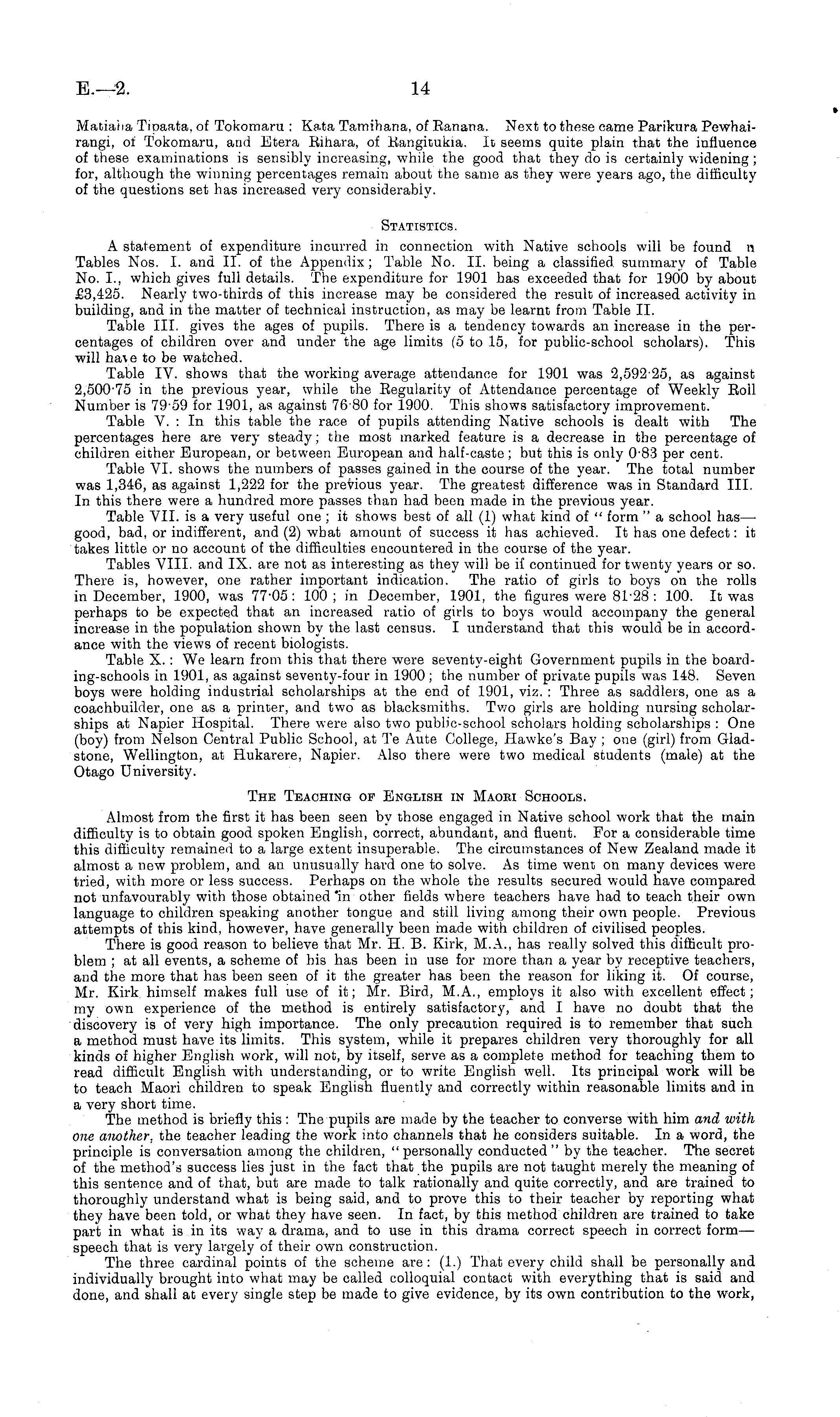 Matiaha Tipaata, of Tokomaru : Kata Tamihana, of Ranana. Next to these came Parikura Pewhairangi, of Tokomaru, and Etera Rihara, of Rangitukia. It seems quite plain that the influence of these examinations is sensibly increasing, while the good that they do is certainly widening ; for, although the winning percentages remain about the same as they were years ago, the difficulty of the questions set has increased very considerably. Statistics. A statement of expenditure incurred in connection with Native schools will be found n Tables Nos. I. and 11. of the Appendix; Table No. 11. being a classified summary of Table No. 1., which gives full details. The expenditure for 1901 has exceeded that for 1900 by about £3,425. Nearly two-thirds of this increase may be considered the result of increased activity in building, and in the matter of technical instruction, as may be learnt from Table 11. Table 111. gives the ages of pupils. There is a tendency towards an increase in the percentages of children over and under the age limits (5 to 15, for public-school scholars). This will ha\e to be watched. Table IV. shows tha.t the working average attendance for 1901 was 2,59225, as against 2,500-75 in the previous year, while the Regularity of Attendance percentage of Weekly Roll Number is 7959 for 1901, as against 7680 for 1900. This shows satisfactory improvement. Table V. :In this table the race of pupils attending Native schools is dealt with The percentages here are very steady; the most marked feature is a decrease in the percentage of children either European, or between European and half-caste ; but this is only 0-83 per cent. Table VI. shows the numbers of passes gained in the course of the year. The total number was 1,346, as against 1,222 for the previous year. The greatest difference was in Standard 111. In this there were a hundred more passes than had been made in the previous year. Table VII. is a very useful one ; it shows best of all (1) what kind of " form " a school has—■ good, bad, or indifferent, and (2) what amount of success it has achieved. It has one defect: it takes little or no account of the difficulties encountered in the course of the year. Tables VIII. and IX. are not as interesting as they will be if continued for twenty years or so. There is, however, one rather important indication. The ratio of girls to boys on the rolls in December, 1900, was 77-05: 100; in December, 1901, the figures were 81-28 : 100. It was perhaps to be expected that an increased ratio of girls to boys would accompany the general increase in the population shown by the last census. I understand that this would be in accordance with the views of recent biologists. Table X. : We learn from this that there were seventy-eight Government pupils in the board-ing-schools in 1901, as against seventy-four in 1900 ; the number of private pupils was 148. Seven boys were holding industrial scholarships at the end of 1901, viz. : Three as saddlers, one as a coachbuilder, one as a printer, and two as blacksmiths. Two girls are holding nursing scholarships at Napier Hospital. There were also two public-school scholars holding scholarships : One (boy) from Nelson Central Public School, at Te Aute College, Hawke's Bay ; one (girl) from Gladstone, Wellington, at Hukarere, Napier. Also there were two medical students (male) at the Otago University. The Teaching of English in Maori Schools. Almost from the first it has been seen by those engaged in Native school work that the main difficulty is to obtain good spoken English, correct, abundant, and fluent. For a considerable time this difficulty remained to a large extent insuperable. The circumstances of New Zealand made it almost a new problem, and an unusually hard one to solve. As time went on many devices were tried, with more or less success. Perhaps on the whole the results secured would have compared not unfavourably with those obtained *in other fields where teachers have had to teach their own language to children speaking another tongue and still living among their own people. Previous attempts of this kind, however, have generally been made with children of civilised peoples. There is good reason to believe that Mr. H. B. Kirk, M.A., has really solved this difficult problem ; at all events, a scheme of bis has been in use for more than a year by receptive teachers, and the more that has been seen of it the greater has been the reason for liking it. Of course, Mr. Kirk himself makes full use of it; Mr. Bird, M.A., employs it also with excellent effect; my own experience of the method is entirely satisfactory, and I have no doubt that the discovery is of very high importance. The only precaution required is to remember that such a method must have its limits. This system, while it prepares children very thoroughly for all kinds of higher English work, will not, by itself, serve as a complete method for teaching them to read difficult English with understanding, or to write English well. Its principal work will be to teach Maori children to speak English fluently and correctly within reasonable limits and in a very short time. The method is briefly this: The pupils are made by the teacher to converse with him and with one another, the teacher leading the work into channels that he considers suitable. In a word, the principle is conversation among the children, "personally conducted" by the teacher. The secret of the method's success lies just in the fact that the pupils are not taught merely the meaning of this sentence and of that, but are made to talk rationally and quite correctly, and are trained to thoroughly understand what is being said, and to prove this to their teacher by reporting what they have been told, or what they have seen. In fact, by this method children are trained to take part in what is in its way a drama, and to use in this drama correct speech in correct form— speech that is very largely of their own construction. The three card