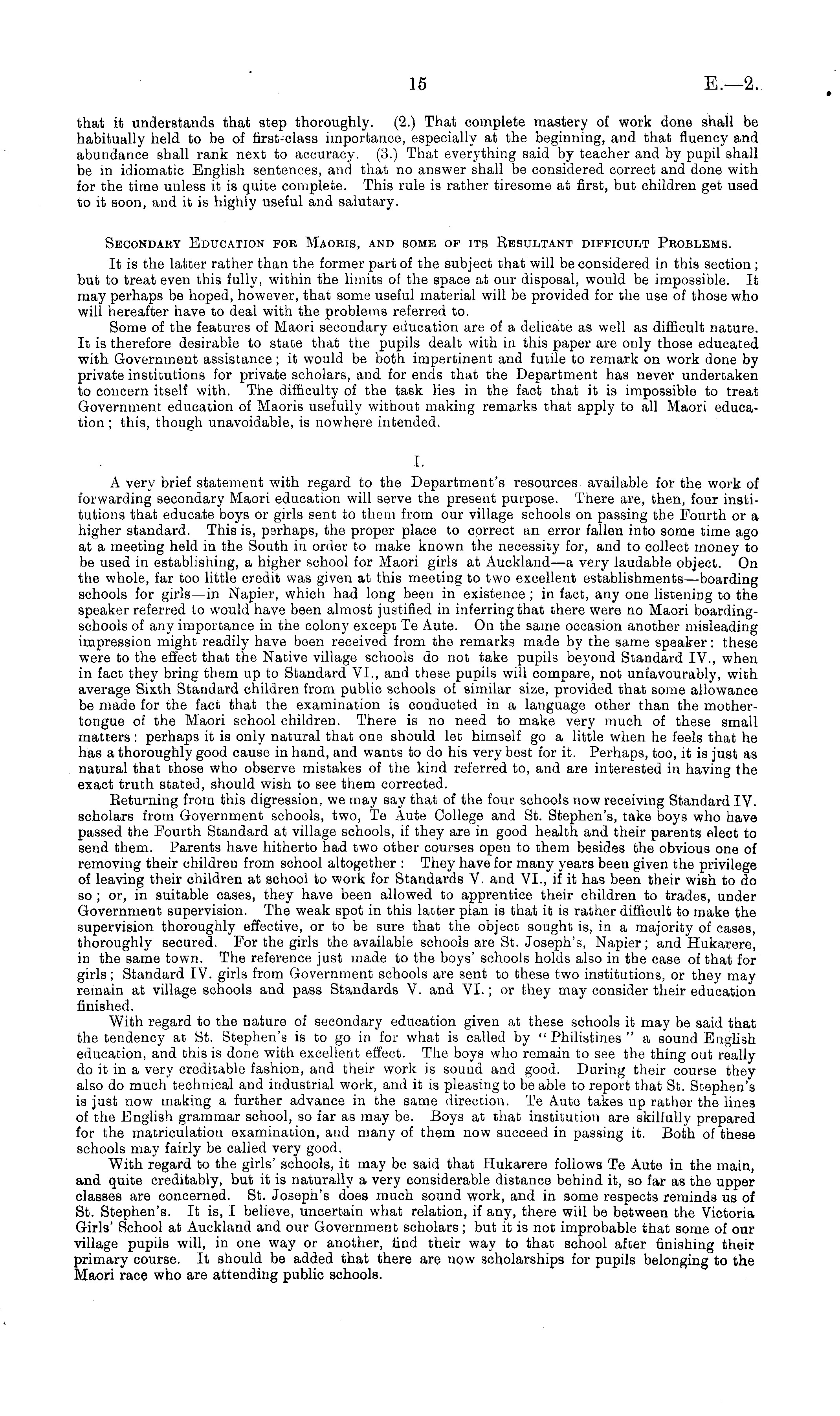 that it understands that step thoroughly. (2.) That complete mastery of work done shall be habitually held to be of first-class importance, especially at the beginning, and that fluency and abundance shall rank next to accuracy. (3.) That everything said by teacher and by pupil shall be in idiomatic English sentences, and that no answer shall be considered correct and done with for the time unless it is quite complete. This rule is rather tiresome at first, but children get used to it soon, and it is highly useful and salutary. Secondary Education for Maoris, and some of its Resultant difficult Problems. It is the latter rather than the former part of the subject that will be considered in this section ; but to treat even this fully, within the limits of the space at our disposal, would be impossible. It may perhaps be hoped, however, that some useful material will be provided for the use of those who will hereafter have to deal with the problems referred to. Some of the features of Maori secondary education are of a delicate as well as difficult nature. It is therefore desirable to state that the pupils dealt with in this paper are only those educated with Government assistance ; it would be both impertinent and futile to remark on work done by private institutions for private scholars, and for ends that the Department has never undertaken to concern itself with. The difficulty of the task lies in the fact that it is impossible to treat Government education of Maoris usefully without making remarks that apply to all Maori education ; this, though unavoidable, is nowhere intended. I. A very brief statement with regard to the Department's resources available for the work of forwarding secondary Maori education will serve the present purpose. There are, then, four institutions that educate boys or girls sent to them from our village schools on passing the Fourth or a higher standard. This is, perhaps, the proper place to correct an error fallen into some time ago at a meeting held in the South in order to make known the necessity for, and to collect money to be used in establishing, a higher school for Maori girls at Auckland—a very laudable object. On the whole, far too little credit was given at this meeting to two excellent establishments—boarding schools for girls —in Napier, which had long been in existence ; in fact, any one listening to the speaker referred to would have been almost justified in inferring that there were no Maori boardingschools of any importance in the colony except Te Aute. On the same occasion another misleading impression might readily have been received from the remarks made by the same speaker: these were to the effect that the Native village schools do not take pupils beyond Standard IV., when in fact they bring them up to Standard VI., and these pupils will compare, not unfavourably, with average Sixth Standard children from public schools of similar size, provided that some allowance be made for the fact that the examination is conducted in a language other than the mothertongue of the Maori school children. There is no need to make very much of these small matters : perhaps it is only natural that one should let himself go a little when he feels that he has a thoroughly good cause in hand, and wants to do his very best for it. Perhaps, too, it is just as natural that those who observe mistakes of the kind referred to, and are interested in having the exact truth stated, should wish to see them corrected. Returning from this digression, we may say that of the four schools now receiving Standard IV. scholars from Government schools, two, Te Aute College and St. Stephen's, take boys who have passed the Fourth Standard at village schools, if they are in good health and their parents elect to send them. Parents have hitherto had two other courses open to them besides the obvious one of removing their children from school altogether : They have for many years been given the privilege of leaving their children at school to work for Standards V. and VI., if it has been their wish to do so ; or, in suitable cases, they have been allowed to apprentice their children to trades, under Government supervision. The weak spot in this latter plan is that it is rather difficult to make the supervision thoroughly effective, or to be sure that the object sought is, in a majority of cases, thoroughly secured. For the girls the available schools are St. Joseph's, Napier; and Hukarere, in the same town. The reference just made to the boys' schools holds also in the case of that for girls; Standard IV. girls from Government schools are sent to these two institutions, or they may remain at village schools and pass Standards V. and VI. ; or they may consider their education finished. With regard to the nature of secondary education given at these schools it may be said that the tendency at St. Stephen's is to go in for what is called by "Philistines" a sound English education, and this is done with excellent effect. The boys who remain to see the thing out really do it in a very creditable fashion, and their work is sound and good. During their course they also do much technical and industrial work, and it is pleasing to be able to report that St. Stephen's is just now making a further advance in the same direction. Te Aute takes up rather the lines of the English grammar school, so far as may be. Boys at that institution are skilfully prepared for the matriculation examination, and many of them now succeed in passing it. Both of these schools may fairly be called very good. With regard to the girls' schools, it may be said that Hukarere follows Te Aute in the main, and quite creditably, but it is naturally a very considerable distance behind it, so far as the upper classes are concerned. St. Joseph's does much sound work, and in some respects reminds us of St. Stephen's. It is, I believe, uncertain what relation, if any, there will be between the Victoria Girls' School at Au